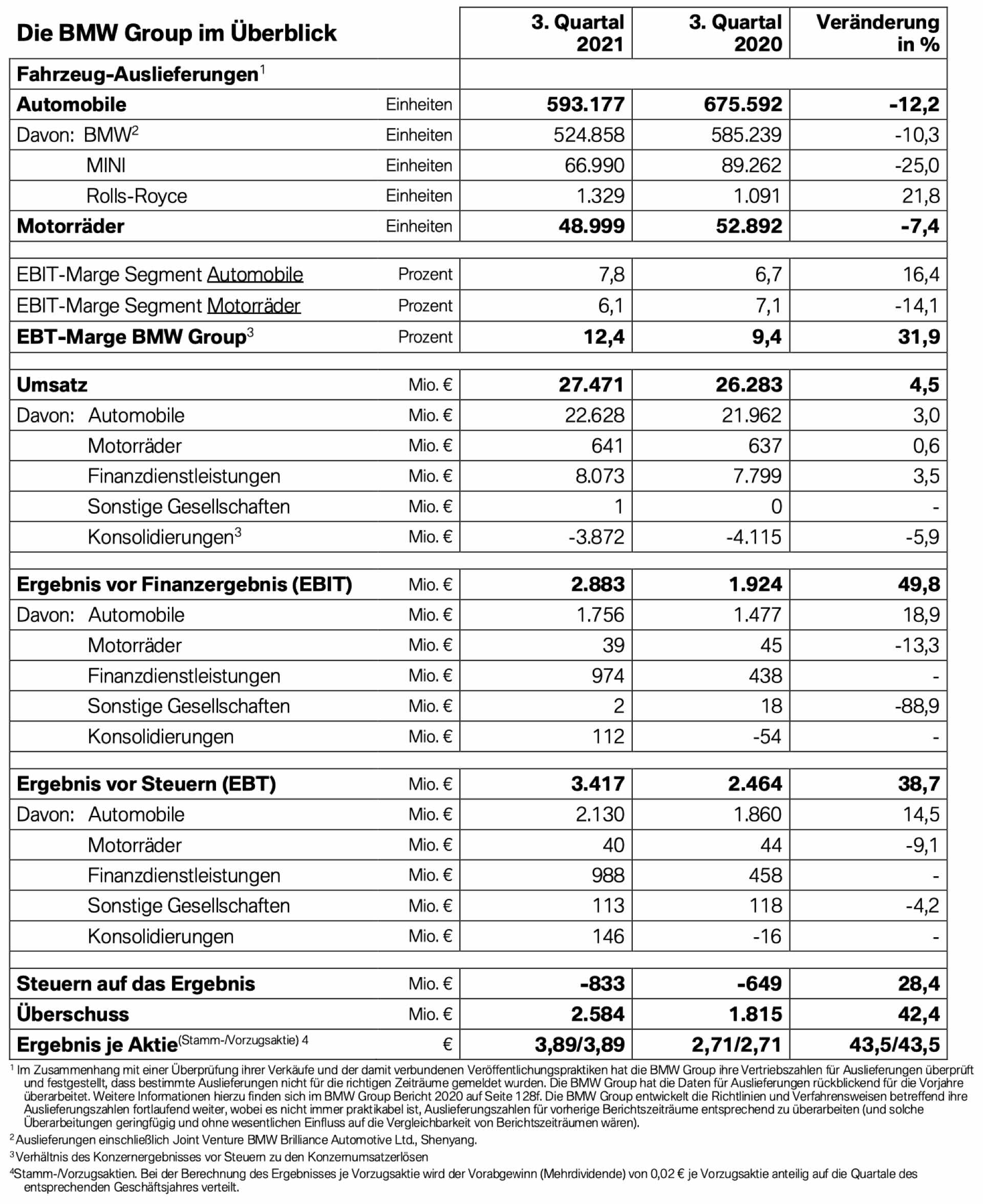 Gleich nachdem die Autoindustrie die große Verunsicherung in Folge der Corona-Pandemie hinter sich lassen konnte, folgt mit der Chip- und Halbleiter-Krise das nächste große Problem. Die BMW Group zeigt mit ihren Zahlen im Quartalsbericht für Q3 2021 allerdings, dass sie sich von den schwierigen Rahmenbedingungen zumindest im Moment nicht ausbremsen lässt: Nie zuvor konnte die BMW Group in einem dritten Quartal derart hohe Umsatzerlöse, ein derart hohes Konzernergebnis oder einen derart hohen Konzernüberschuss erzielen. Die neuen Bestwerte gehen wesentlich auf das Konto der niedrigeren Rabatte und damit besseren Preisdurchsetzung bei Neuwagen sowie der höheren Preisstabilität bei Gebrauchtwagen und Leasing-Rückläufern, denn beide Faktoren zahlen wesentlich auf die finanzielle Performance des Unternehmens ein. Greifbar wird die starke Performance anhand der EBIT-Marge, die sich im Segment Automobile seit Jahresbeginn auf 11,3 Prozent beläuft.