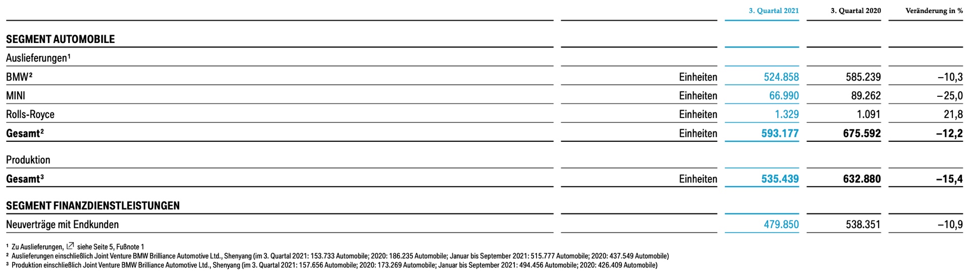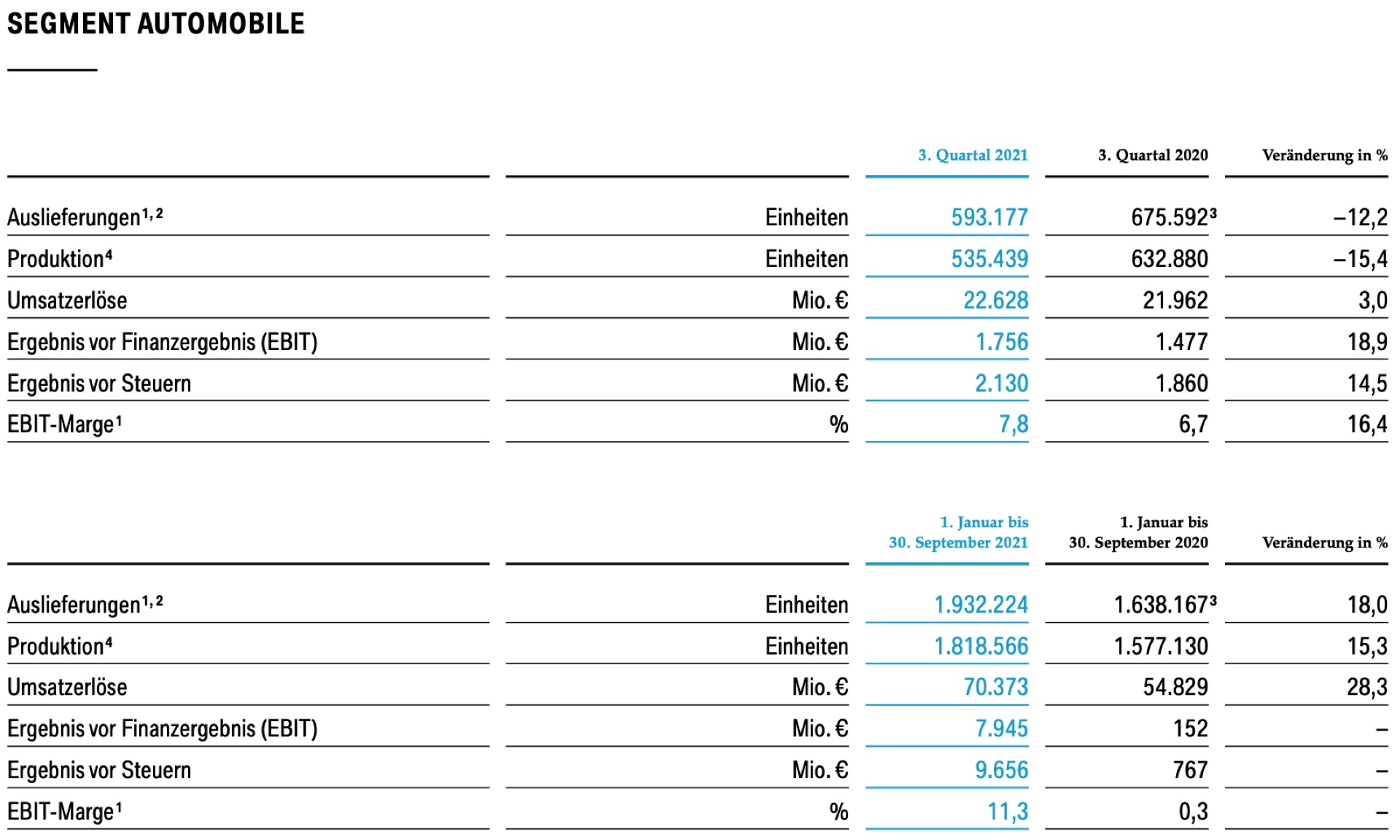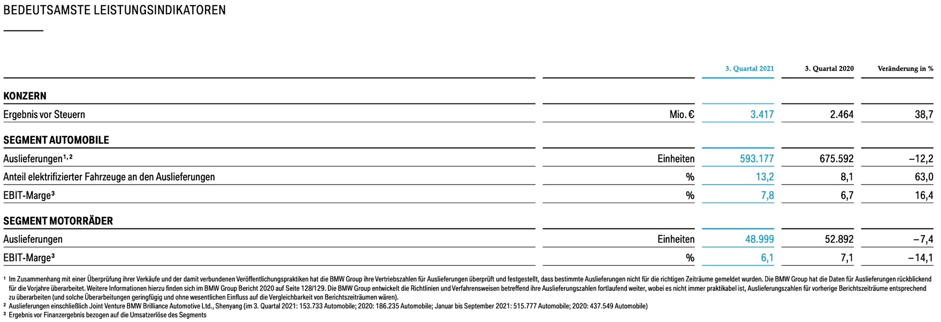 Verlassen können sich die Münchner dabei auf eine anhaltend hohe Nachfrage nach ihren Produkten, auch wenn die tatsächlich verkauften und ausgelieferten Stückzahlen in Q3 2021 aufgrund der mangelnden Verfügbarkeit unter dem Vorjahr liegen. Über alle Antriebsarten hinweg entspricht ein weltweiter Absatz von 593.177 Einheiten in Q3 2021 einem Rückgang um 12,2 Prozent, aufgrund des starken ersten Halbjahres liegt der Wert für das bisherige Gesamtjahr aber deutliche 18,0 Prozent über dem Vorjahreszeitraum. Zu einem wesentlichen Treiber haben sich dabei die Elektroautos und Plug-in-Hybride entwickelt, deren Absatz seit Jahresbeginn von 116.400 auf 231.575 Einheiten beinahe verdoppelt werden konnte.