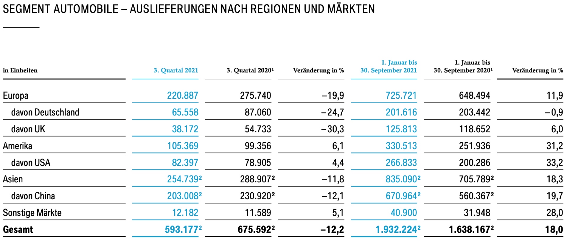 Beim Blick auf die Regionen und Märkte war Q3 2021 vor allem in Europa und Asien von der Chip- und Halbleiter-Krise betroffen, in Nordamerika konnte der Absatz im Vergleich zum Vorjahr trotz allem leicht gesteigert werden. Trotz eines Rückgangs um 12,1 Prozent im dritten Quartal bleibt China mit großem Abstand wichtigster Einzelmarkt, allein in Q3 2021 konnten hier mehr als 200.000 Einheiten abgesetzt werden.