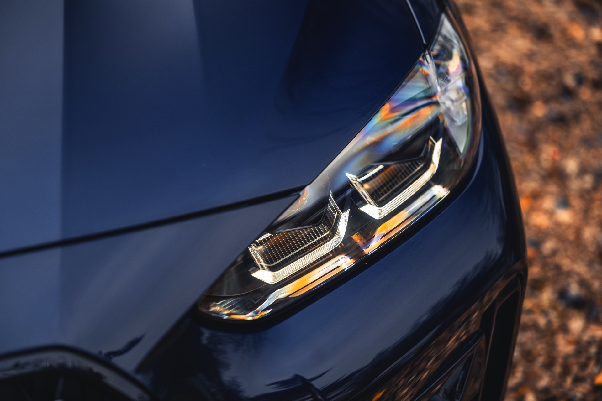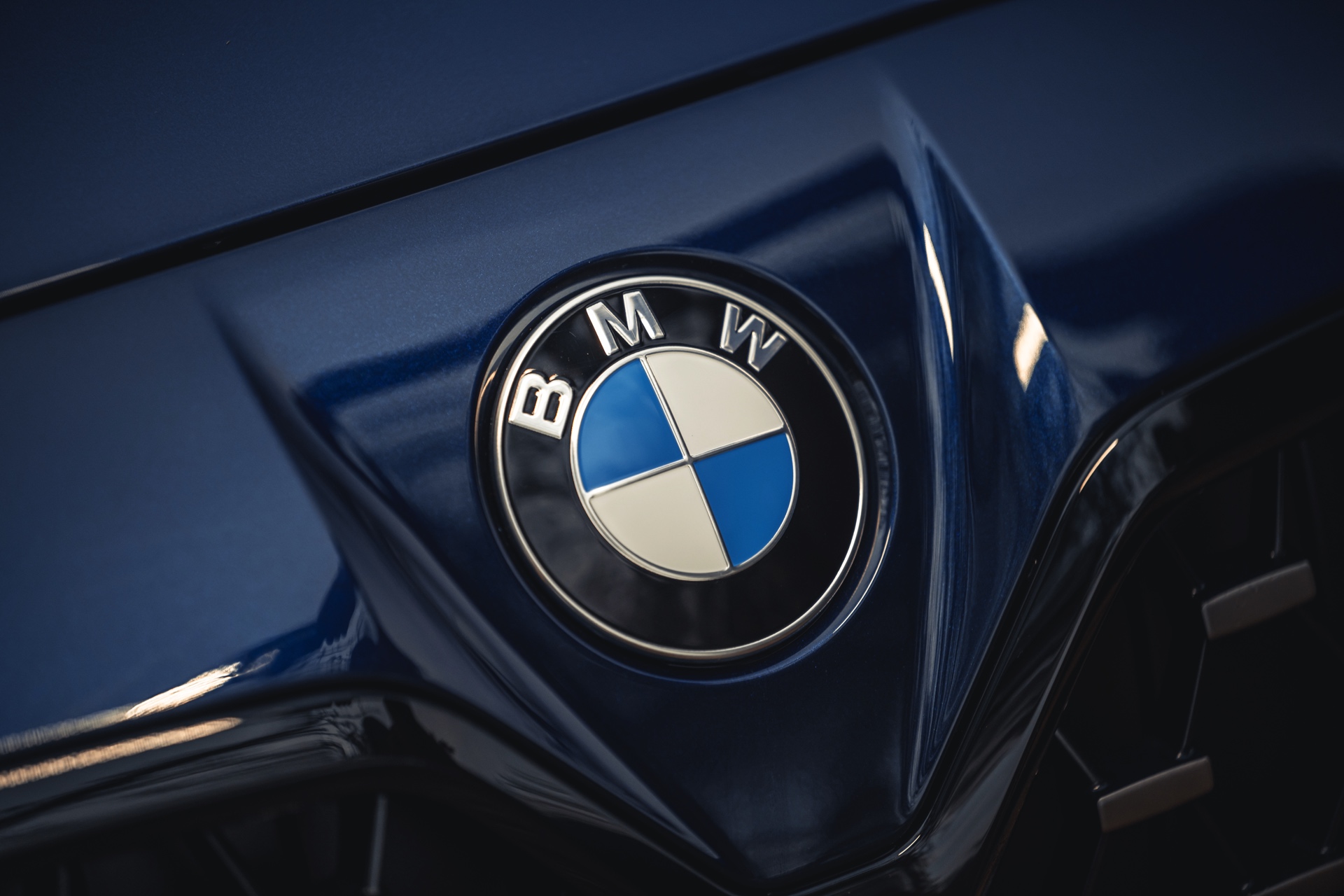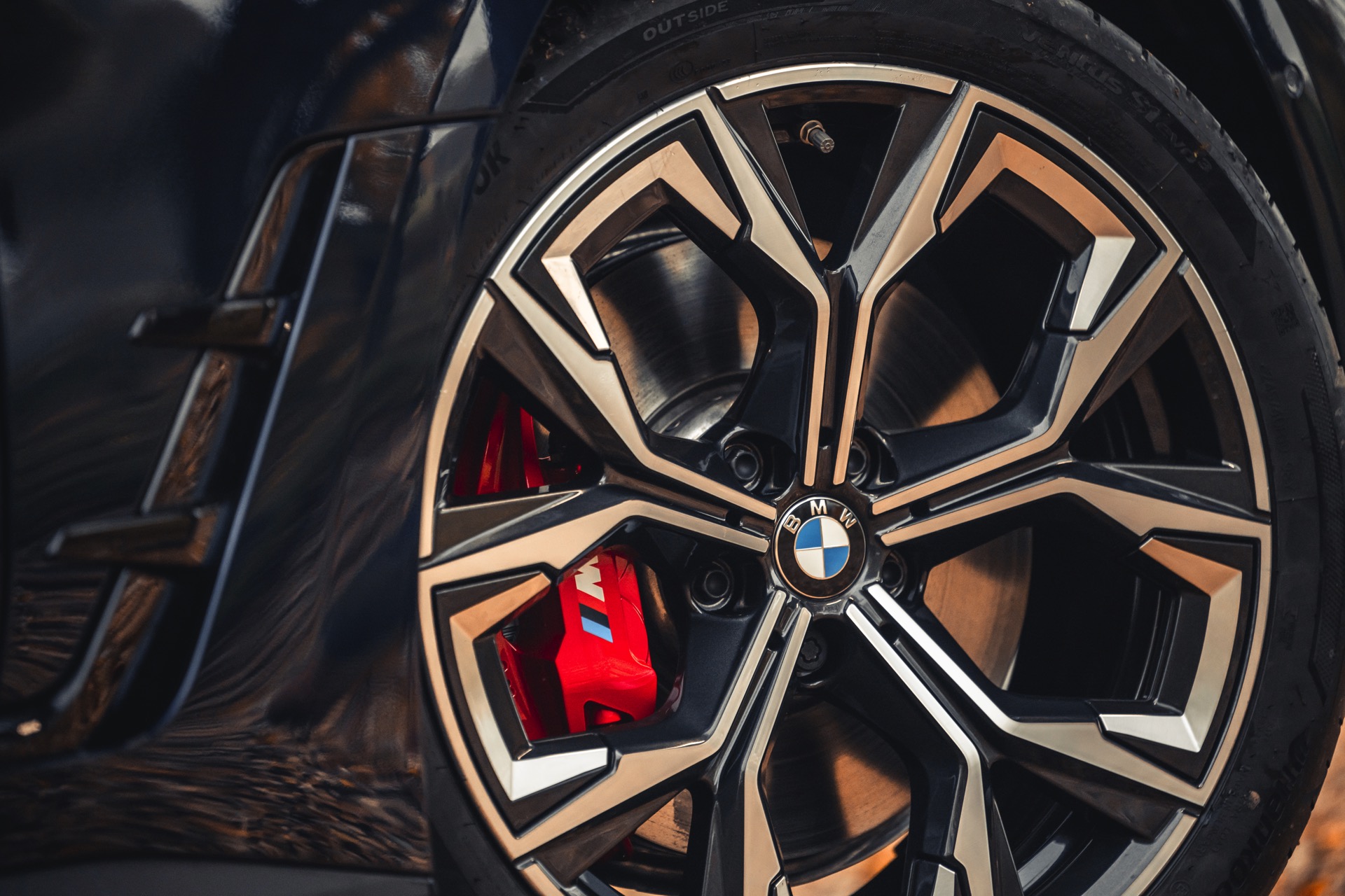 Dank der BMW M Hochglanz Shadow Line mit erweiterten Umfängen ist die Einfassung der großen Doppel-Niere an der Front in Schwarz gehalten, was sie gerade in Verbindung mit eher dunklen Außenfarben wie Tansanitblau weniger prominent in Szene setzt. Ebenfalls etwas dunkler als gewohnt sind die M Leuchten Shadow Line mit schwarzen statt glänzenden Chrom-Elementen. Hinter den 19 Zoll großen Aero-Felgen, die eine markante Optik mit besonders geringem Luftwiderstand kombinieren, sind die optional in Rot lackierten Bremssättel der Bremsanlage erkennbar.