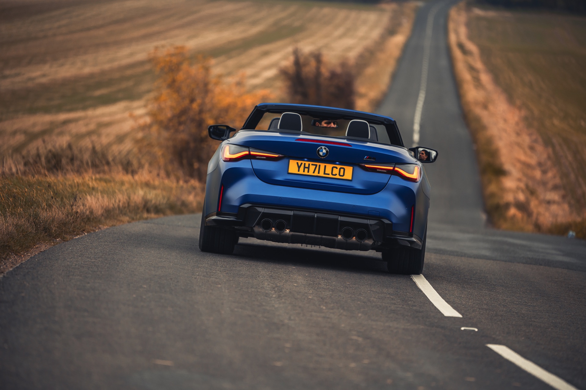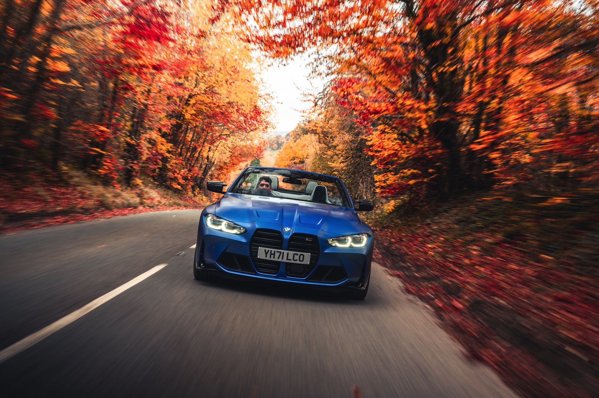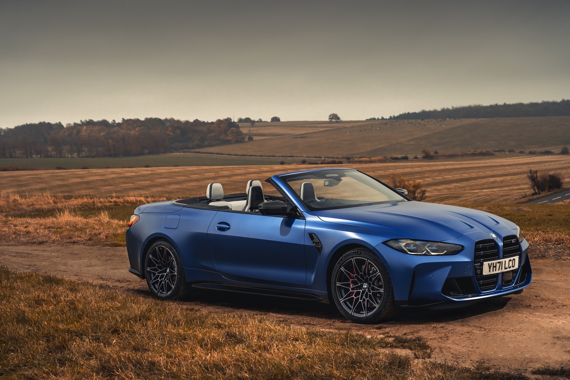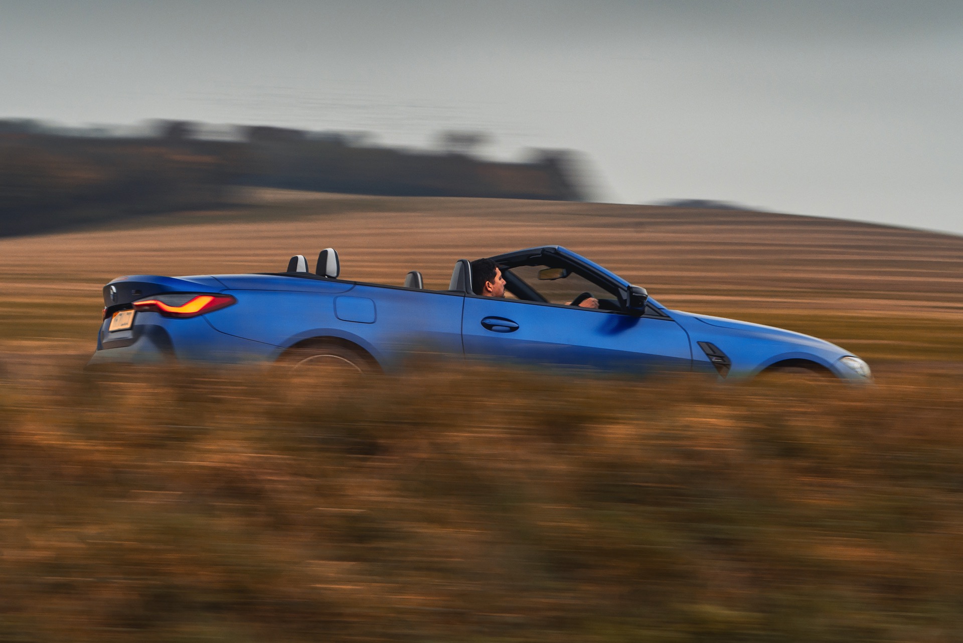 Wer an britisches Wetter im November denkt, dürfte sich dabei nur selten ans Steuer eines offenen BMW M4 Cabrio (G83) wünschen. Aktuelle Fotos von der Insel zeigen aber, dass Hartgesottene auch bei grauem Wetter das Dach öffnen und sich so ein noch intensiveres Fahrerlebnis bescheren – dank Sitzheizung, Lenkradheizung und Nackenwärmer muss man schließlich auch bei geöffnetem Verdeck nicht frieren und für etwas Farbe in trüber Umgebung hat bereits die Lackiererei im Werk Dingolfing gesorgt: Wenn der Himmel schon nicht blau ist, übernimmt eben die matte Individual-Lackierung in Frozen Portimao Blue diese Aufgabe.