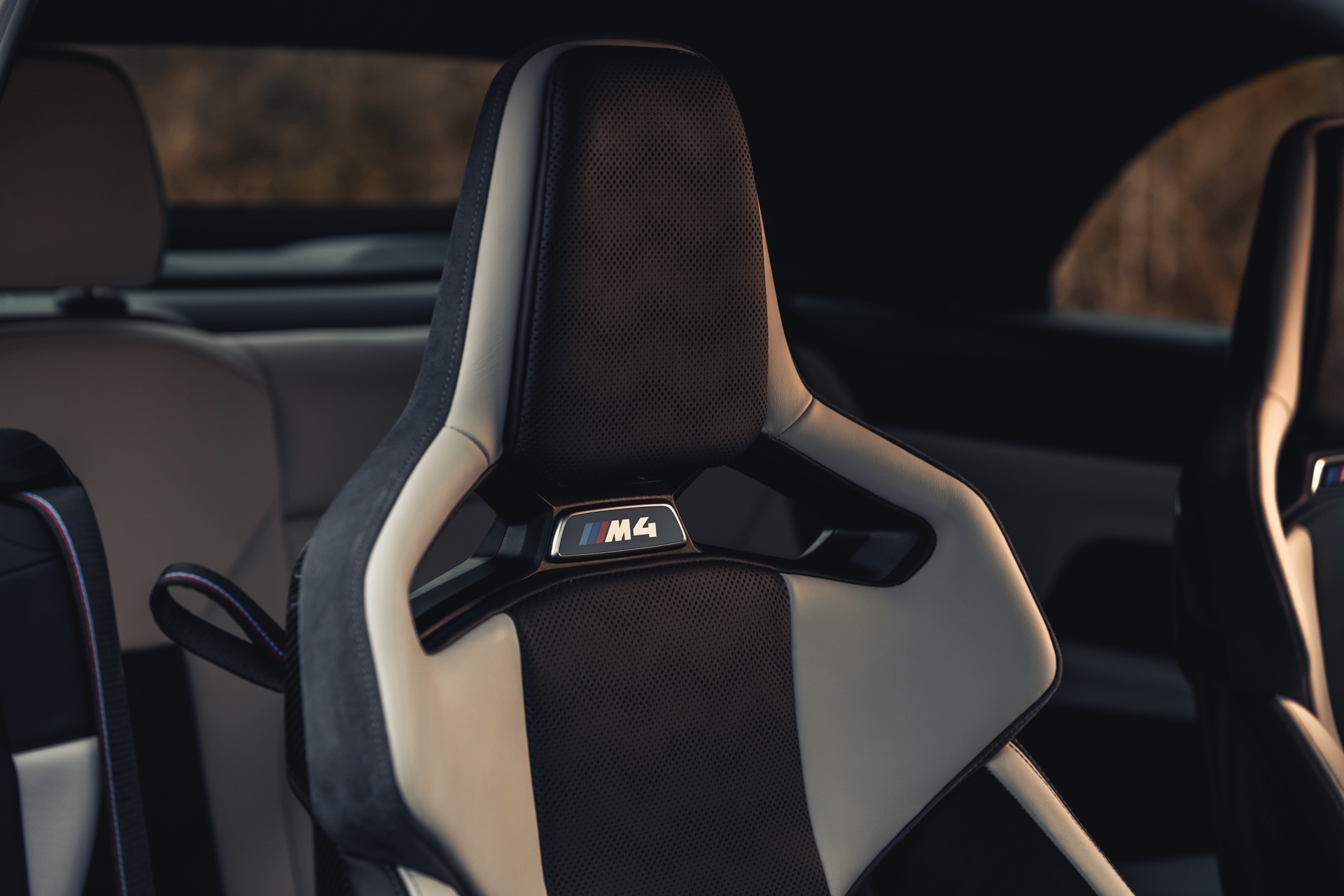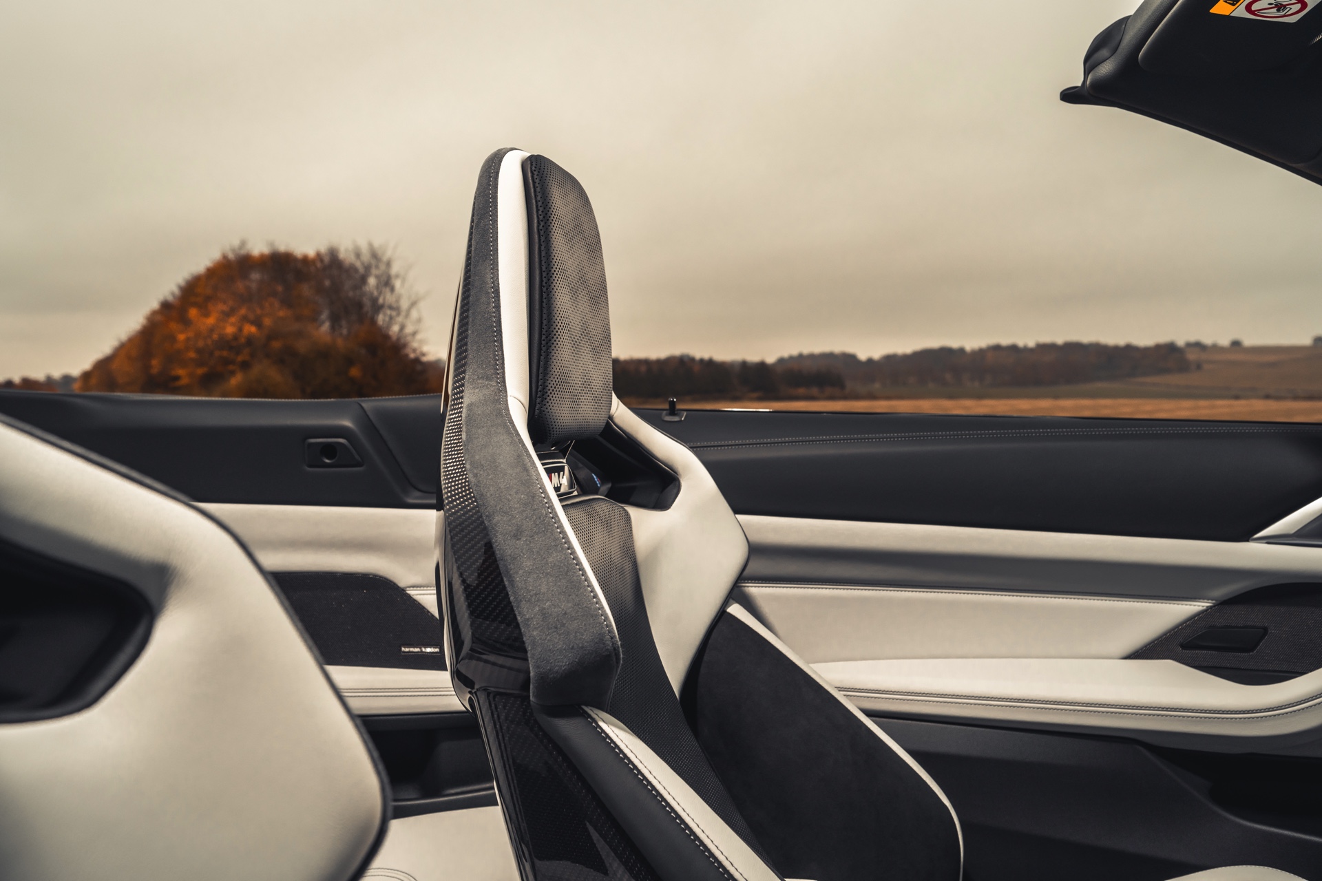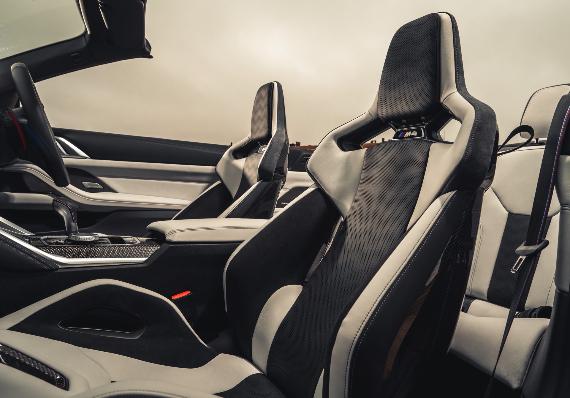 Auf den Fotos vom Innenraum erhalten wir einen Eindruck von der Volllederausstattung Merino in der Bicolor-Ausführung Silverstone Schwarz, vor allem sehen wir aber auch die optionalen M Carbon Schalensitze. Diese bringen nicht nur optisch mehr Rennsport-Flair in den offenen BMW M4, sie haben auch ein ausgesprochen zupackendes Wesen. Einziger Haken für Cabrio-Fans: Das Leichtbau-Konzept der Schalensitze ist nicht mit der Installation eines Nackenwärmers vereinbar, Cabrio-Fans müssen sich in dieser Hinsicht also zwischen Sportlichkeit und Komfort entscheiden.