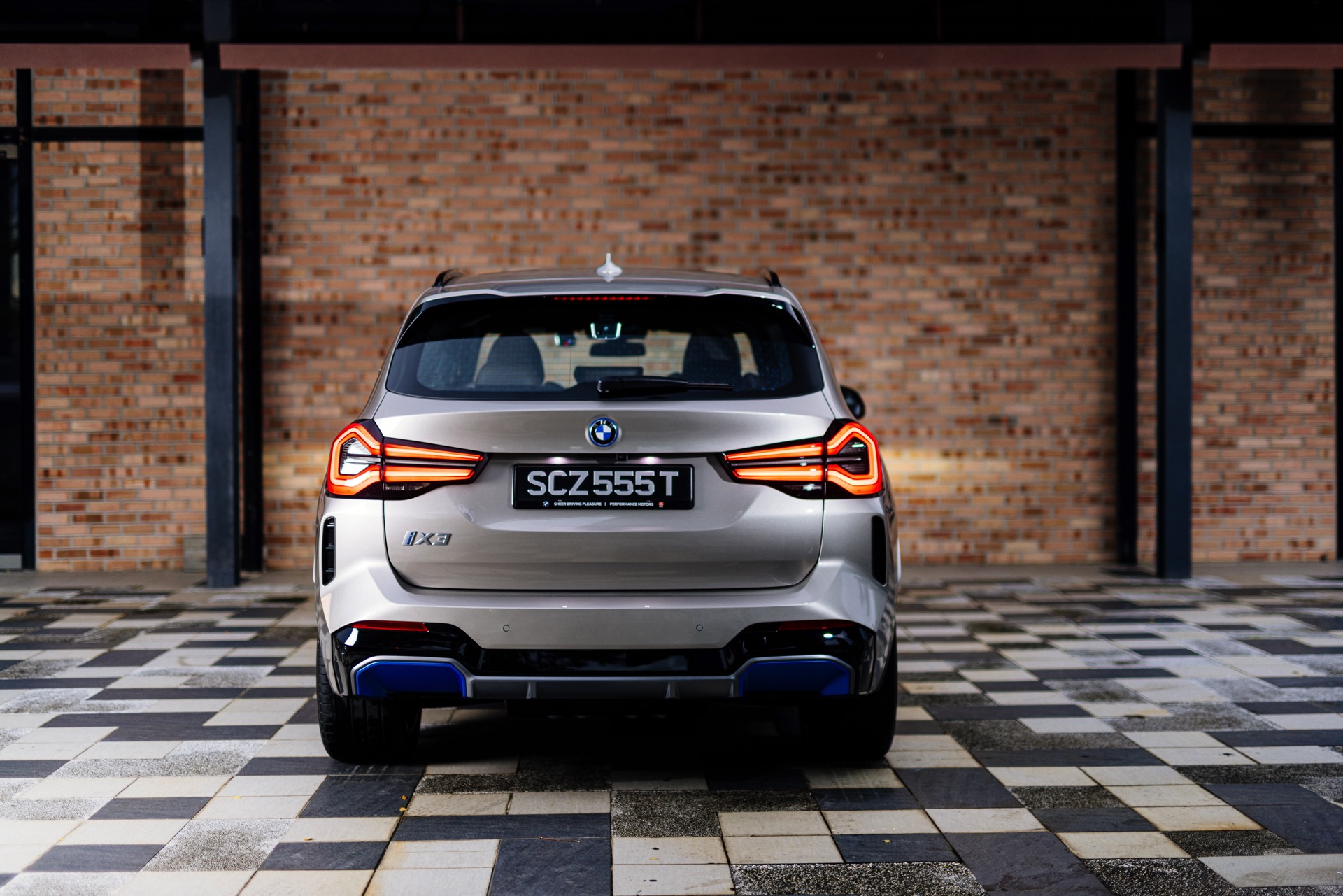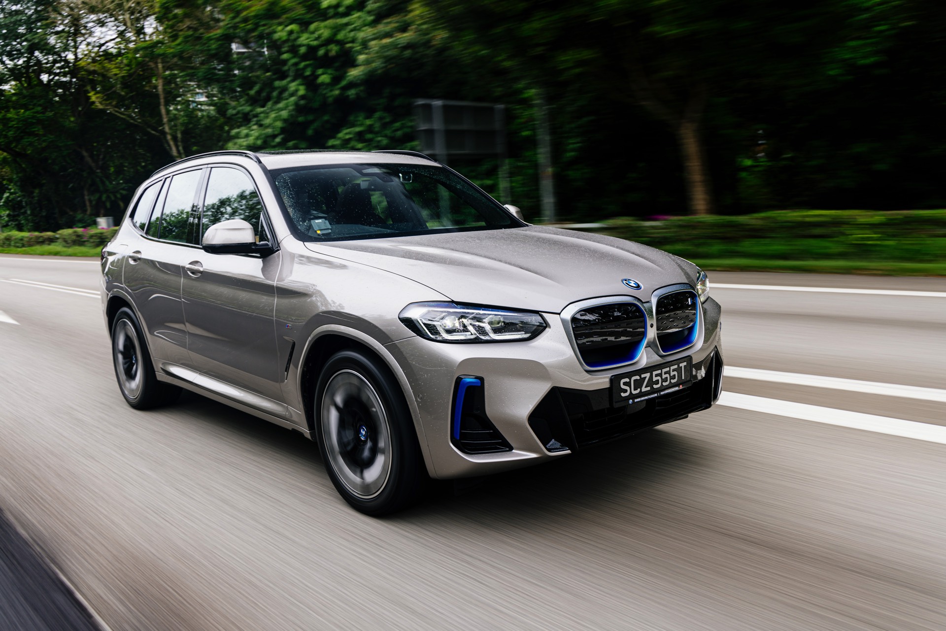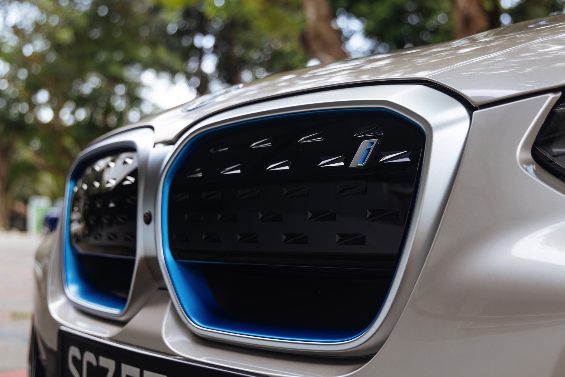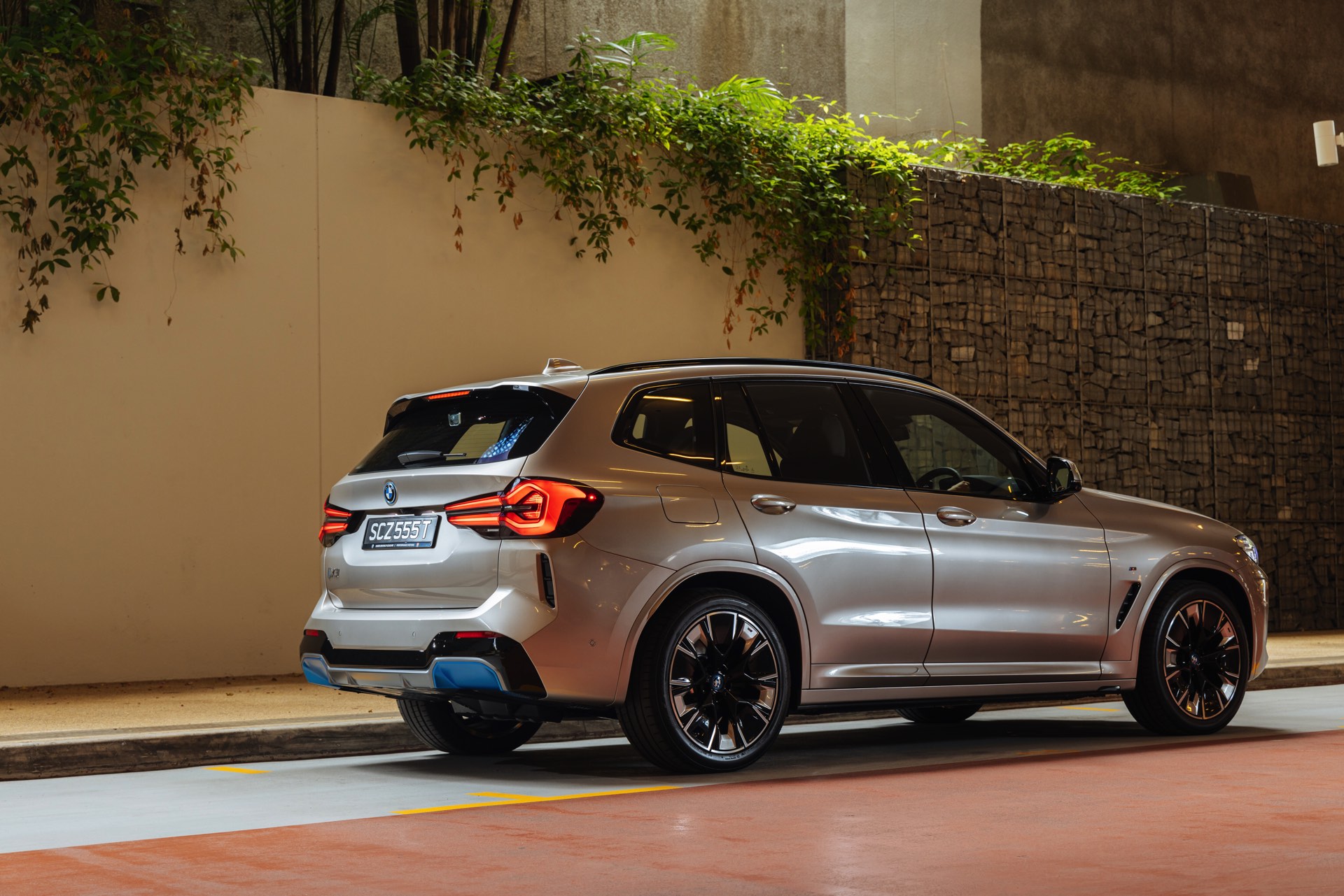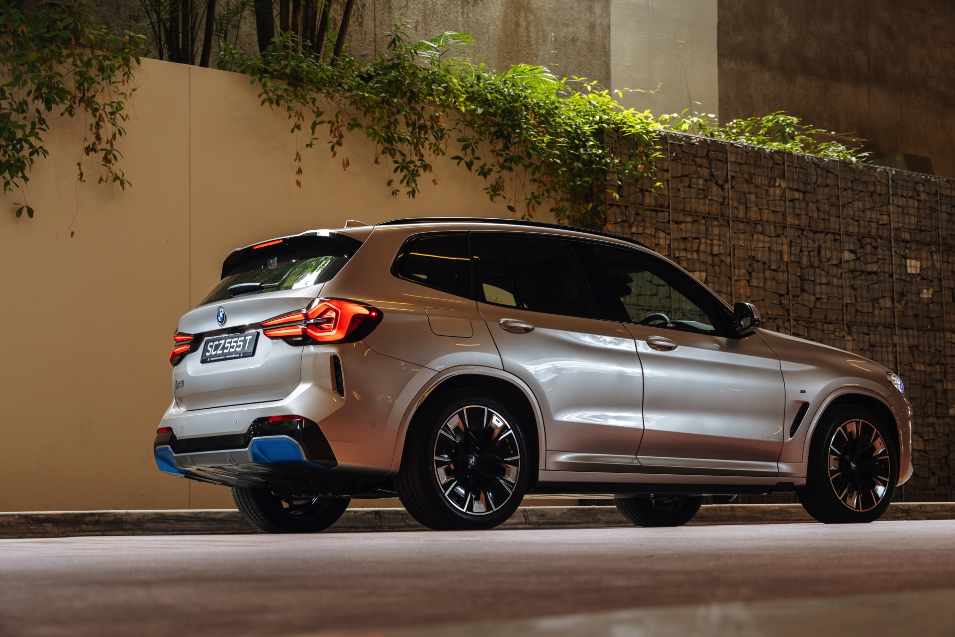 Das BMW iX3 Facelift (2021) ist nun auch in Singapur angekommen, was uns eine ganze Serie neuer Fotos vom aufgefrischten Elektro-X3 beschert. Auf den neuen Bildern aus dem südostasiatischen Stadtstaat sehen wir den aufgefrischten BMW iX3 in Kaschmirsilber und mit den optionalen Akzenten in BMW i Blau, die deutlich auf den Elektroantrieb hinweisen. An der Front stehen dabei die Aero-Elemente in den seitlichen Lufteinlässen unterhalb der Scheinwerfer im Mittelpunkt, außerdem ist der innere Rand der Niereneinfassung im markanten Blau gehalten. Am Heck werden die äußeren Bereiche des Diffusors zusätzlich betont: Genau dort, wo bei einem konventionell angetriebenen BMW X3 Facelift (G01 LCI) die Endrohre zu sehen sind, gibt es beim iX3 nur Aerodynamik-Elemente.