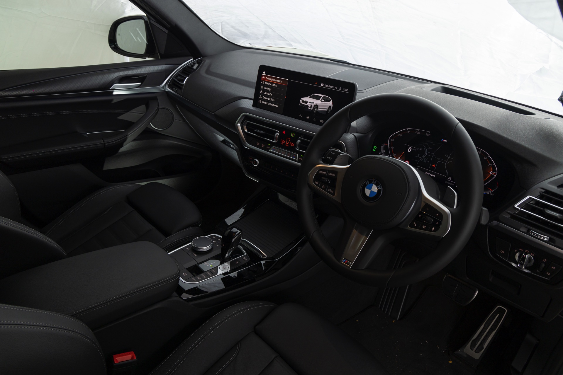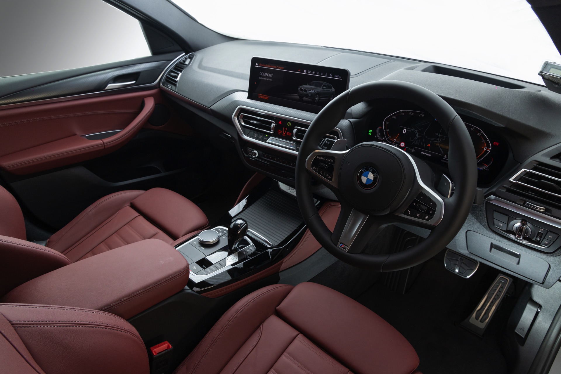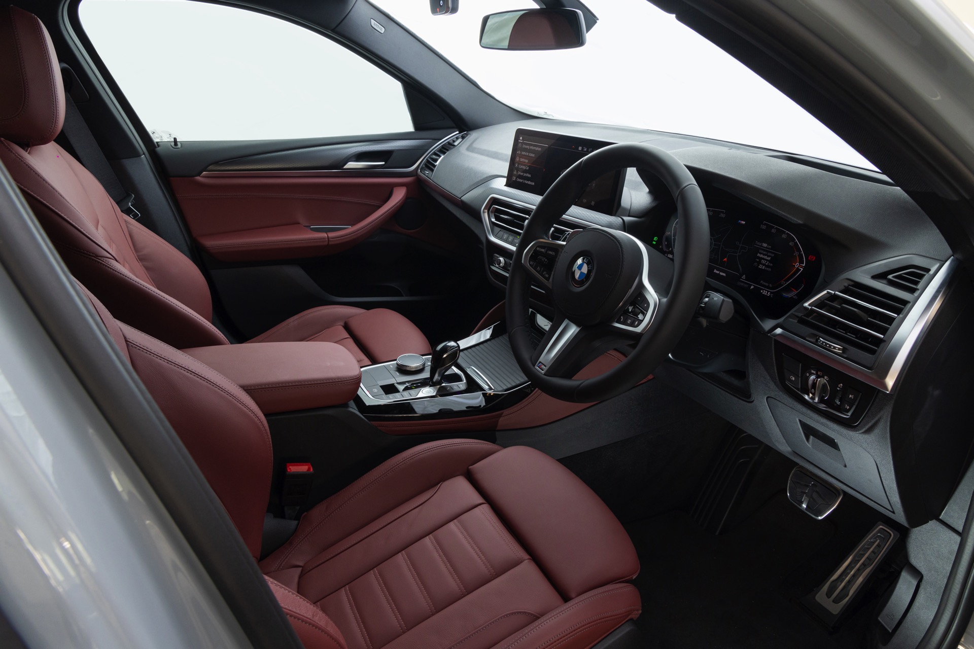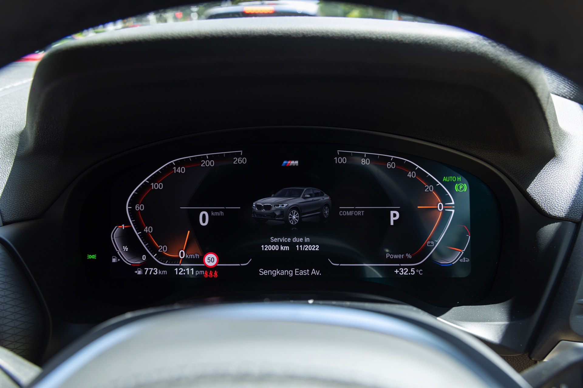 Im Innenraum trägt das in Singapur fotografierte BMW X4 Facelift die Lederausstattung Vernasca in Tacorarot mit Dekorsteppung. Aufgrund des Linksverkehrs in der ehemaligen britischen Kolonie ist das gezeigte Fahrzeug natürlich ein Rechtslenker, aber abgesehen vom praktisch gespiegelten Armaturenbrett-Layout ergeben sich hieraus keine sichtbaren Unterschiede.