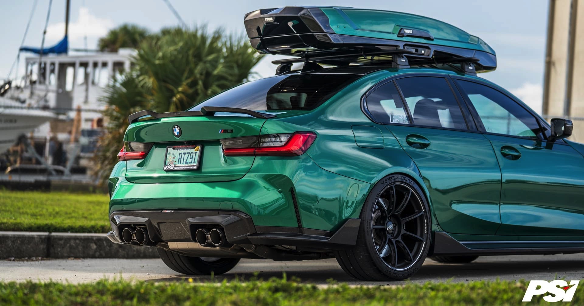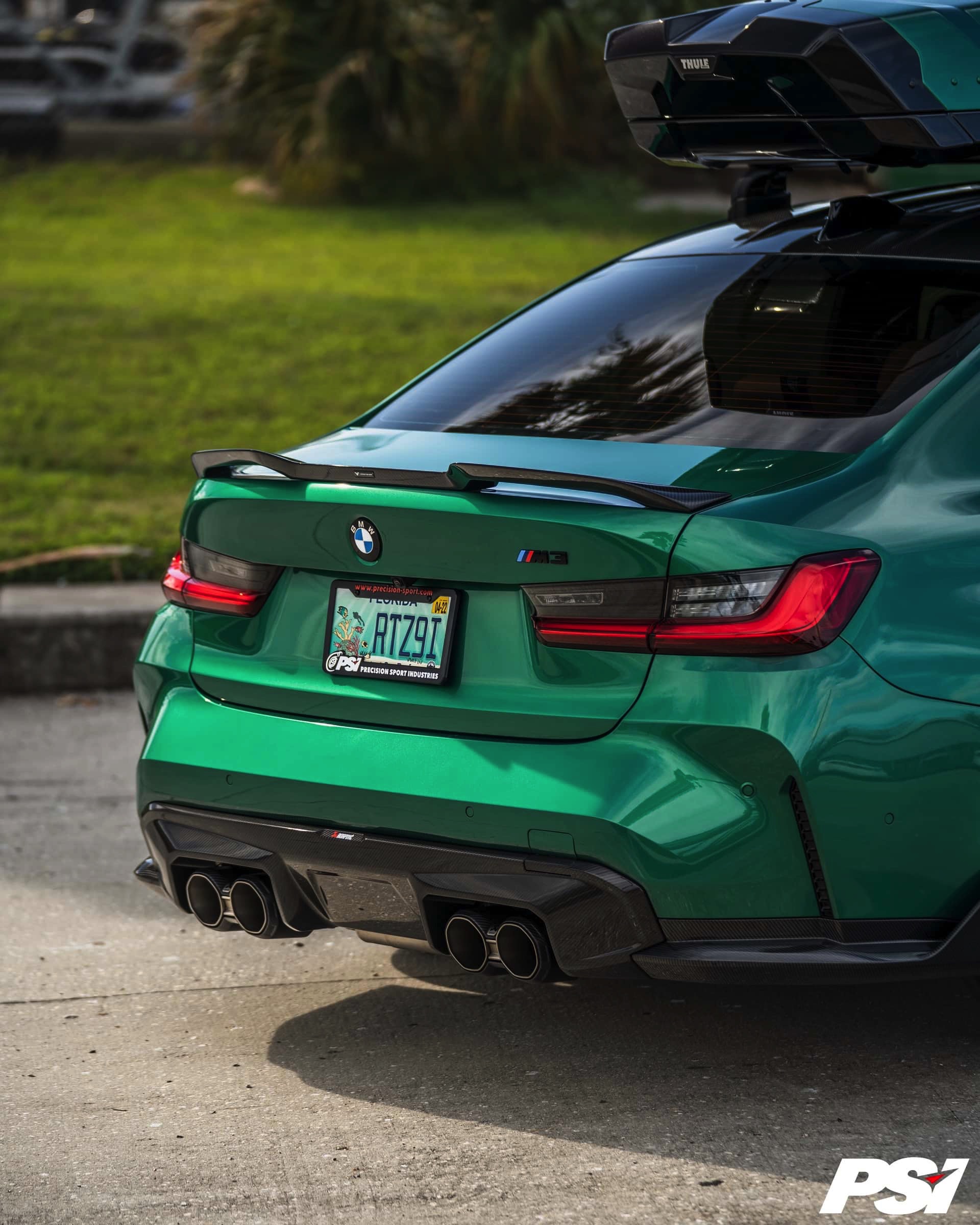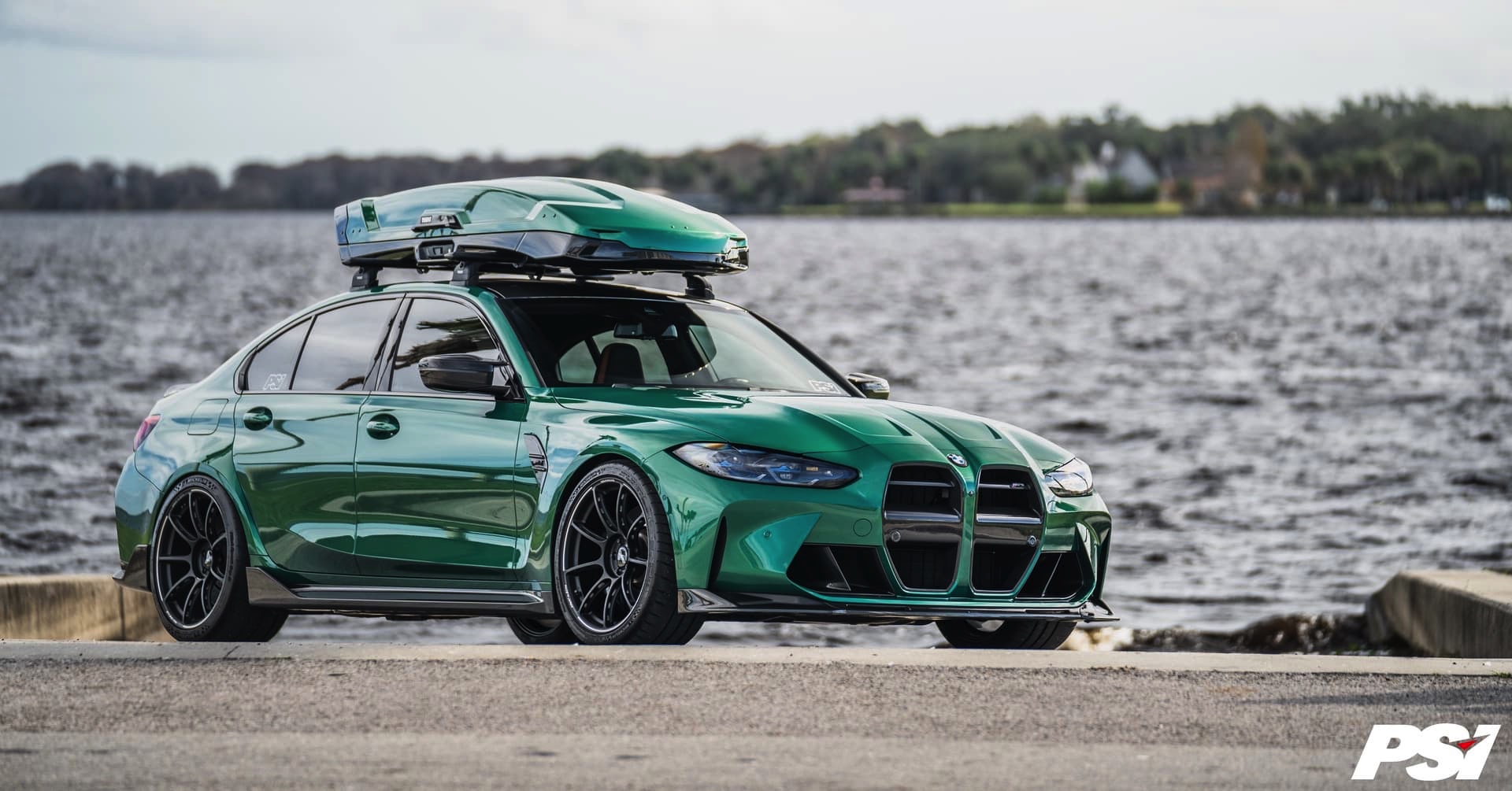 Wer nicht auf den BMW M3 Touring (G81) warten will, kann natürlich auch mit der Limousine einiges transportieren: Die aktuellen Fotos von Precision Sport Industries zeigen dabei die Option des zusätzlichen Stauraums zum Nachrüsten in Form einer Dachbox, die dank Lackierung in der Wagenfarbe Isle of Man Grün zum exklusiven Gesamtauftritt beiträgt.