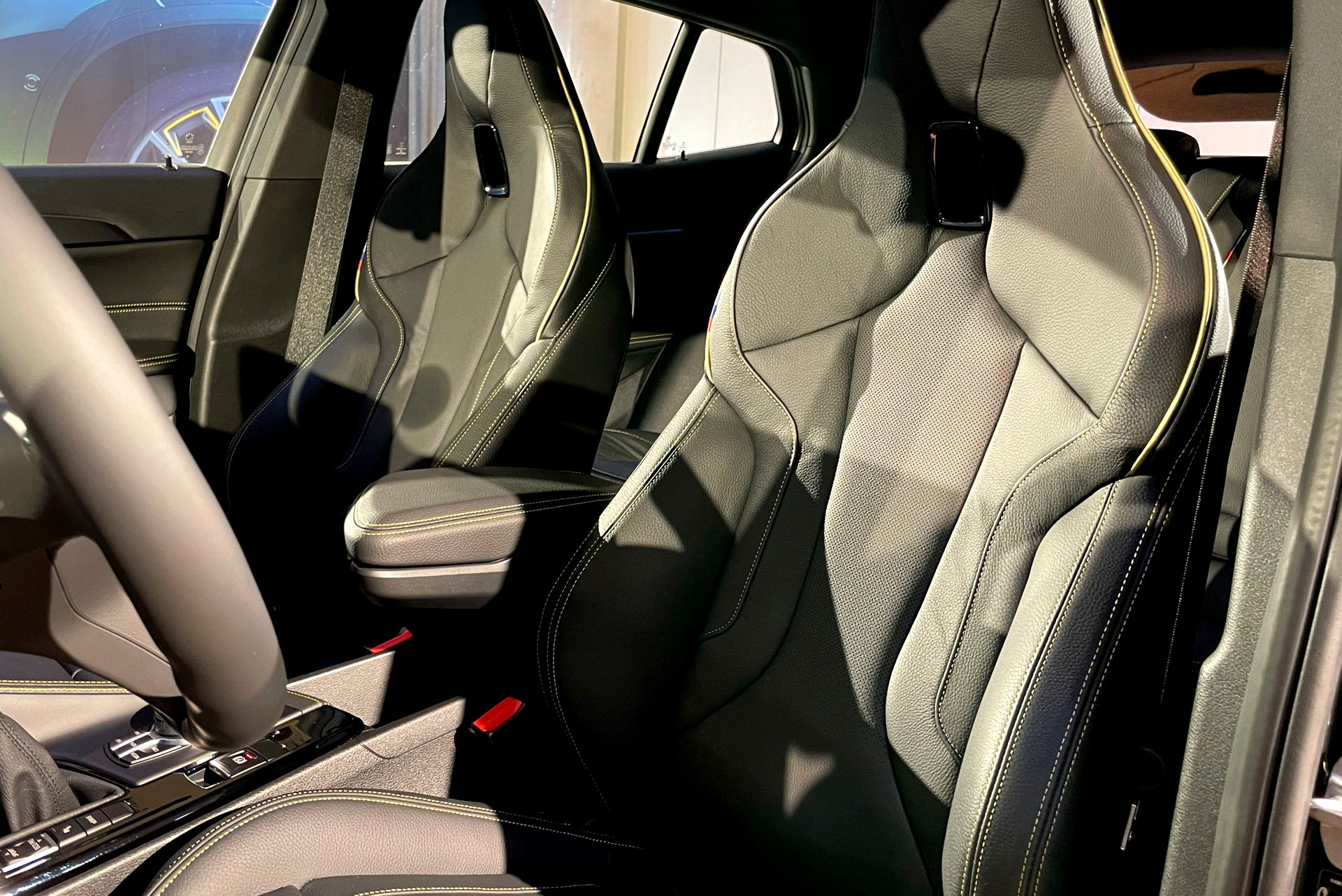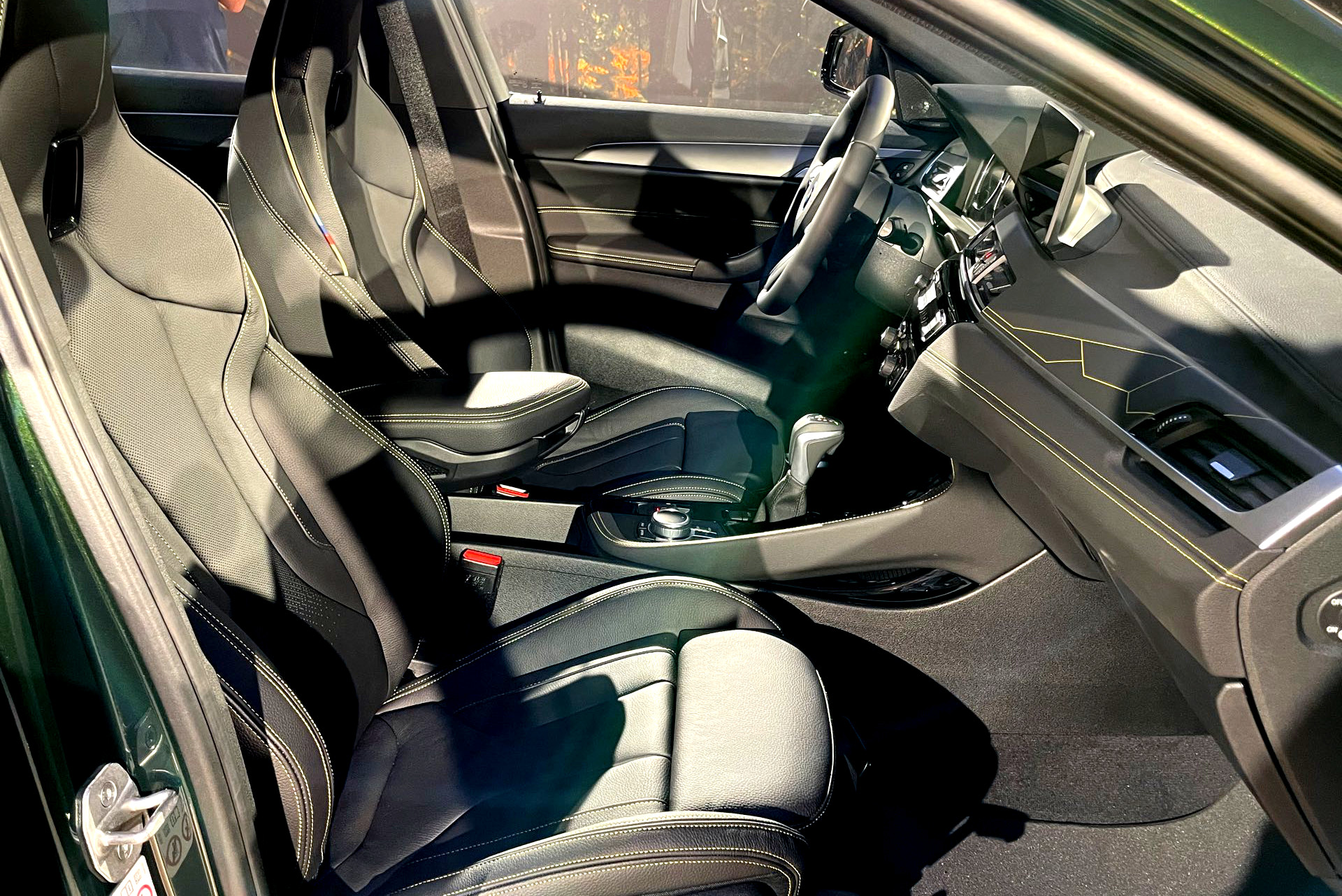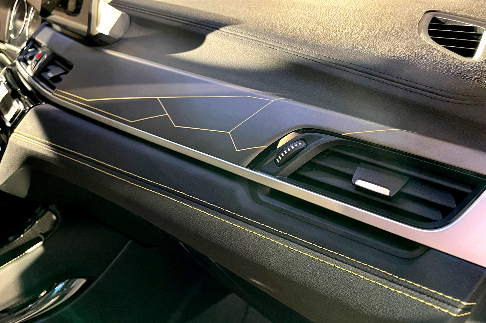 Das Spiel mit goldenen Akzenten setzt sich auch im Innenraum der BMW X2 Goldplay Edition fort: Eine große goldene Edition-Plakette auf den Einstiegsleisten, Kontrastnähte an den Sitzen und goldene Dekor-Beklebung auf den Interieurleisten greifen das Thema des Sondermodells immer wieder auf:
