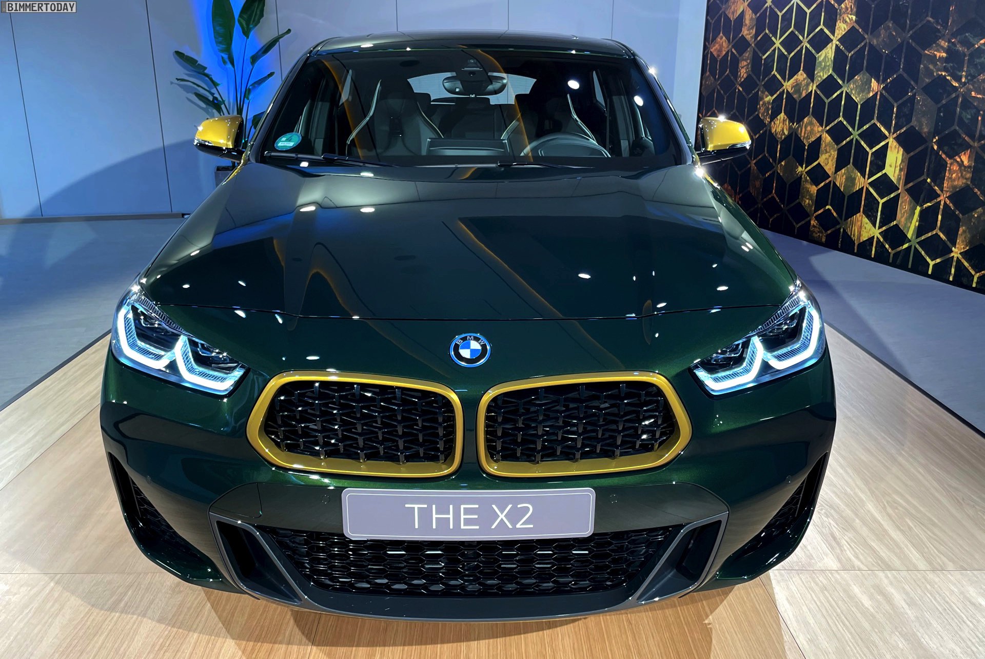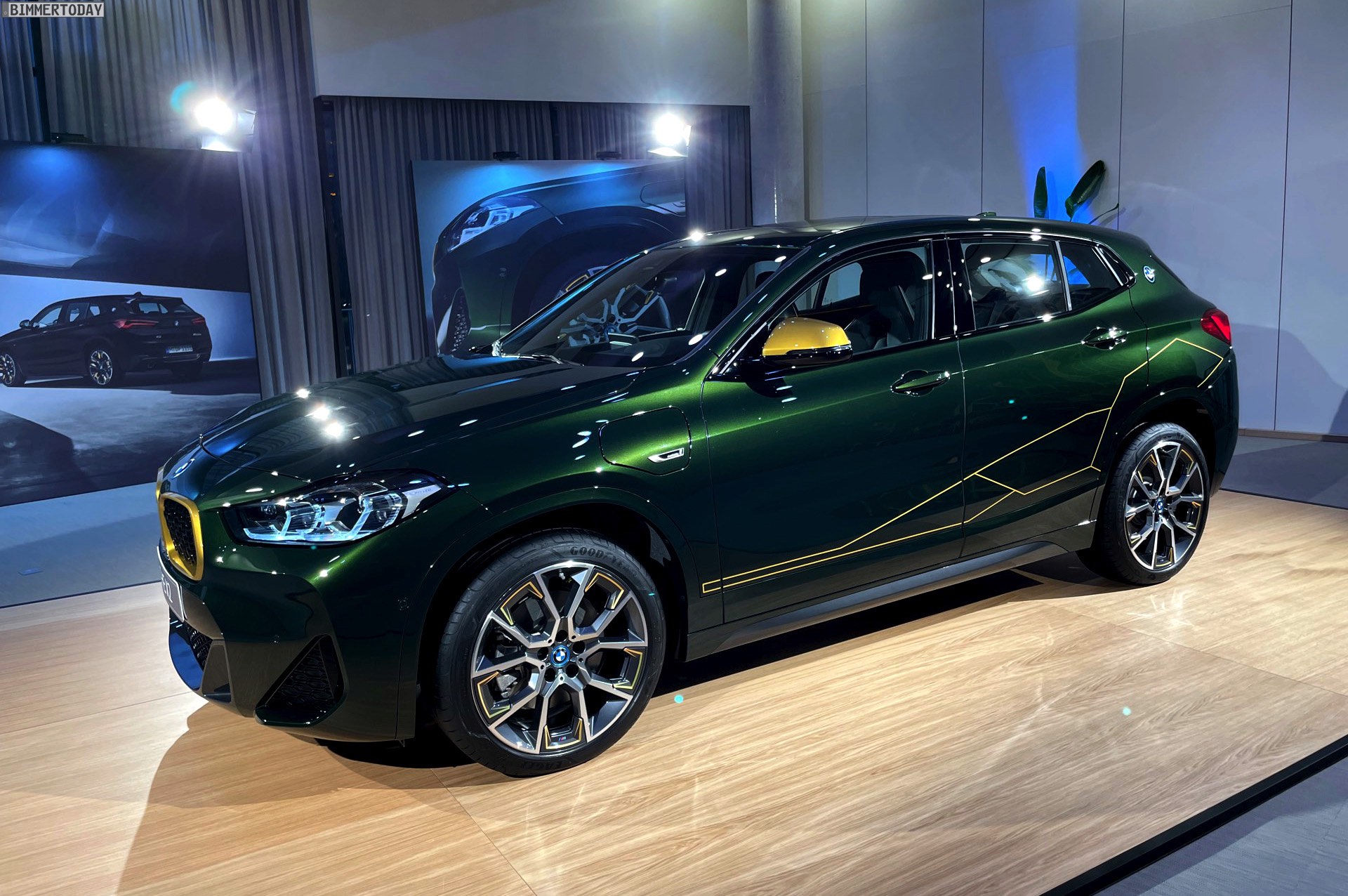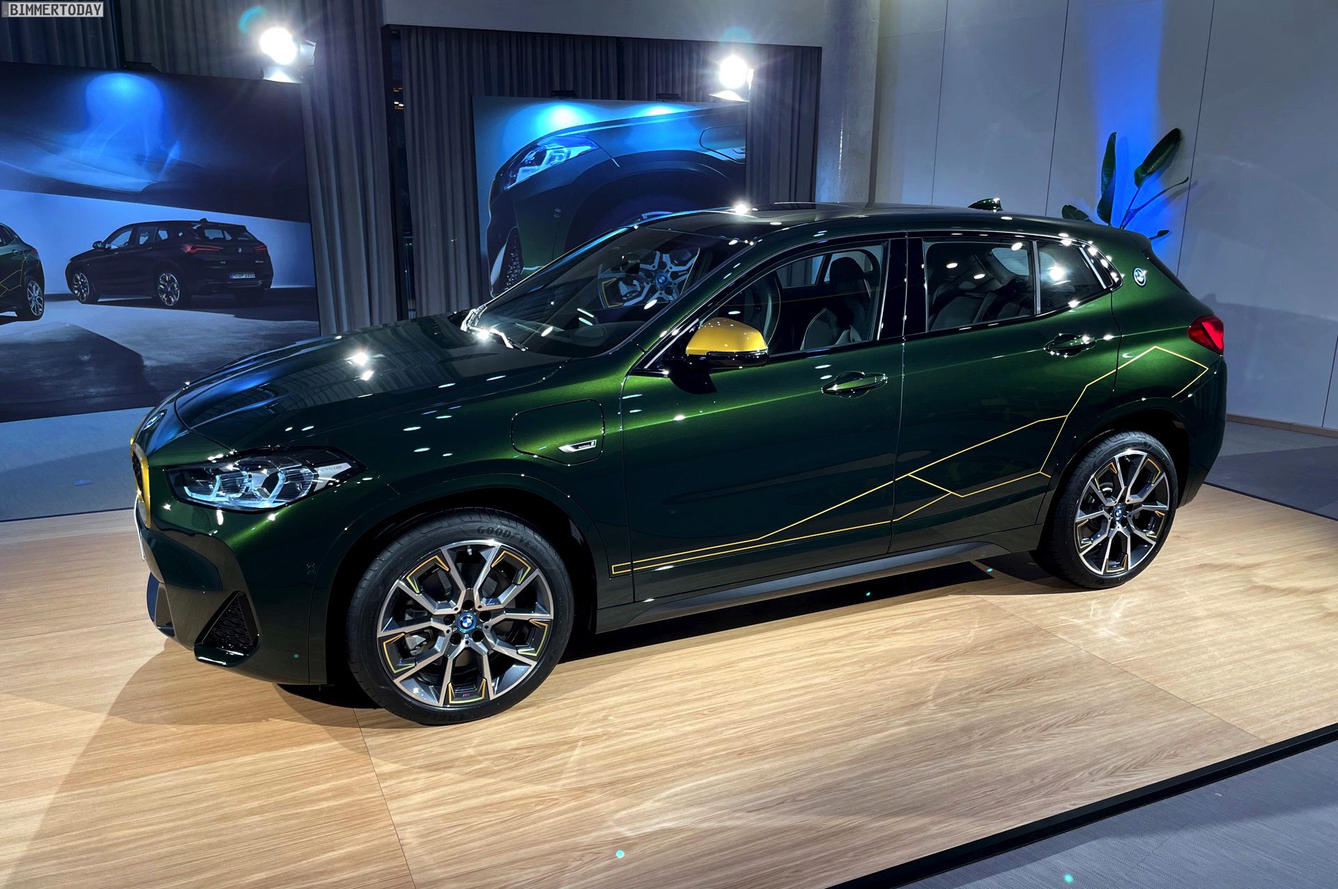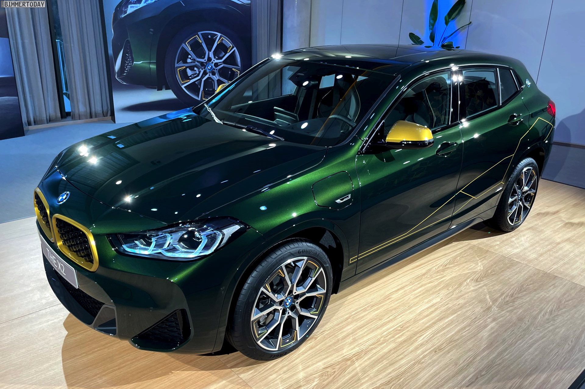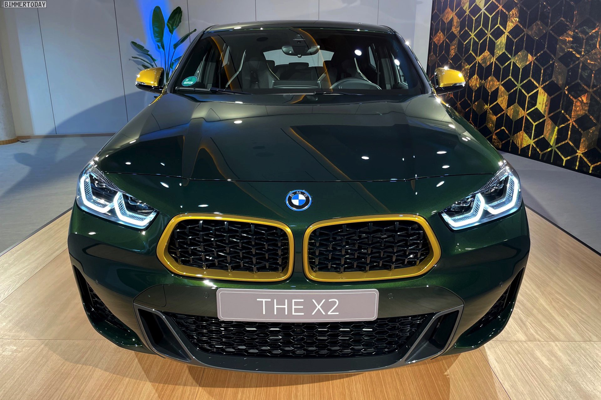 Wenige Tage nach der Vorstellung hatten wir Gelegenheit, die neue BMW X2 Goldplay Edition mit eigenen Augen zu sehen und dabei natürlich auch ein paar erste Fotos vom Sondermodell zu machen. Wie schon auf den ersten offiziellen Bildern sehen wir die Edition mit ihren goldenen Akzenten am Beispiel eines BMW X2 (F39) mit exklusiver Lackierung in Sanremo Grün Metallic. Das dunkle Grün wurde erst vor wenigen Monaten mit dem 4er Cabrio (G23) eingeführt und nun schrittweise für mehr und mehr Baureihen angeboten, darunter zuletzt auch das BMW 8er Facelift 2022.