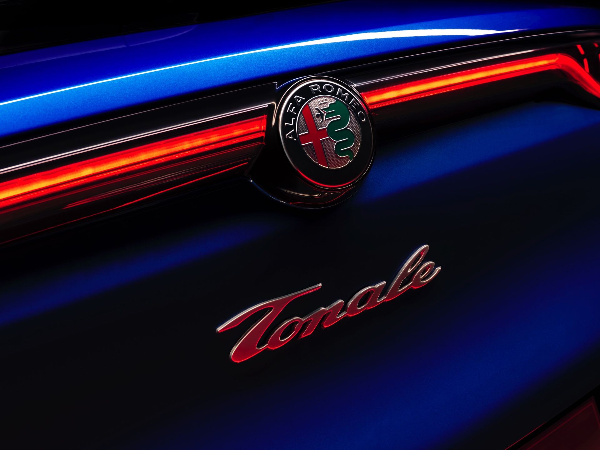 Das gleiche Design-Muster greift der Alfa Romeo Tonale auch am Heck auf, wobei ein nur in der Mitte vom Alfa-Logo unterbrochenes Leucbtband für eine unverwechselbare Nachtoptik sorgt. Mit kräftigen Farben, sportlich gezeichneten Felgen und der markant gezeichneten C-Säule schaffen es die Italiener auf jeden Fall auch bei Tageslicht, ihr nach einem Bergpass im Norden Italiens benanntes Kompakt-SUV auch bei Tageslicht zu einem echten Hingucker zu machen. Nicht ganz auf dem hohen Niveau des Exterieurs bewegt sich die Eigenständigkeit des Innenraums, aber auch hier sorgen hochwertige Details wie die in die Kopfstützen geprägten Alfa-Logos für Premium-Flair.
