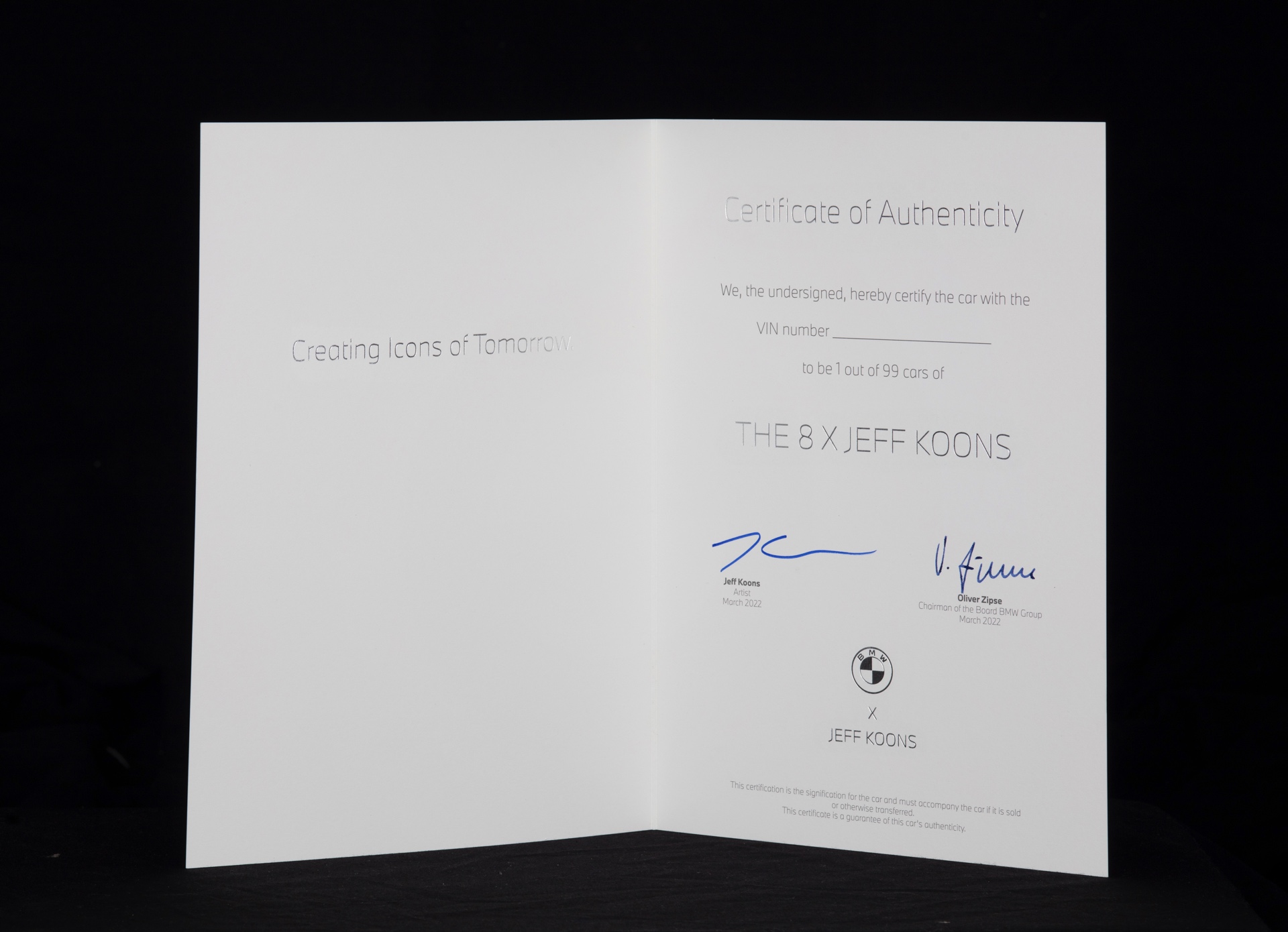 Kaum weniger aufwändig gestaltet ist das Interieur: Auch hier dominieren kräftige Farben. Sitze in den M-Farben Rot und Blau bringen die Farbenfreude des Exterieurs in den Innenraum und natürlich darf auch ein großer Hinweis auf “The x Jeff Koons” samt Unterschrift des Künstlers – stilecht im hellen Blau aus dem Mittelteil des BMW-Logos – nicht fehlen. Alle 99 Exemplare des Fahrzeugs werden zudem mit einem von Koons und BMW-Chef Oliver Zipse unterzeichneten Zertifikat ausgeliefert, das den Wert des rollenden Kunstwerks spätestens bei einem späteren Wiederverkauf deutlich steigern dürfte.