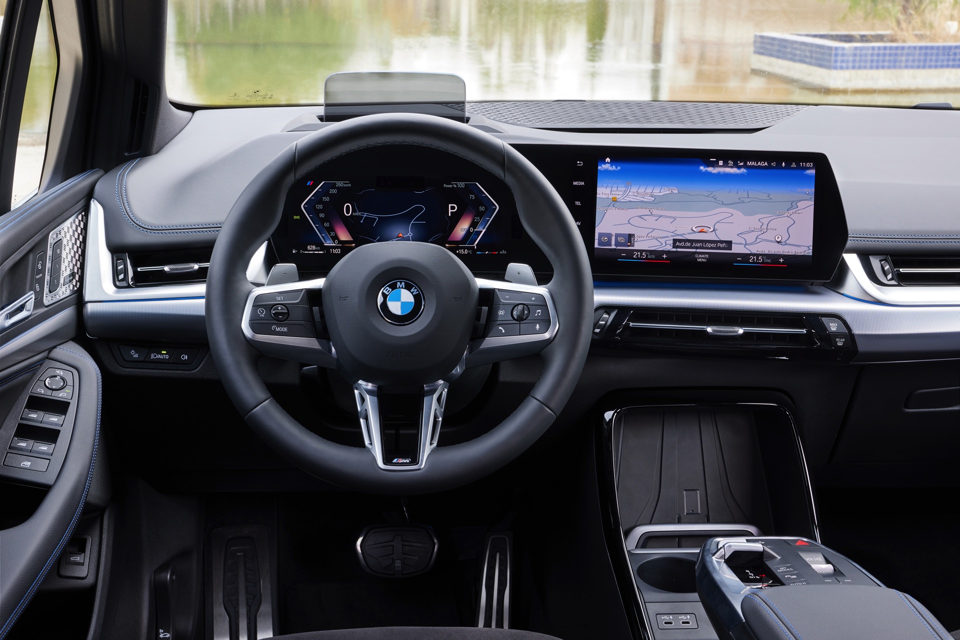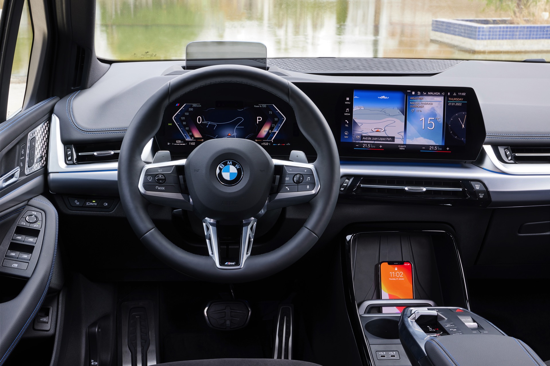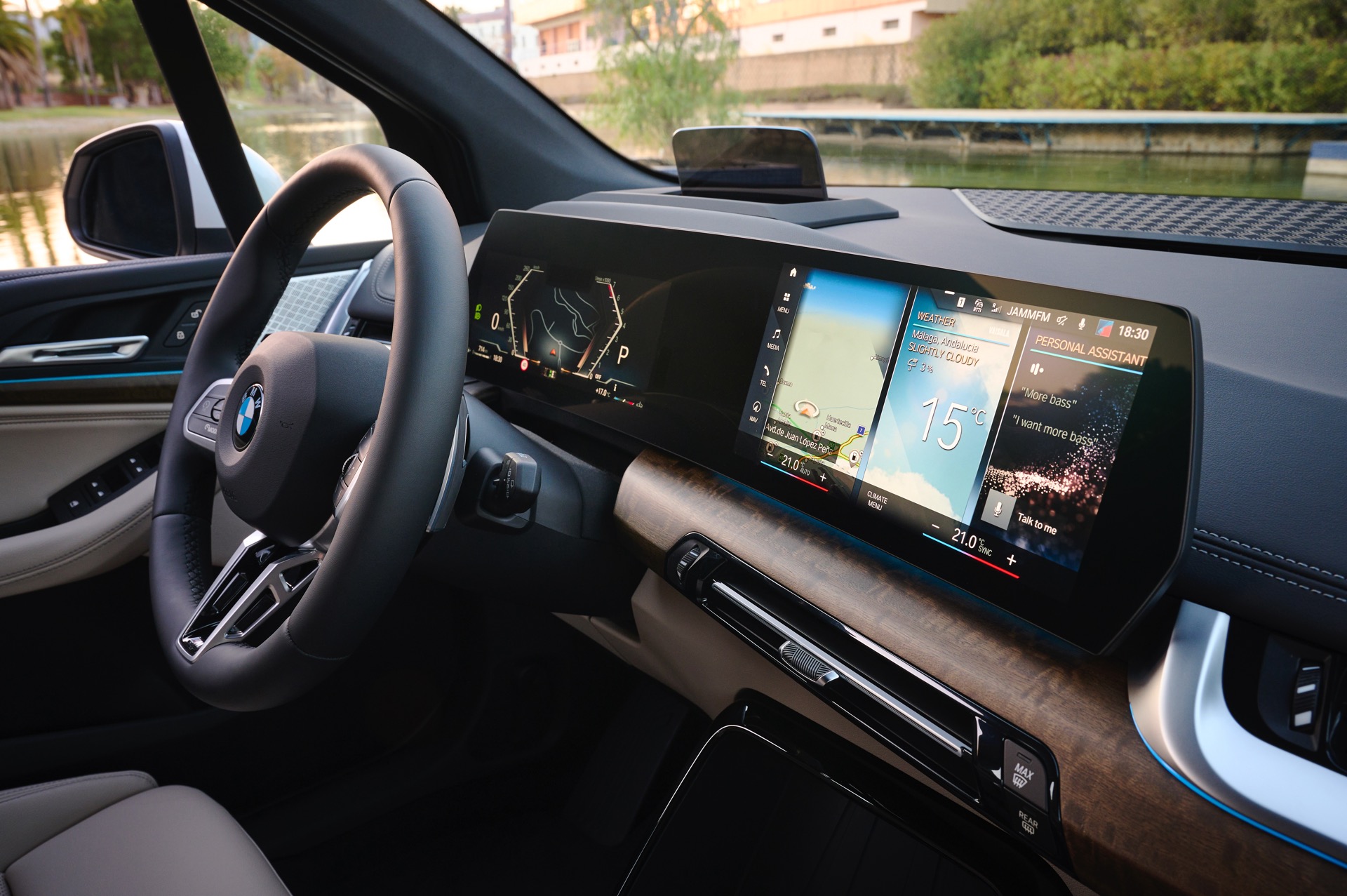 Steigt man also in den neuen BMW 223i Active Tourer (U06), gibt es tatsächlich viel mehr zu entdecken als “nur” die zweite Generation eines Kompakt-Vans aus München. Da alle anderen Benziner mit drei Zylindern arbeiten, sitzt man auch im einzigen neuen Active Tourer mit Vierzylinder-Ottomotor. Mit 204 PS und 320 Newtonmeter Drehmoment ist der 223i für einen Familien-Van sehr ordentlich motorisiert, der Antrieb bleibt zunächst aber dennoch ganz dezent im Hintergrund: Auf den ersten Metern darf der Motor in aller Ruhe auf Betriebstemperatur kommen und wir nutzen die Zeit, um uns auf das neue Infotainment-System zu konzentrieren.
