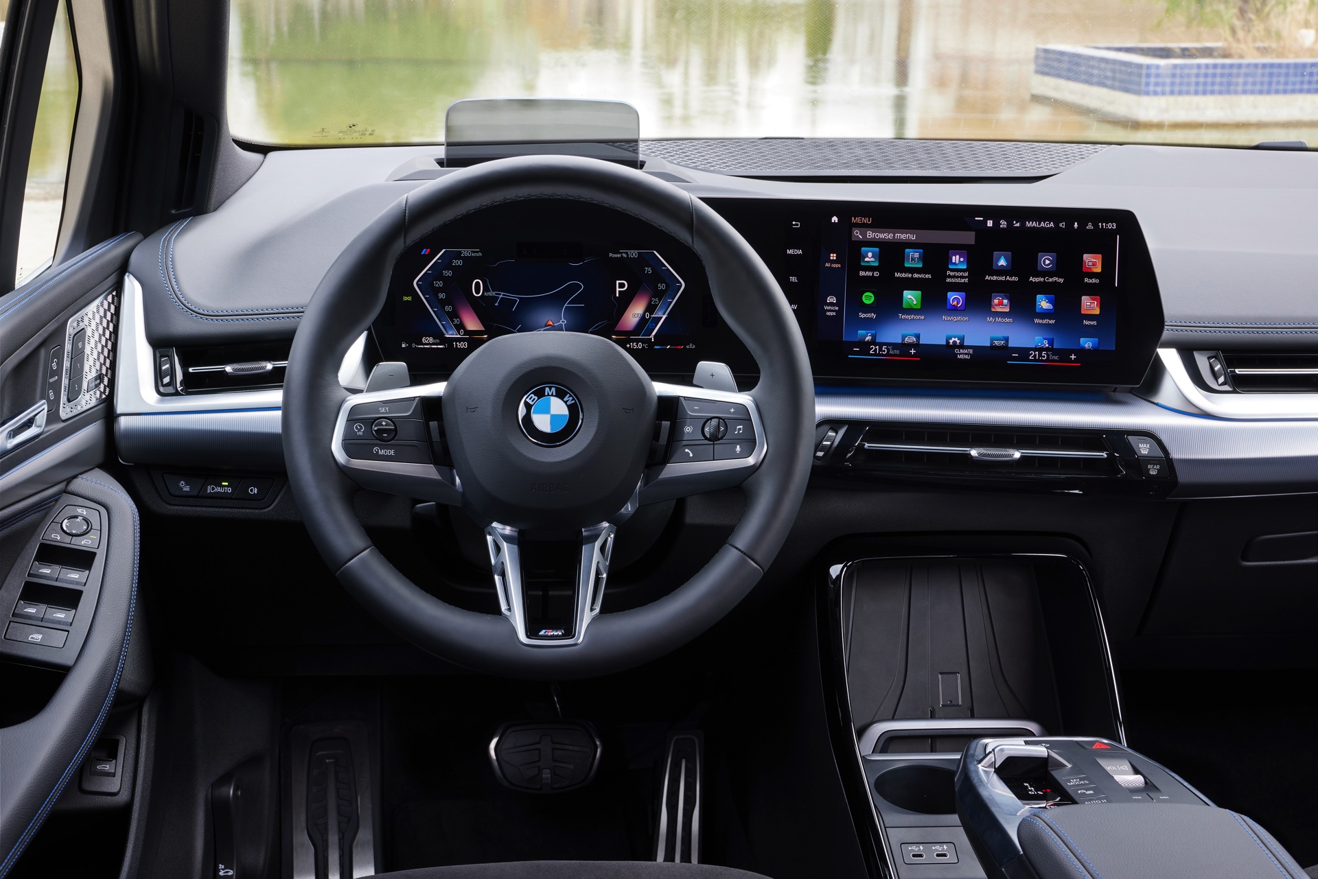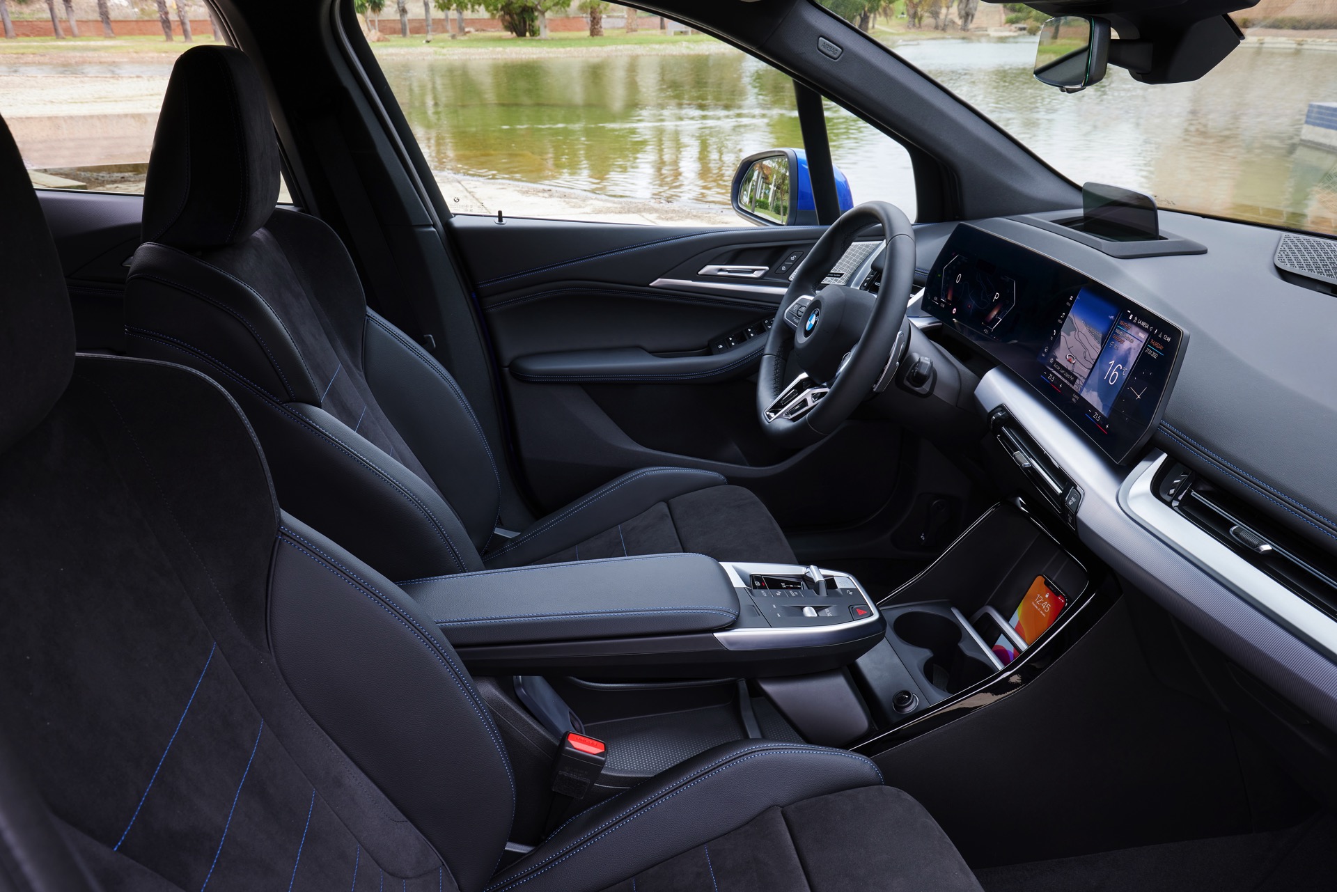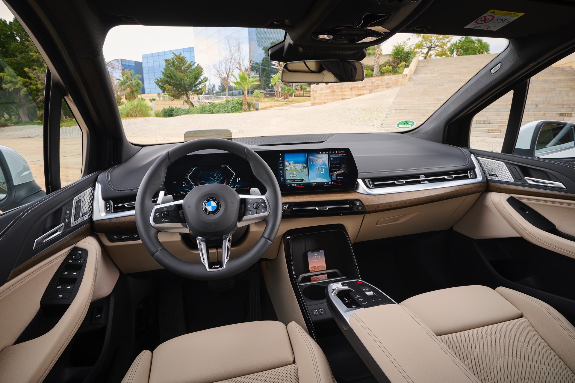 Steigt man also in den neuen BMW 223i Active Tourer (U06), gibt es tatsächlich viel mehr zu entdecken als “nur” die zweite Generation eines Kompakt-Vans aus München. Da alle anderen Benziner mit drei Zylindern arbeiten, sitzt man auch im einzigen neuen Active Tourer mit Vierzylinder-Ottomotor. Mit 204 PS und 320 Newtonmeter Drehmoment ist der 223i für einen Familien-Van sehr ordentlich motorisiert, der Antrieb bleibt zunächst aber dennoch ganz dezent im Hintergrund: Auf den ersten Metern darf der Motor in aller Ruhe auf Betriebstemperatur kommen und wir nutzen die Zeit, um uns auf das neue Infotainment-System zu konzentrieren.