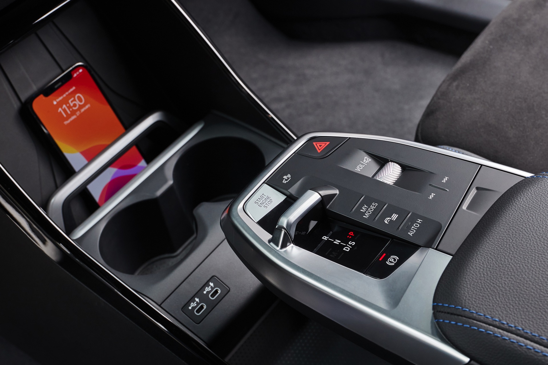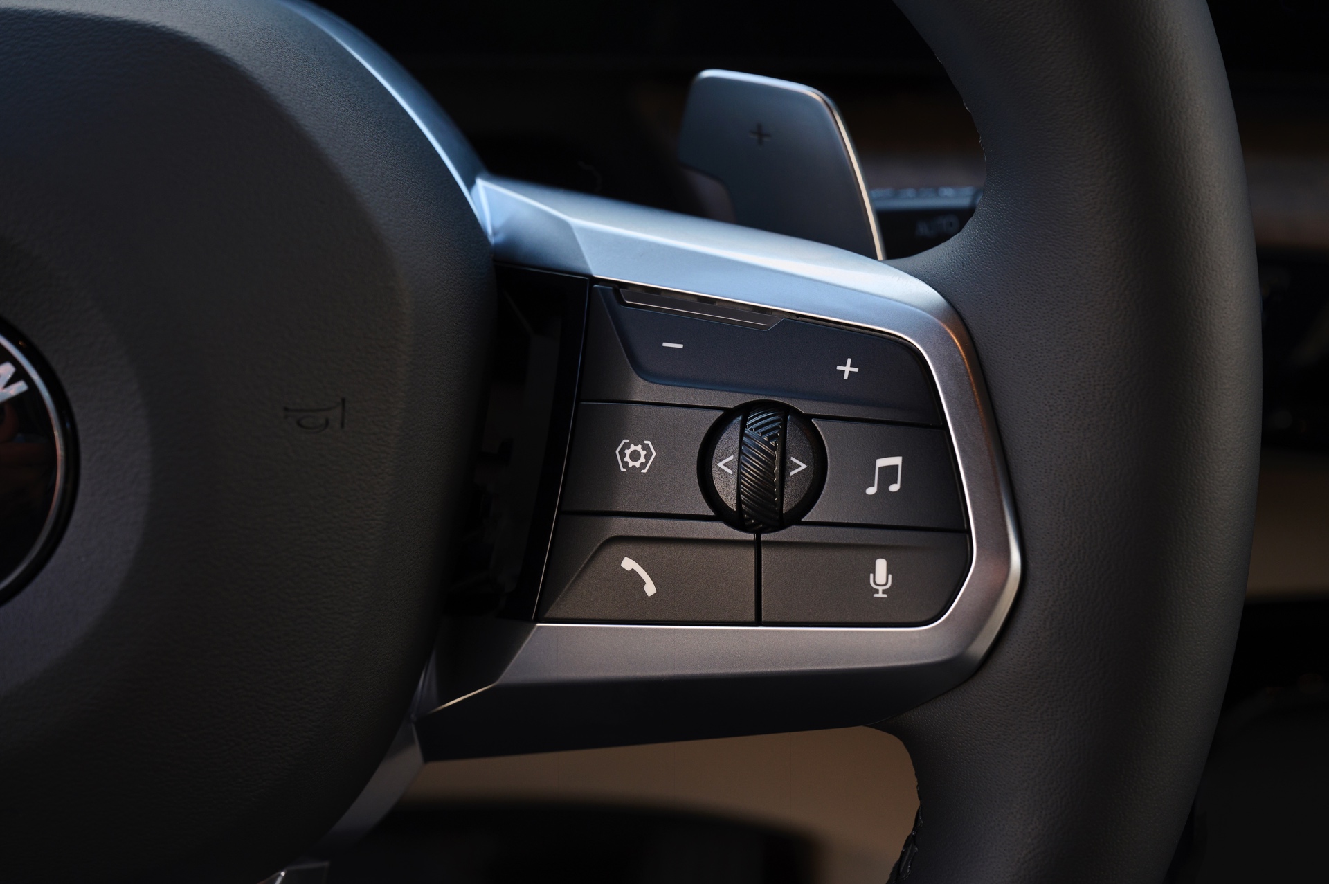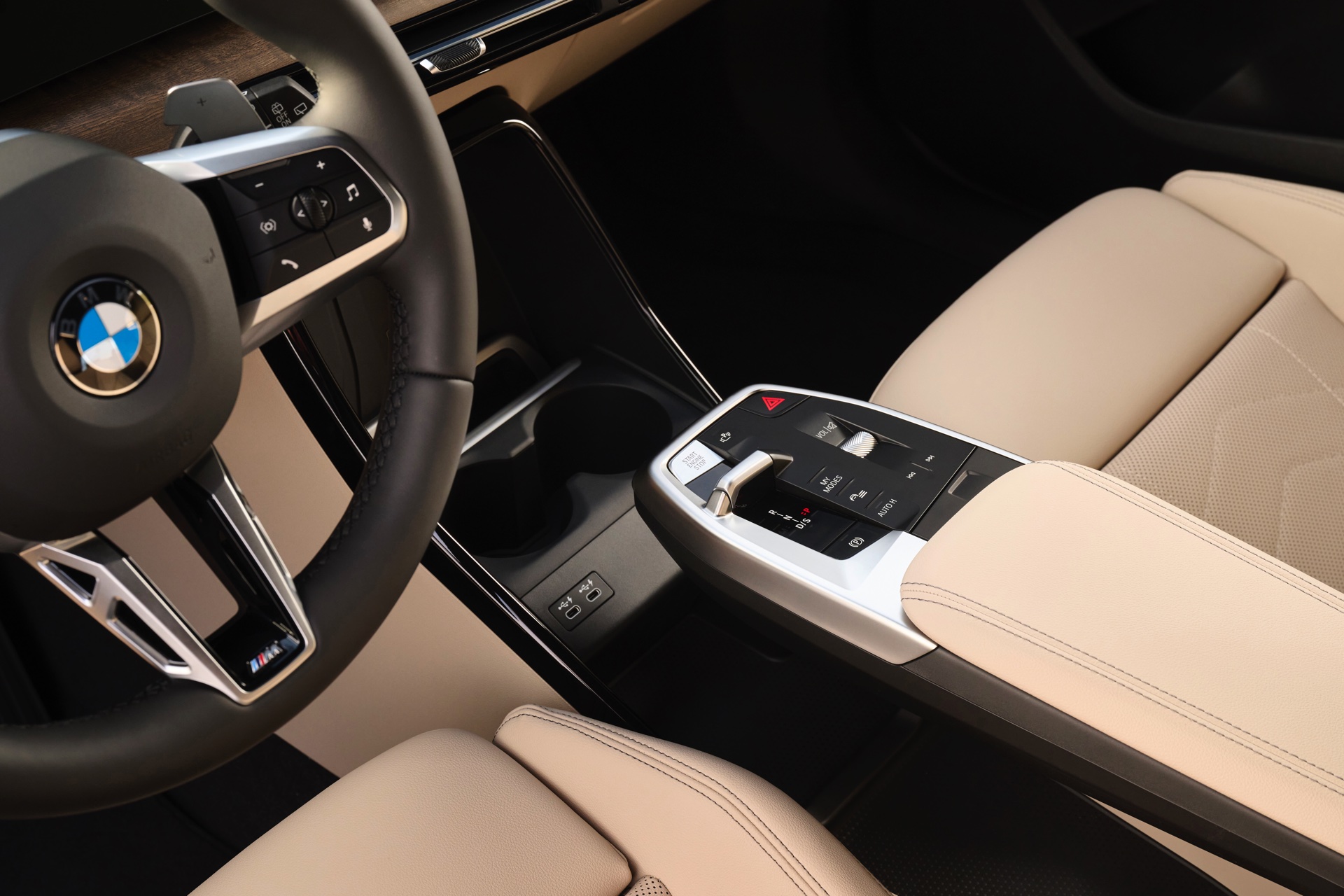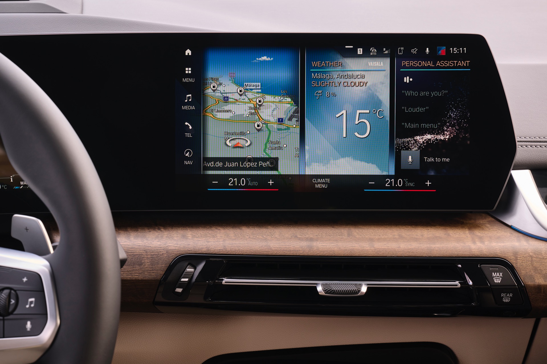 Auf der Suche nach vertrauten Möglichkeiten zur Anpassung der Einstellungen im Infotainment-System greift die rechte Hand gleich mehrfach ins Leere, denn vor der Armauflage befindet sich eine stark reduzierte Bedieneinheit. Die Frage, ob man den iDrive-Controller auf der ersten Fahrt vermisst, lässt sich nur mit einem klaren Ja beantworten – wichtiger ist aus Kundensicht aber, wie schnell man sich an die neue Bedienlogik gewöhnen kann und ob man ihn auch nach ein paar Tagen Eingewöhnung noch so schmerzlich vermisst wie zu Beginn. Auf unserer Fahrt gab es jedenfalls mehrere Situationen, in denen der vertraute Griff zum Controller im Nichts landete, bevor beispielsweise der vom automatischen Zoom veränderte Zoom-Level der Navigations-Karte mit einer Zweifinger-Geste auf dem Touchscreen während der Fahrt ungewohnt viel Aufmerksamkeit in Anspruch nahm.