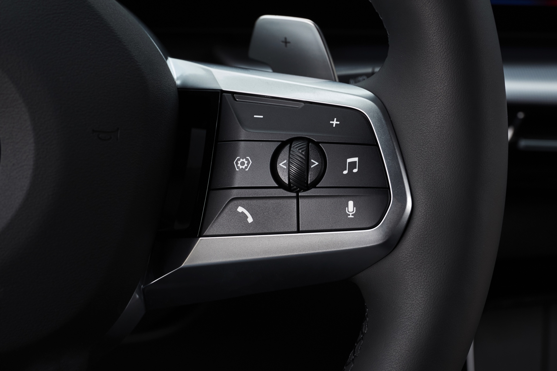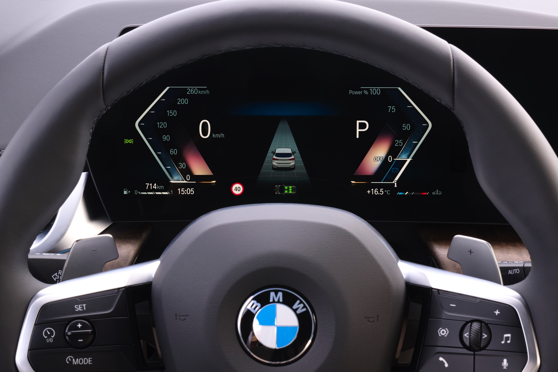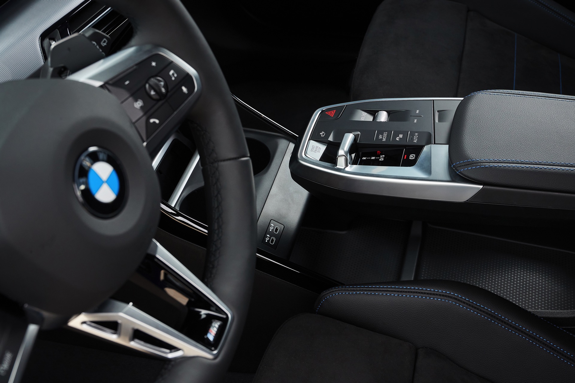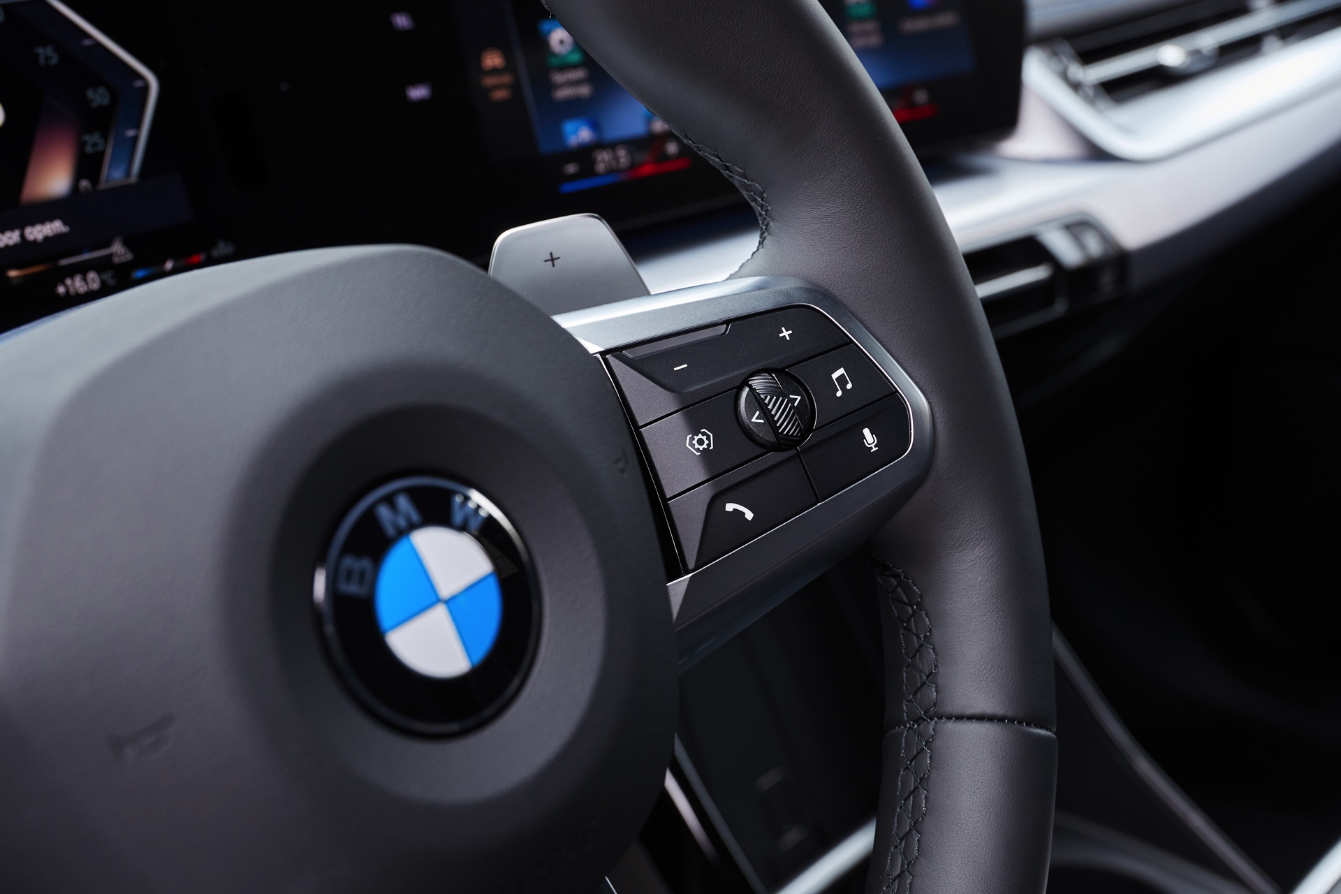 Auf der Suche nach vertrauten Möglichkeiten zur Anpassung der Einstellungen im Infotainment-System greift die rechte Hand gleich mehrfach ins Leere, denn vor der Armauflage befindet sich eine stark reduzierte Bedieneinheit. Die Frage, ob man den iDrive-Controller auf der ersten Fahrt vermisst, lässt sich nur mit einem klaren Ja beantworten – wichtiger ist aus Kundensicht aber, wie schnell man sich an die neue Bedienlogik gewöhnen kann und ob man ihn auch nach ein paar Tagen Eingewöhnung noch so schmerzlich vermisst wie zu Beginn. Auf unserer Fahrt gab es jedenfalls mehrere Situationen, in denen der vertraute Griff zum Controller im Nichts landete, bevor beispielsweise der vom automatischen Zoom veränderte Zoom-Level der Navigations-Karte mit einer Zweifinger-Geste auf dem Touchscreen während der Fahrt ungewohnt viel Aufmerksamkeit in Anspruch nahm.