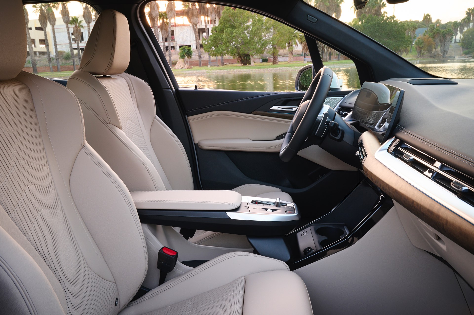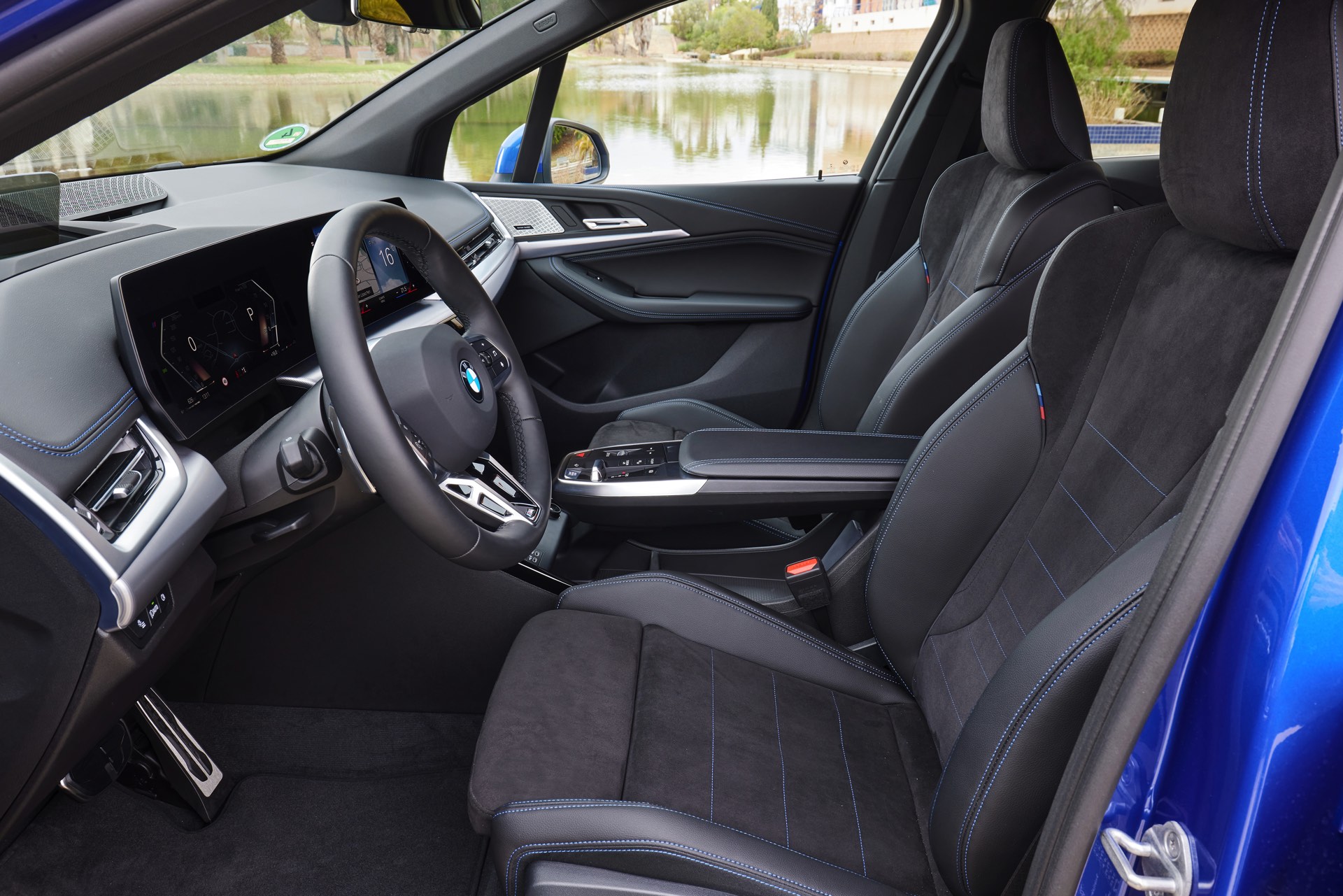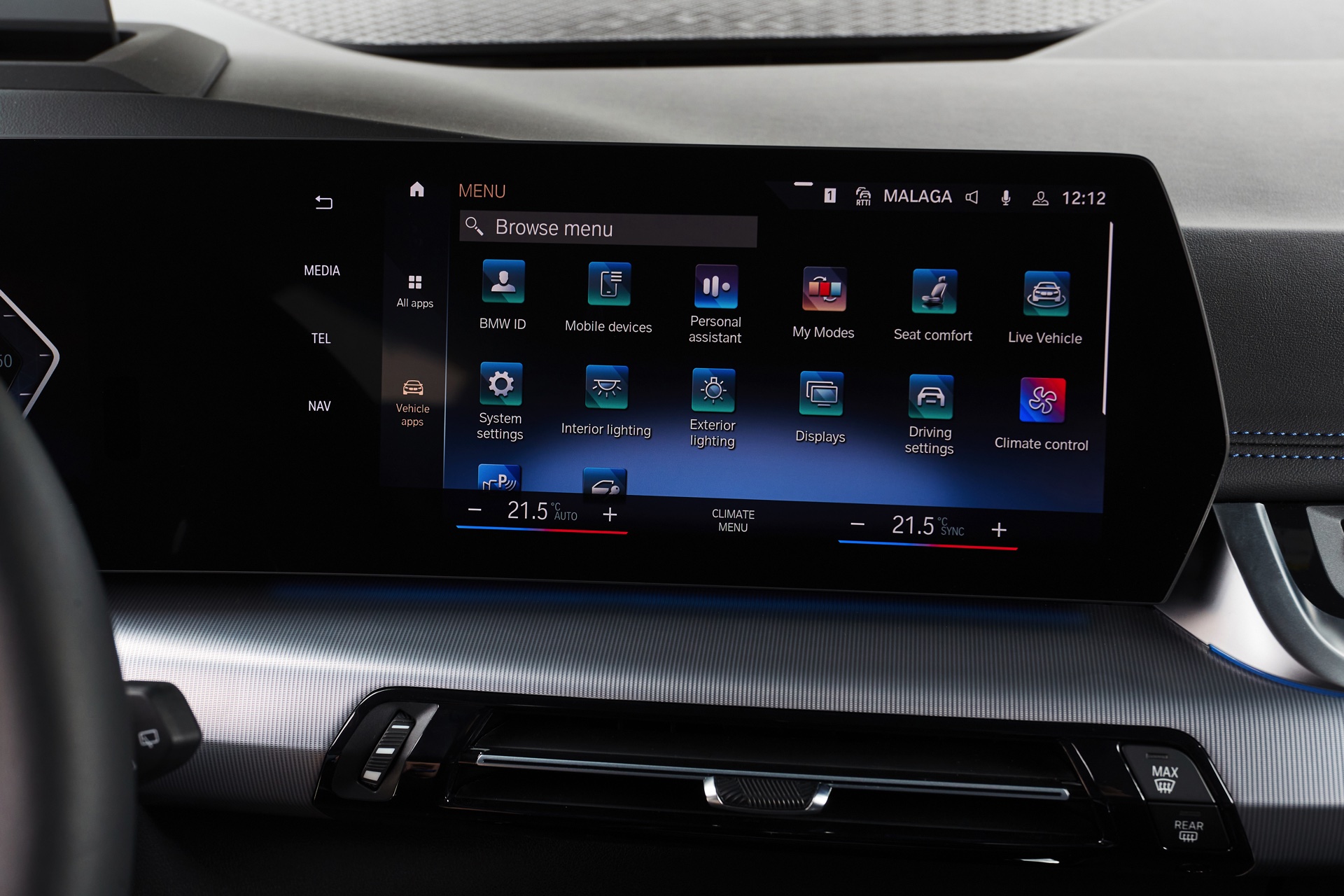 Dabei drängt sich durchaus ein Vergleich mit kürzlich gefahrenen Modellen ganz anderer Preis- und Performance-Klassen auf, denn das Curved Display kennen wir bereits aus BMW i4 und iX. Der Eindruck könnte dabei aber unterschiedlicher kaum sein, denn vom freischwebenden, sehr großzügig dimensionierten und insgesamt beinahe futuristischen Eindruck an Bord der Elektroautos ist das Cockpit des Active Tourer weit entfernt: Die Displays hinter dem gebogenen Deckglas sind mit 12,3 und 10,7 Zoll nicht nur wesentlich kleiner, die gesamte Konstruktion ist auch viel näher am Fahrer und verliert daher ihren freischwebenden Effekt.