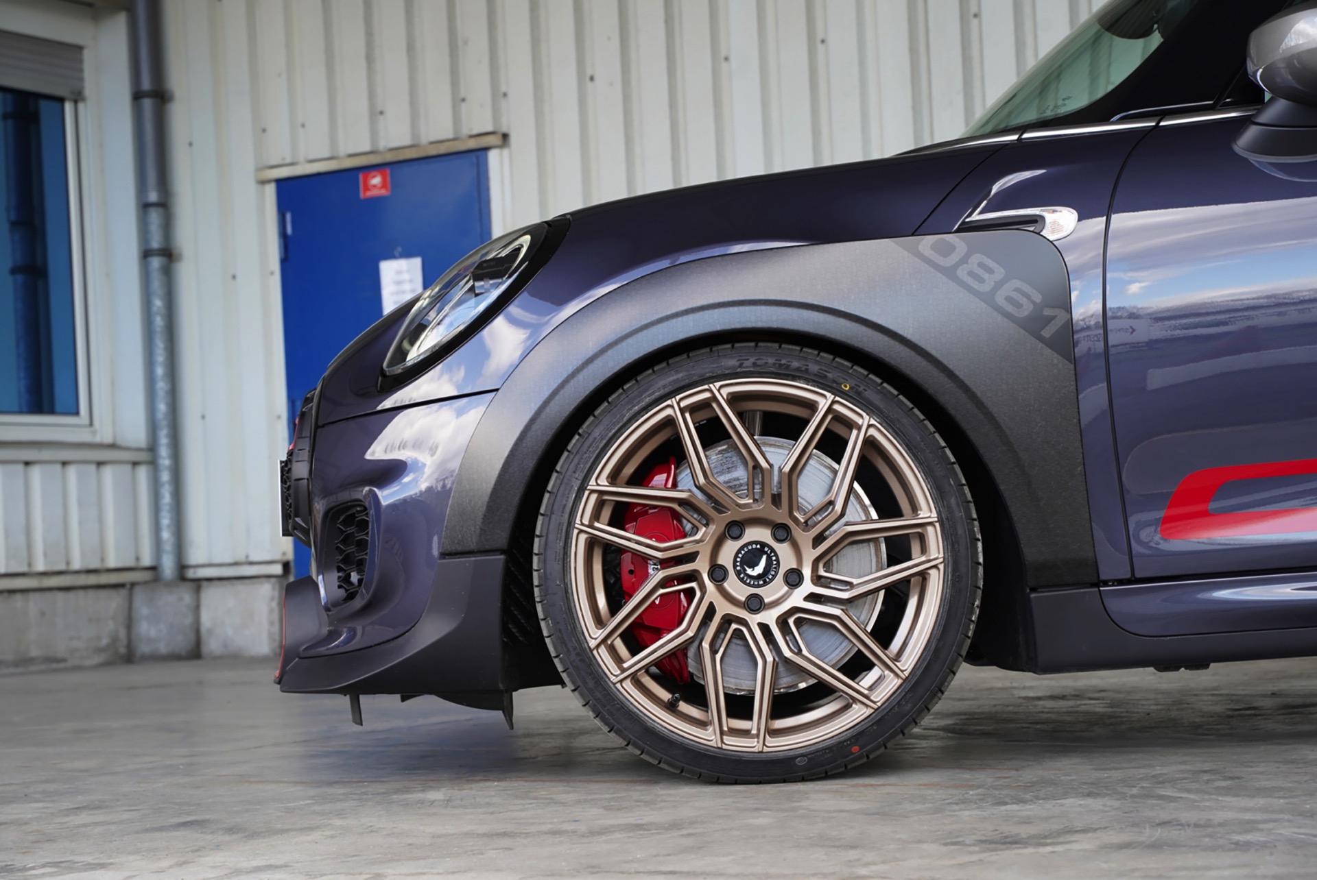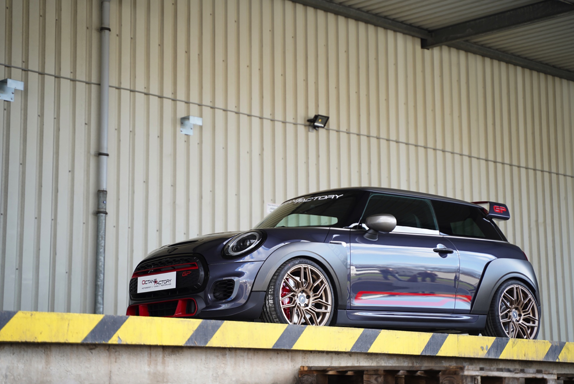 Der neueste Aufschlag kommt dabei von der Bochumer Octanefactory, die sich in Kooperation mit JMS Fahrzeugteile einen John Cooper Works GP zur Brust genommen hat. Dem GP3 wurde dabei ein dezentes, aber prägnantes Performanceu-Upgrade verpasst. Im Fokus stehen dabei die Dragoon-Felgen von Barracuda: 19 Zoll groß im Durchmesser und mit 225/35er Bereifung großzügig bereift, füllen sie die auffallenden Radkästen des Top-MINI. Das Besondere an den Felgen ist die Herstellung im „Flow- Forming-Verfahren“. Im Gegensatz zur Schmiedefelge wird das Rohprodukt nach dem ersten Guss weiterverarbeitet, erhitzt und durchgewalzt. Das Ergebnis ist eine deutlich höhere Materialdichte bei gleichzeitig niedrigerem Gewicht, wodurch nicht nur Material gespart wird, sondern auch besonders filigrane Speichendesigns mit hoher Stabilität möglich werden.