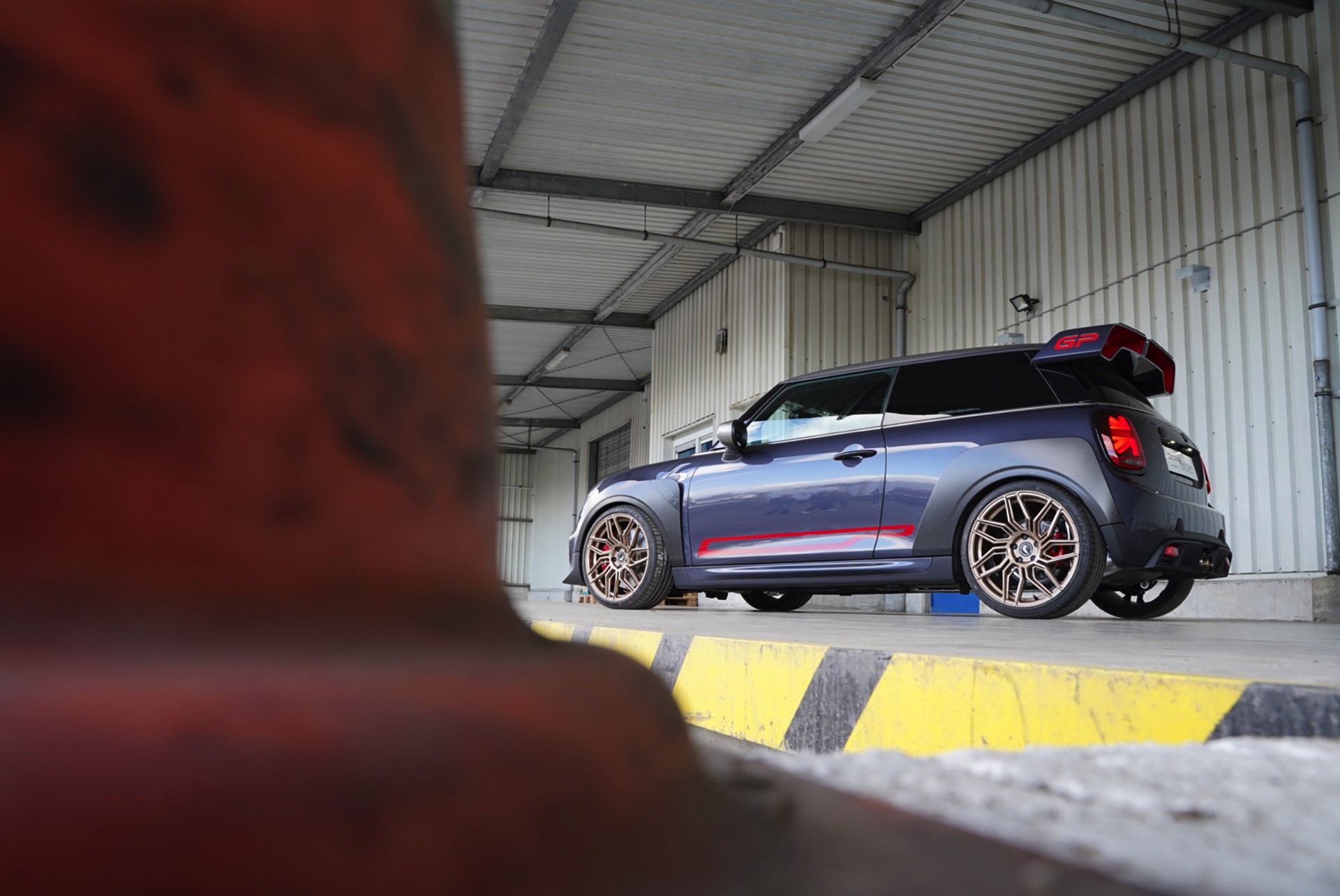 Um die Felgen besser zur Schau zu stellen und den MINI JCW GP3 noch besser mit dem Asphalt zu verbinden, kommt ein KW V3-Gewindefahrwerk inklusive einer angemessenen Tieferlegung zum Einsatz.