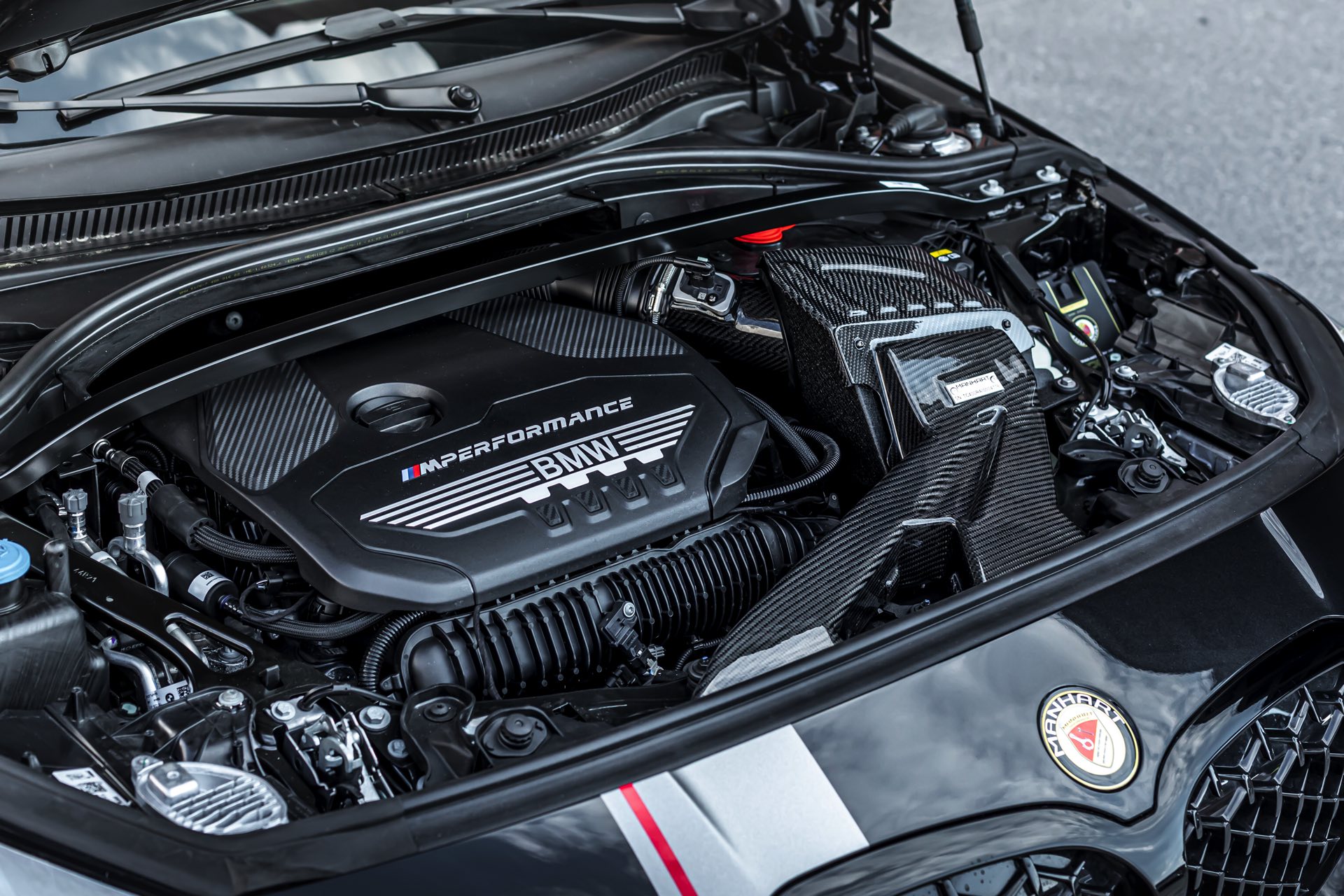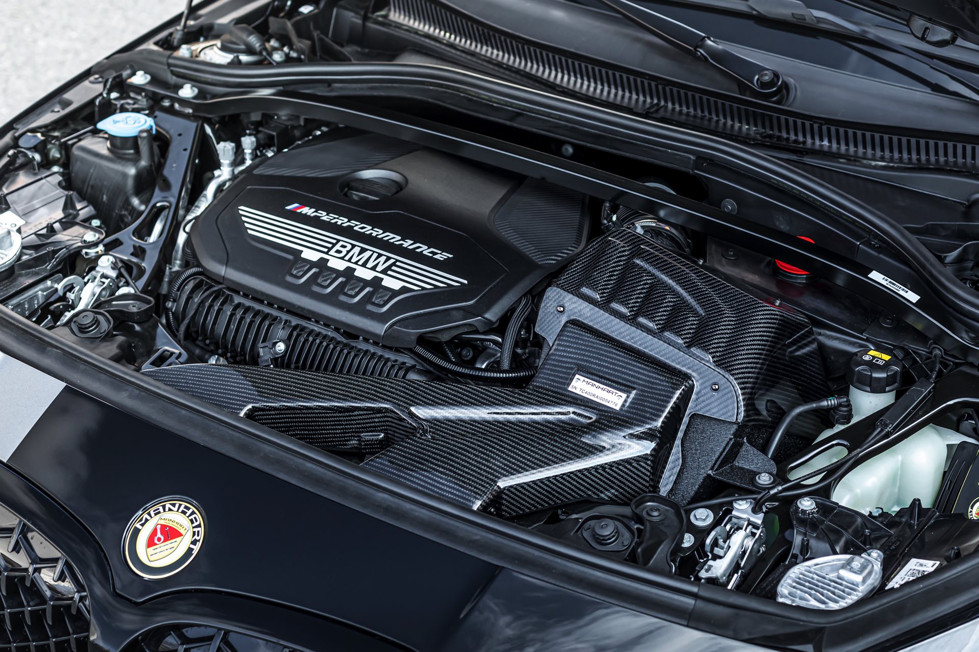 Nach den Tuning-Maßnahmen von Manhart stehen 350 PS und 524 Newtonmeter Drehmoment im Datenblatt, aber dafür muss die Peripherie des Turbo-Vierzylinders gründlich überarbeitet werden: Die intern als B48A20T1 geführte Top-Ausbaustufe des B48-Motors erhält auf der Einlass-Seite eine Carbon-Ansaugung von Armaspeed, auf der Auslass-Seite kommen eine Sport-Downpipe und auf Wunsch – dann aber ohne TÜV – ein 300-Zellen-Katalysator von HJS zum Einsatz. Wer ohnehin keinen Wert auf eine deutsche Straßenzulassung legt, kann auch einen OPF-Deleter in Form eines Ersatzrohres erhalten. Auch mit TÜV-Segen gibt es die Manhart Abgasanlage mit vier schwarzen 90-Millimeter-Endrohren, die das Heck des BMW M135i deutlich aufwertet: "