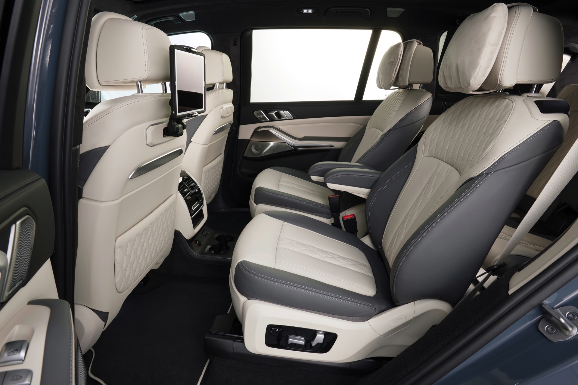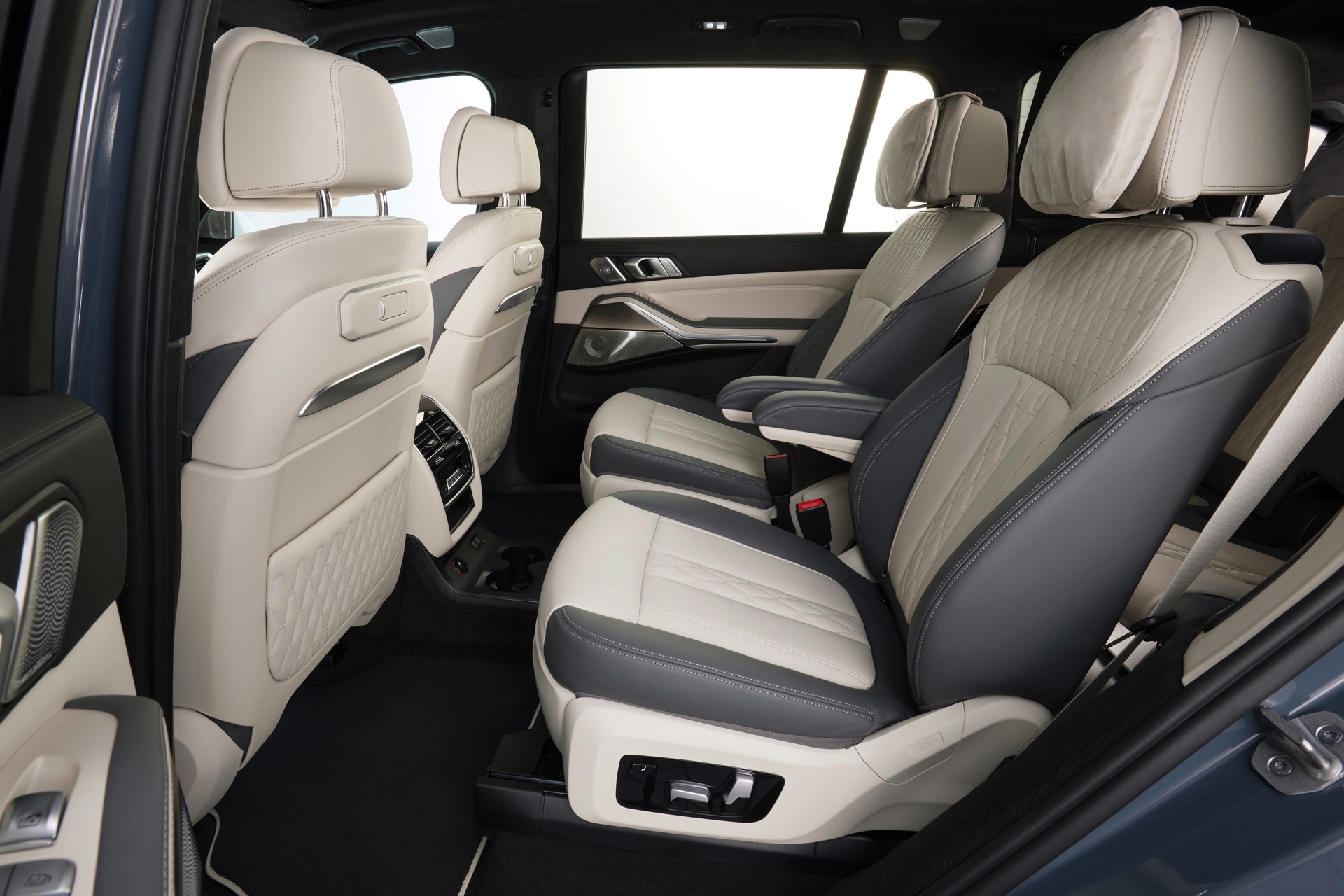 Unterhalb des Topmodells mit dem neuen V8-Biturbo S68 platzieren die Münchner zwei Sechszylinder-Varianten, namentlich den BMW X7 xDrive40i und daneben den vor allem für Europa relevanten X7 xDrive40d. Alle drei Modelle kommen mit 48-Volt-Bordnetz der neuesten Generation und verfügen über einen in das Getriebe der Achtgang-Automatik integrierten Elektromotor mit 9 kW sowie 200 Newtonmeter Drehmoment. An Bord des X7 xDrive40i debütiert der gründlich überarbeitete Sechszylinder-Benziner B58B30M2, der auf eine Systemleistung von 380 PS sowie ein System-Drehmoment von 540 Newtonmeter kommt. Unterm Strich ähnlich stark, aber Diesel-typisch deutlich effizienter präsentiert sich der X7 xDrive40d mit 352 PS und 720 Newtonmeter Drehmoment.