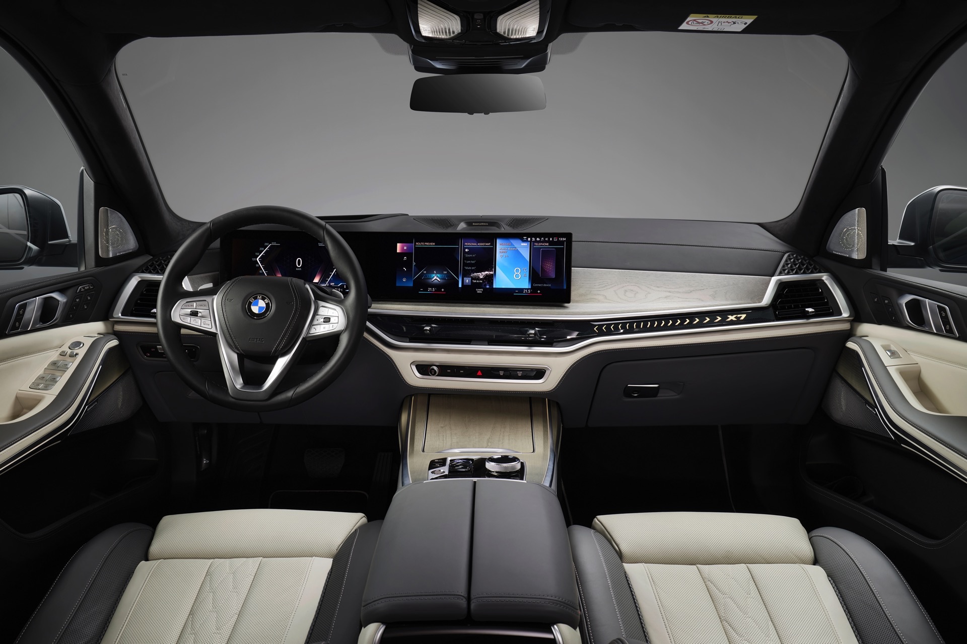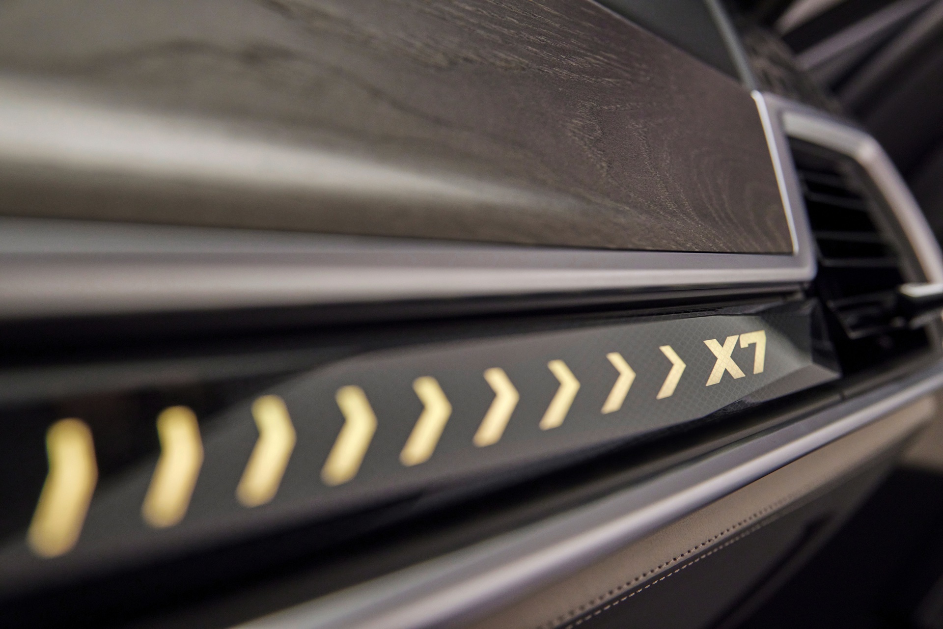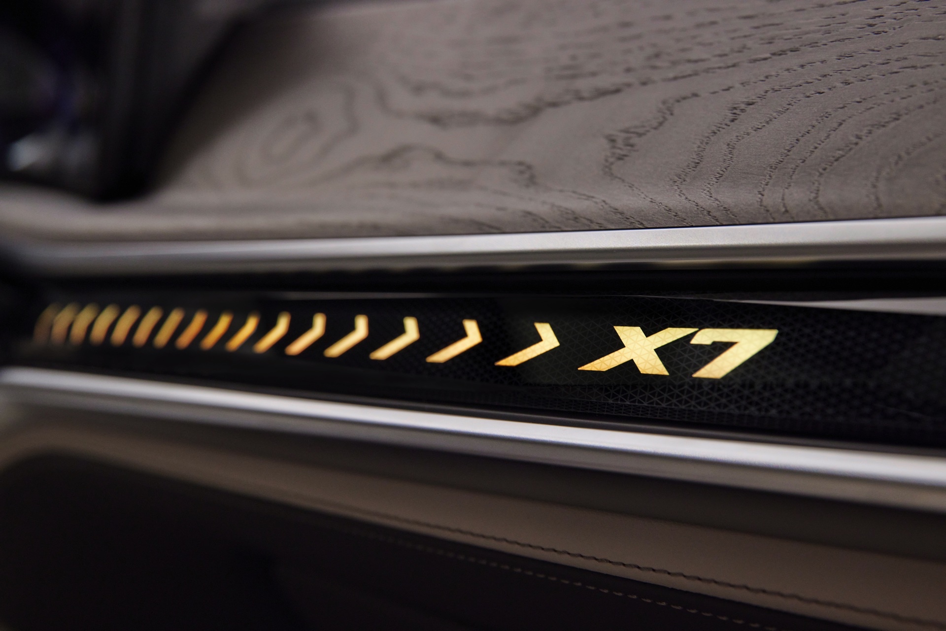 Größer als am Heck fallen die Veränderungen im Innenraum des BMW X7 Facelift aus: Statt zwei einzelnen Displays gibt es ab dem Marktstart im August 2022 ein großes Curved Display, das sich aus einem 12,3 Zoll-Display hinter dem Lenkrad und einem 14,9 Zoll-Touchscreen rechts davon zusammensetzt. Auch dank der Grafiken des Infotainment-Systems iDrive 8 trägt das Curved-Display wesentlich dazu bei, dass sich der Innenraum auf dem neuesten Stand der Technik präsentiert. Neu ist auch das Bedienfeld auf der Mittelkonsole, wobei der dezente Gangwahlhebel im Stil des iX wesentlich platzsparender als die bisherige Lösung ist. Vor dem Beifahrer ist eine beleuchtete Interieurleiste mit X7- oder M-Schriftzug zu sehen, wobei Farbe und Helligkeit über das iDrive-Menü wählbar sind. Unverändert bleiben das serienmäßige Panorama-Glasdach und das Kofferraum-Volumen von bis zu 2.120 Liter.