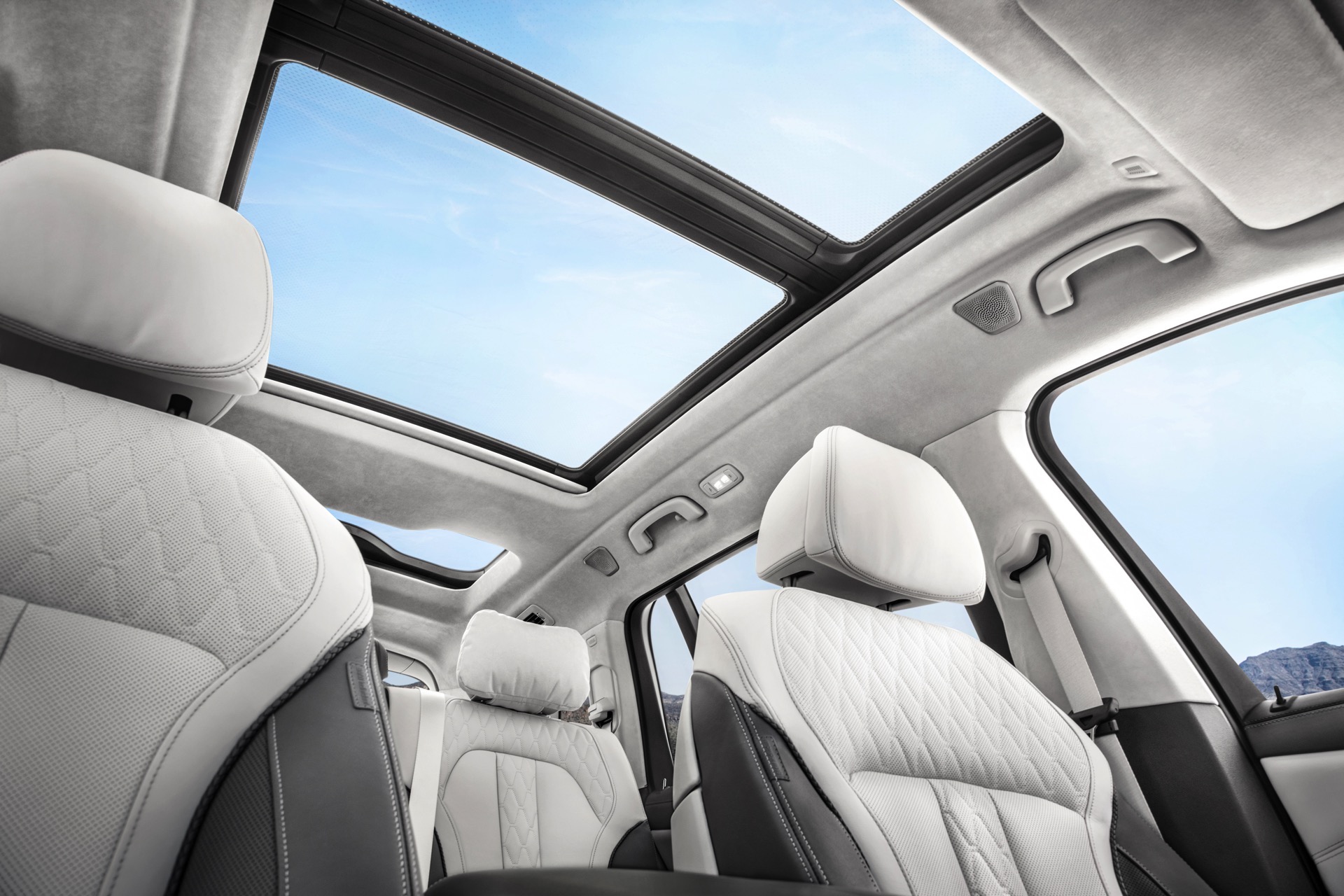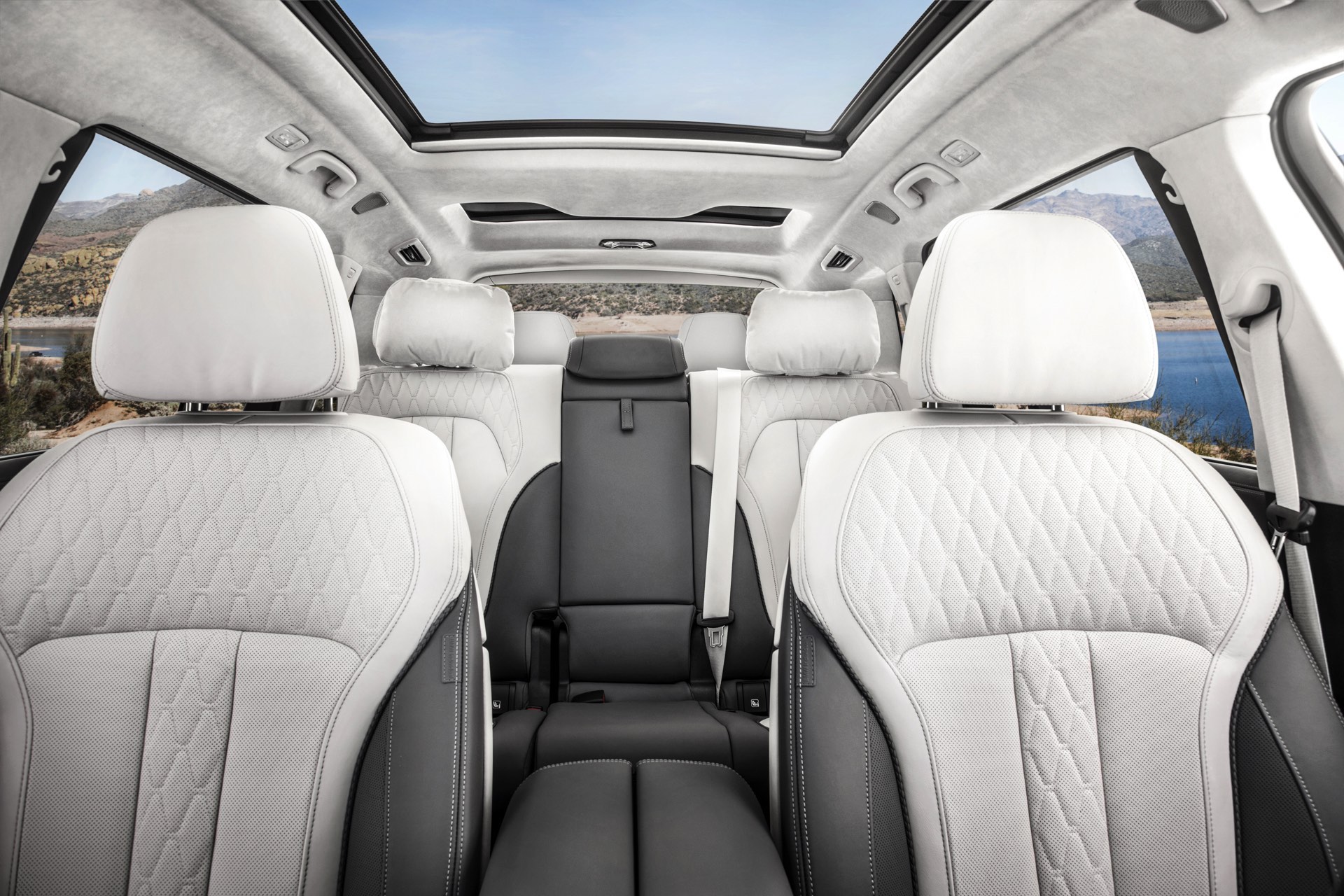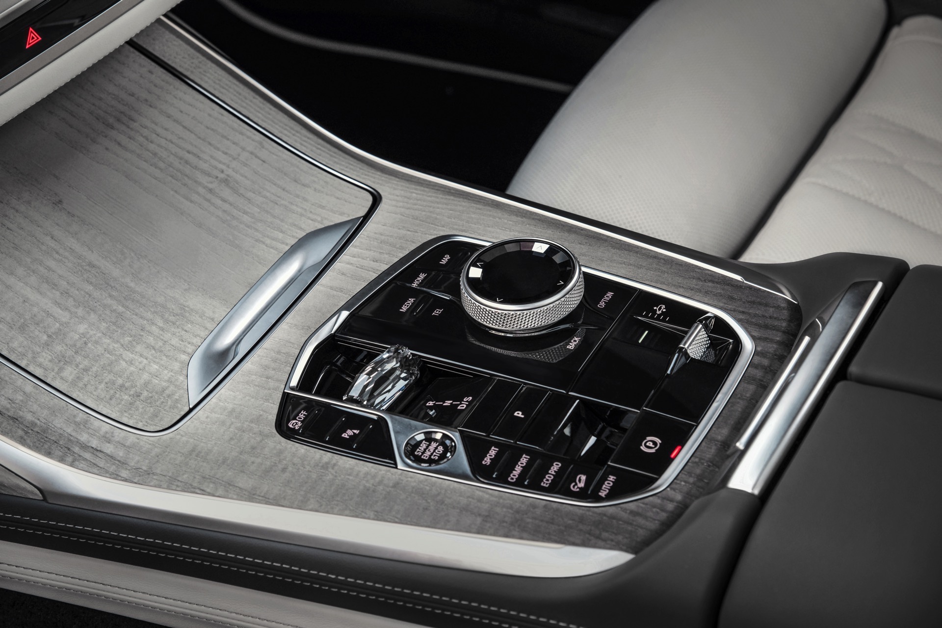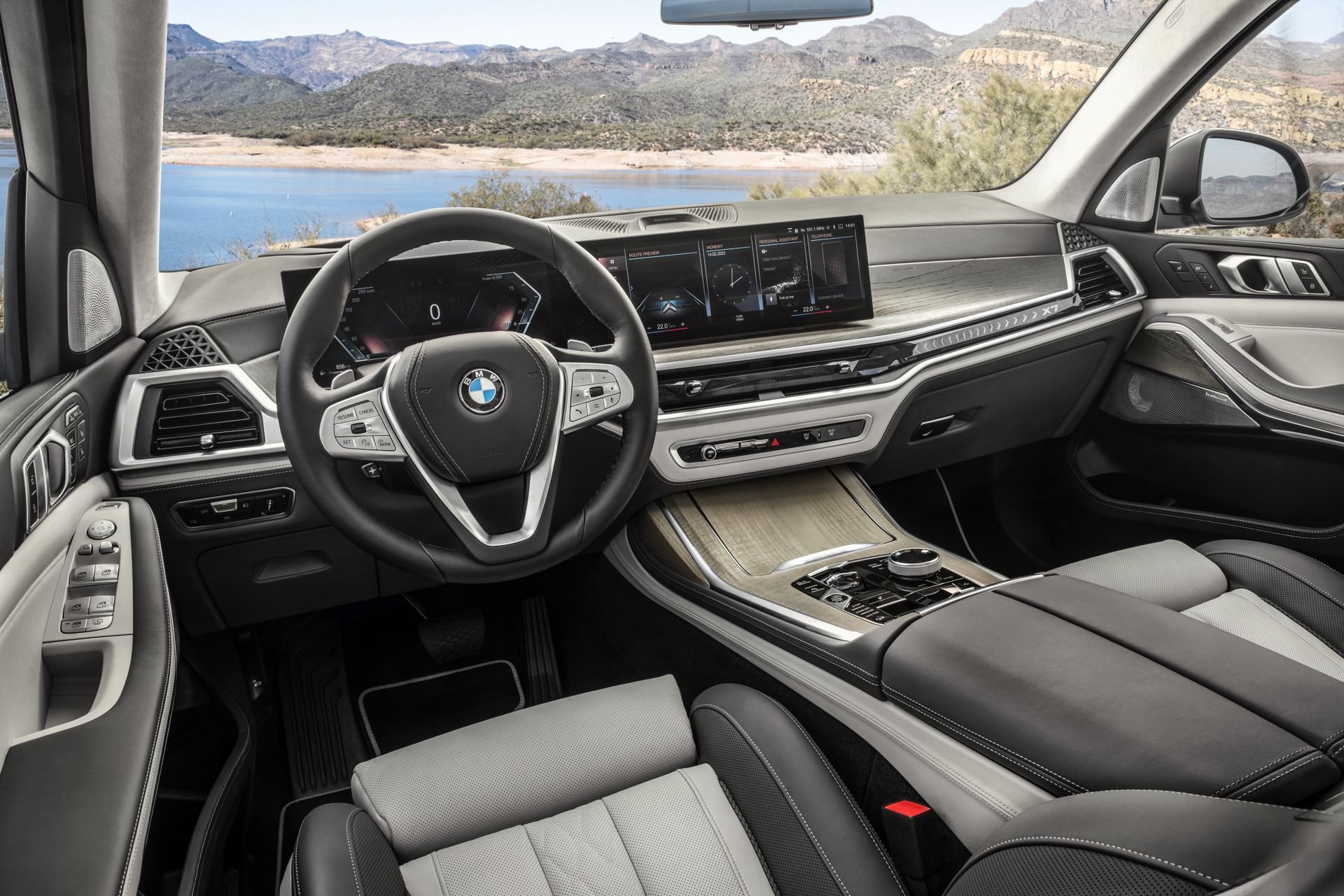 Größer als am Heck fallen die Veränderungen im Innenraum des BMW X7 Facelift aus: Statt zwei einzelnen Displays gibt es ab dem Marktstart im August 2022 ein großes Curved Display, das sich aus einem 12,3 Zoll-Display hinter dem Lenkrad und einem 14,9 Zoll-Touchscreen rechts davon zusammensetzt. Auch dank der Grafiken des Infotainment-Systems iDrive 8 trägt das Curved-Display wesentlich dazu bei, dass sich der Innenraum auf dem neuesten Stand der Technik präsentiert. Neu ist auch das Bedienfeld auf der Mittelkonsole, wobei der dezente Gangwahlhebel im Stil des iX wesentlich platzsparender als die bisherige Lösung ist. Vor dem Beifahrer ist eine beleuchtete Interieurleiste mit X7- oder M-Schriftzug zu sehen, wobei Farbe und Helligkeit über das iDrive-Menü wählbar sind. Unverändert bleiben das serienmäßige Panorama-Glasdach und das Kofferraum-Volumen von bis zu 2.120 Liter.
