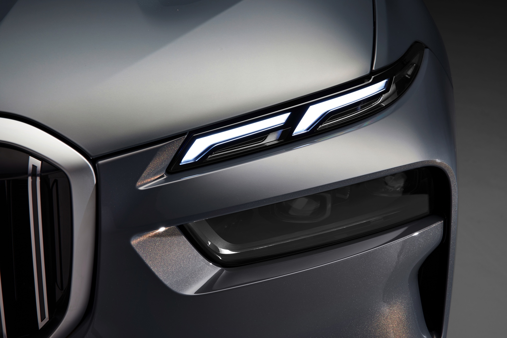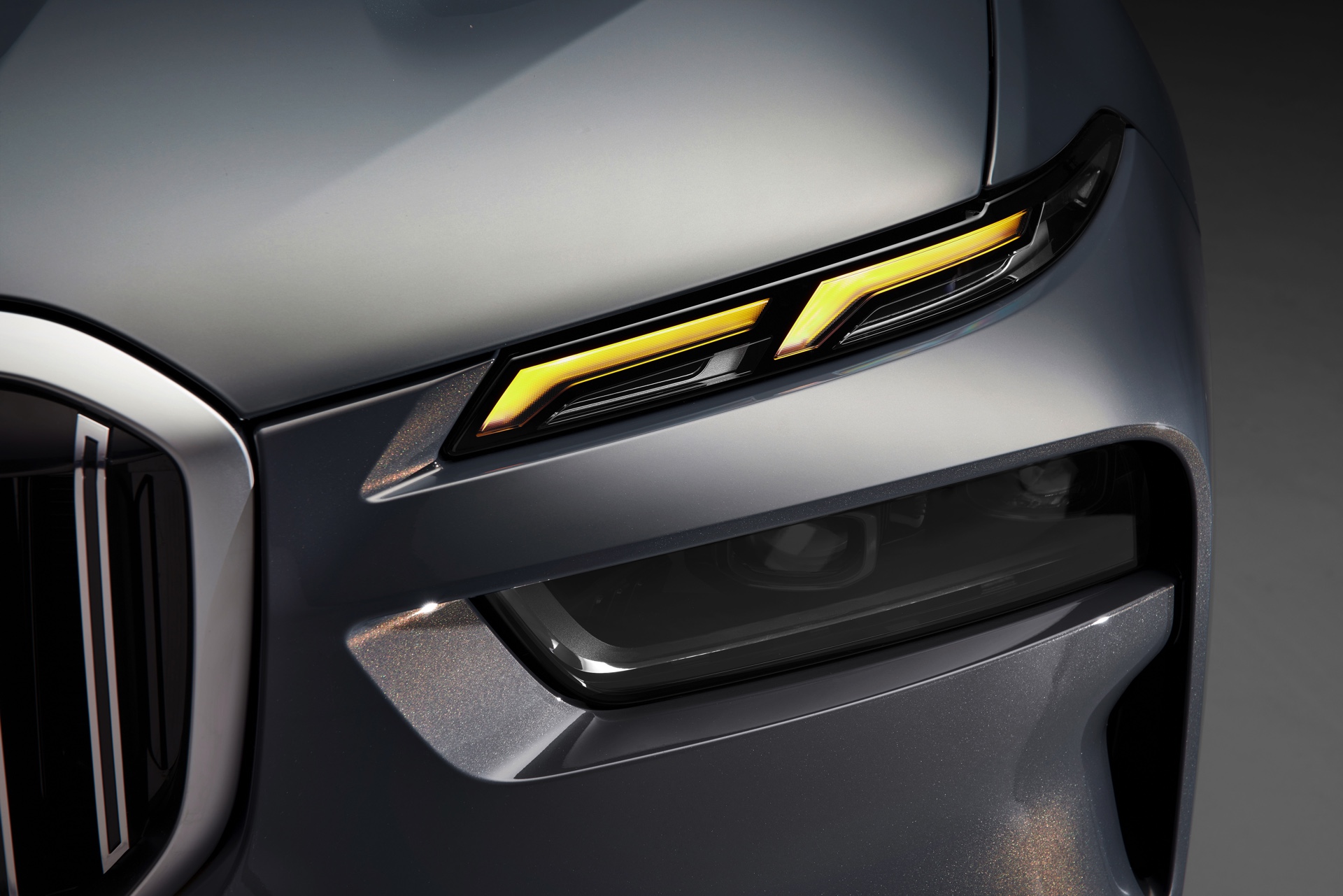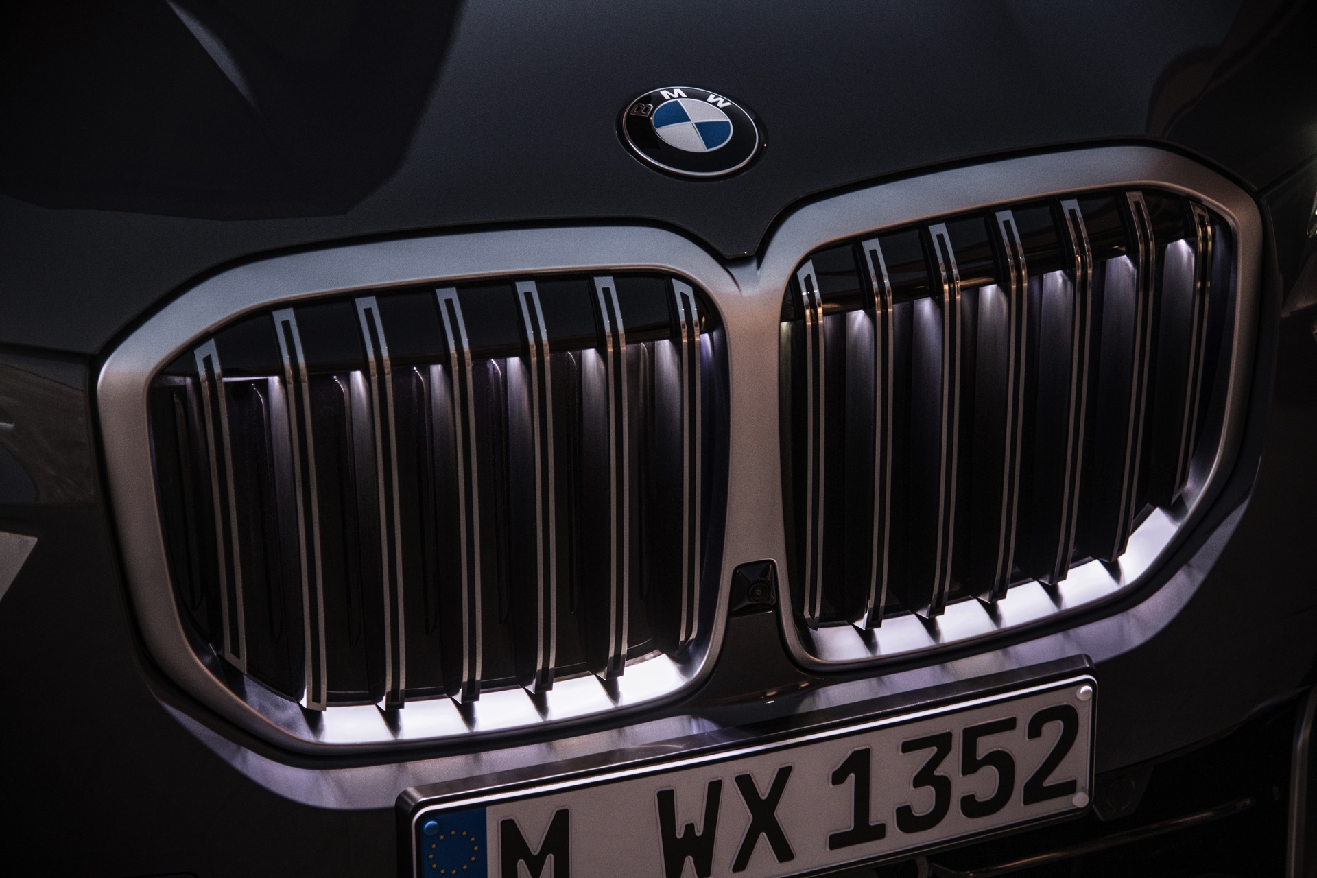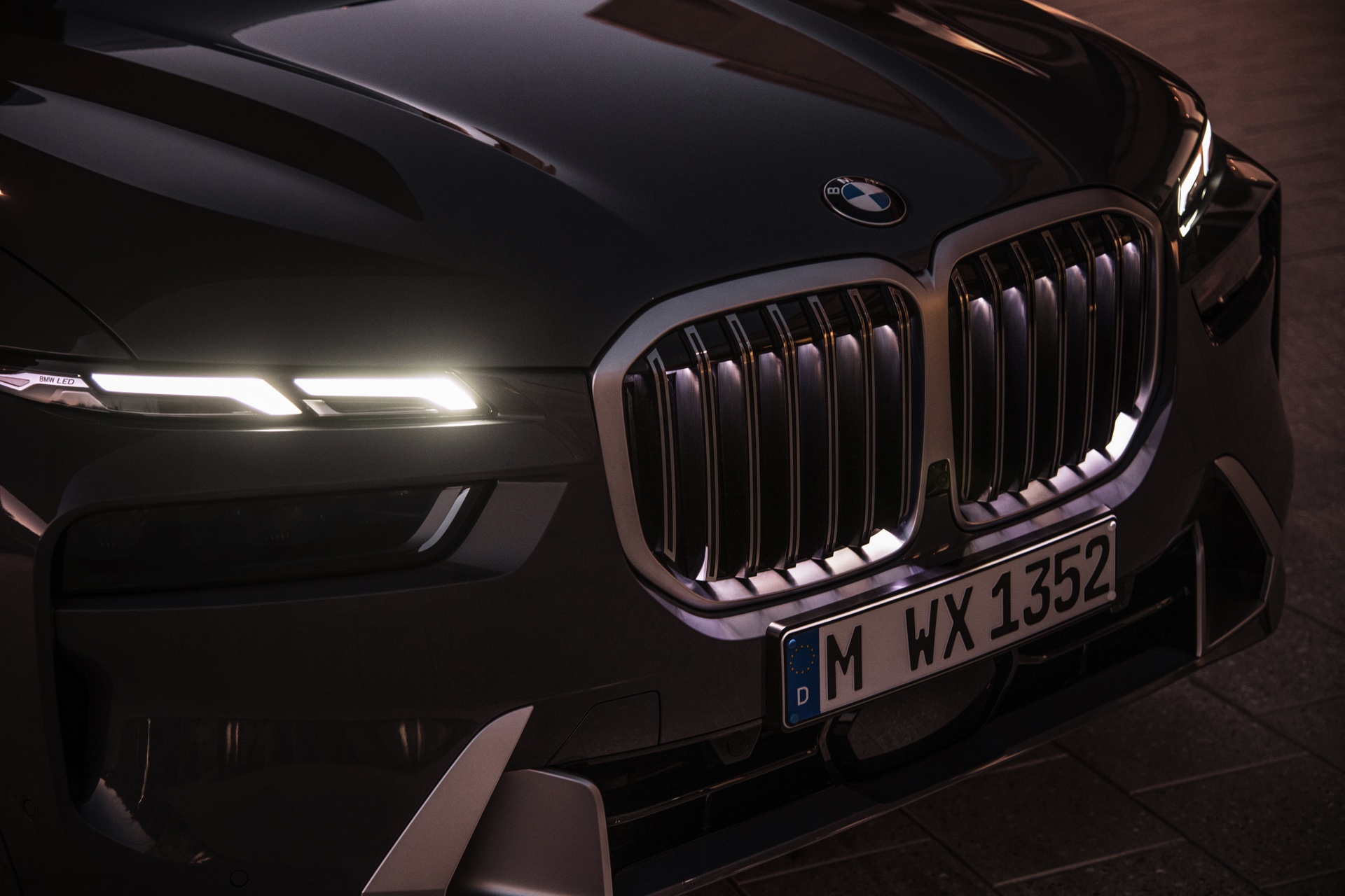 Größter Hingucker der Modellpflege sind zweifellos die horizontal geteilten Front-Scheinwerfer, wobei ein schmales LED-Leuchtenband am oberen Rand für Tagfahrlicht und Blinker verantwortlich ist. Wenige Zentimeter lackierte Fläche unterhalb liegen die eigentlichen Haupt-Scheinwerfer mit Matrix-LED-Technik, die nur bei Nacht zum Einsatz kommen und tagsüber komplett in den Hintergrund treten. Die neuen LED-Scheinwerfer ersetzen übrigens die bisherigen Laserlicht-Scheinwerfer, die für den X7 nicht länger angeboten werden. Ein weiterer Hingucker sind die gegen Aufpreis erhältlichen und dann auf Knopfdruck beleuchteten Iconic Glow-Nieren, die bei aktiviertem Abblendlicht auch während der Fahrt leuchten dürfen.