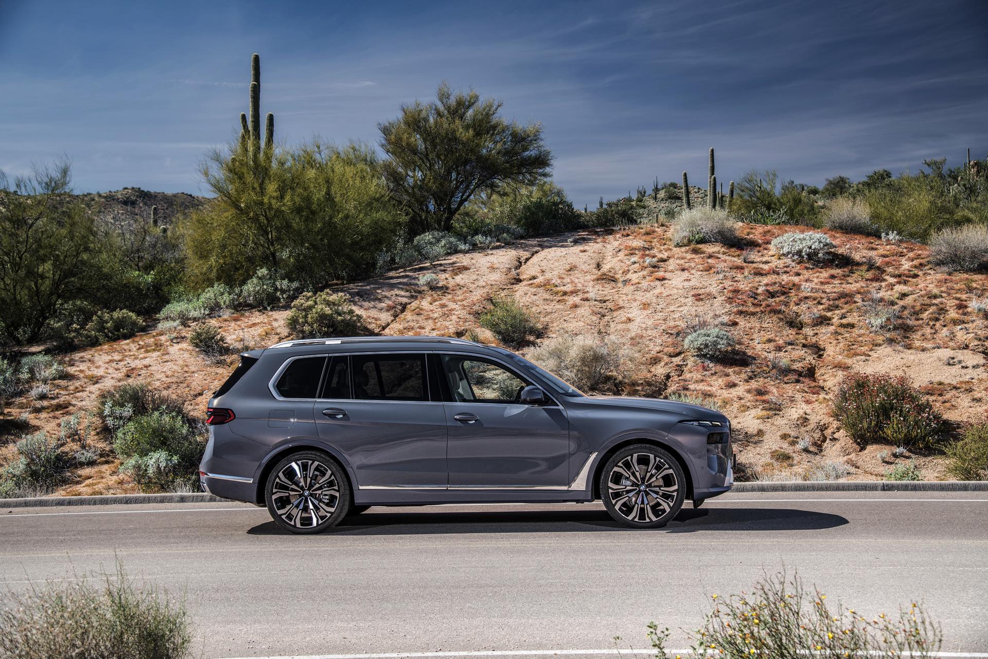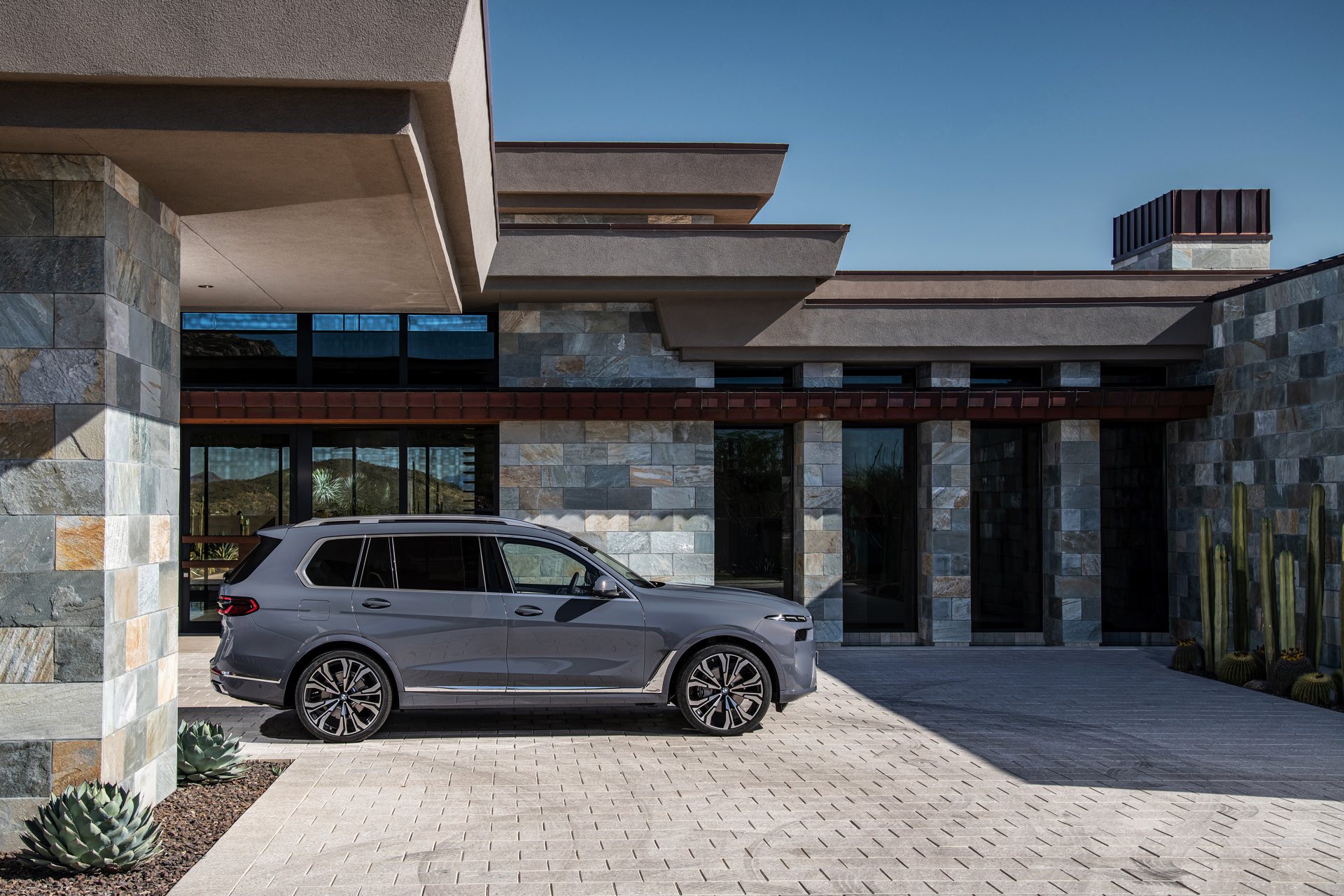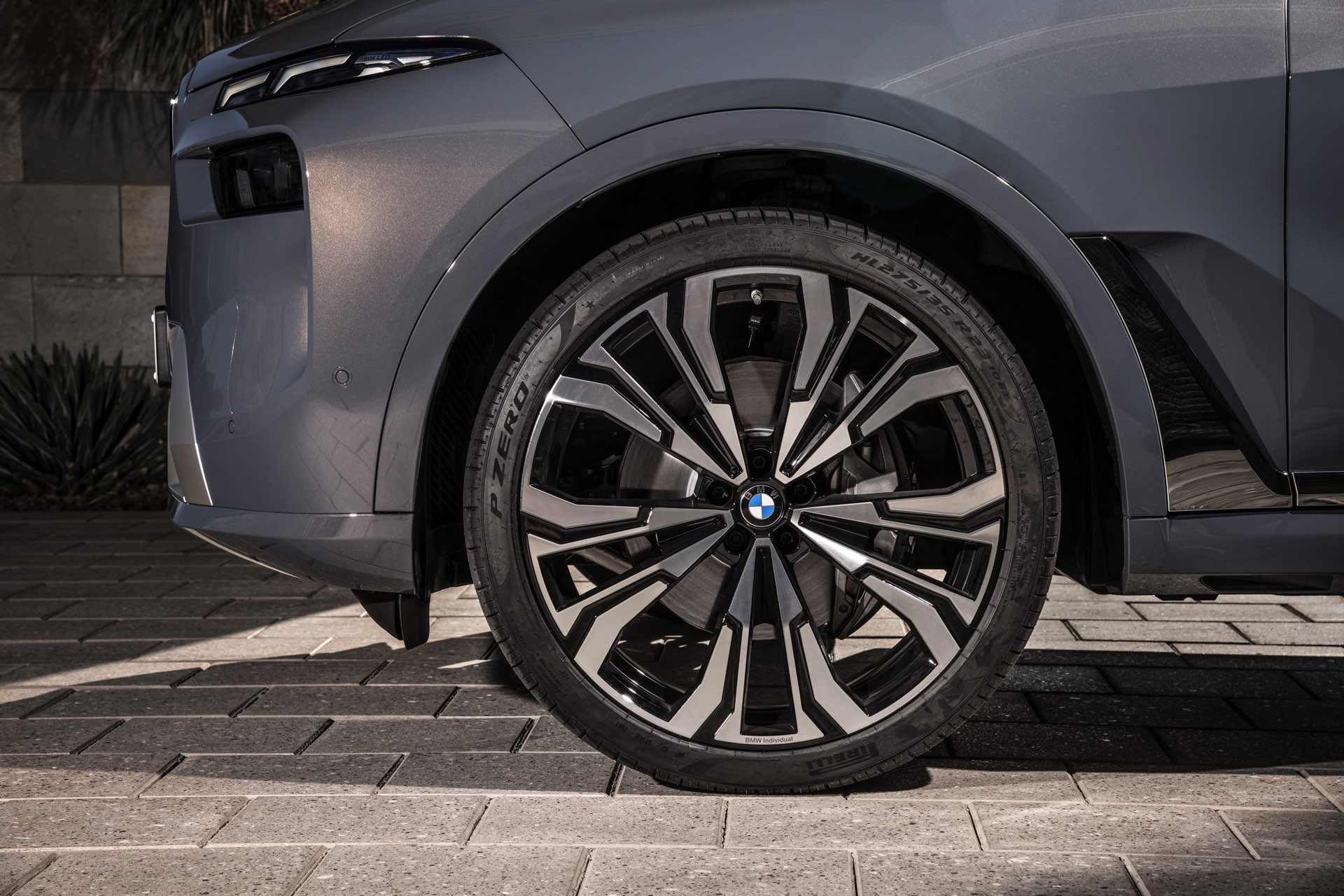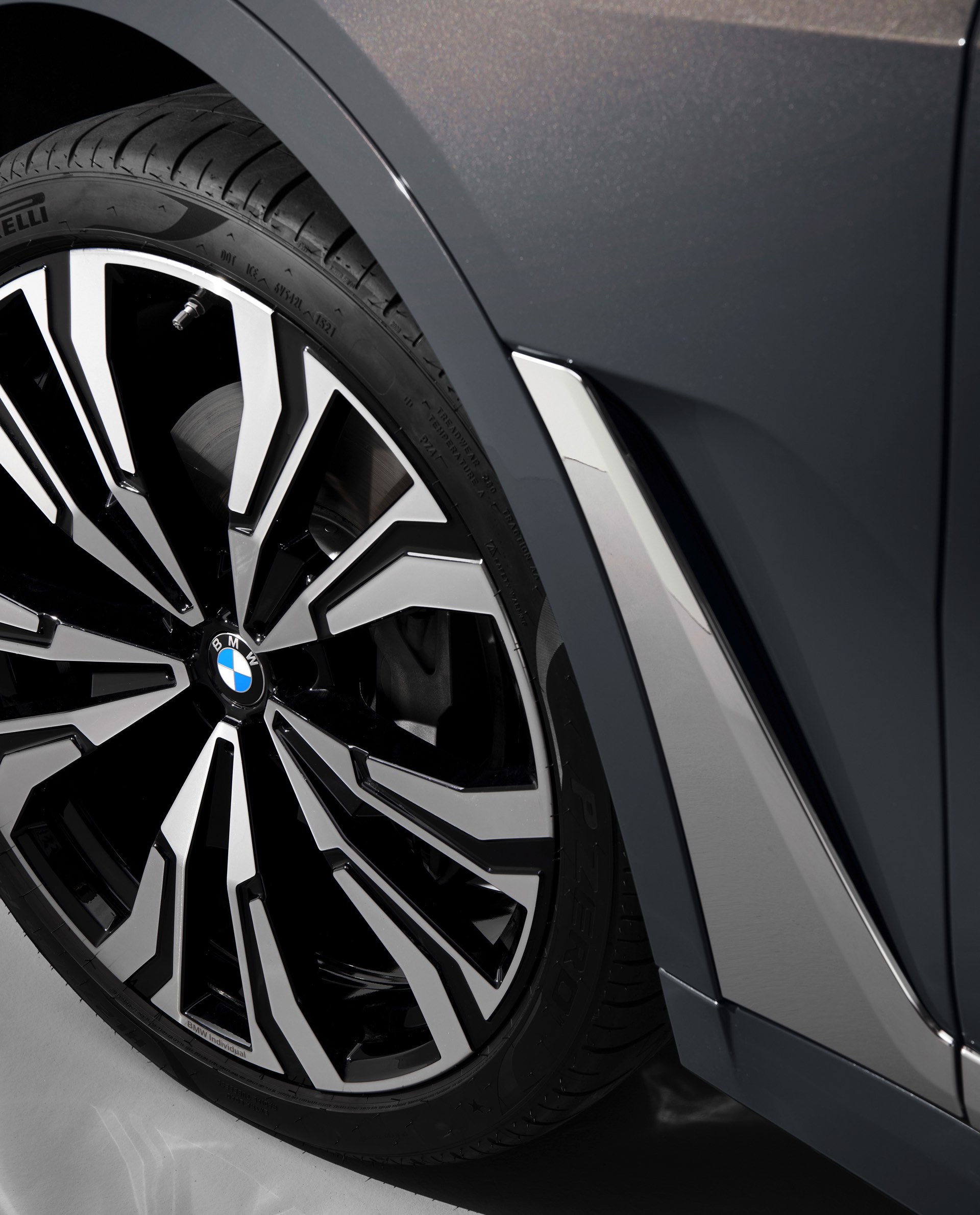 Neuerungen gibt es auch in der Seitenansicht, allerdings sind die großen Hingucker hier nur optional am Start: Erstmals gibt es für einen BMW 23 Zoll-Felgen ab Werk. Was atemberaubend groß klingt, wirkt in natura sehr stimmig: Ein Fahrzeug im Format des BMW X7 lebt ohnehin auf großem Fuß, da sind die 23-Zöller aus dem Individual-Programm durchaus passend. Auf den ersten Fotos sehen wir das Luxus-SUV mit der neuen Lackierung Sparkling Kupfergrau Metallic und im zur Serienausstattung gewordenen Design Pure Excellence, das als einzige Alternative neben dem M Sport-Paket verbleibt. Letzteres sehen wir zunächst nur am Beispiel des BMW X7 M60i, für den exklusiv auch der Farbton Marina Bay Blue angeboten wird.