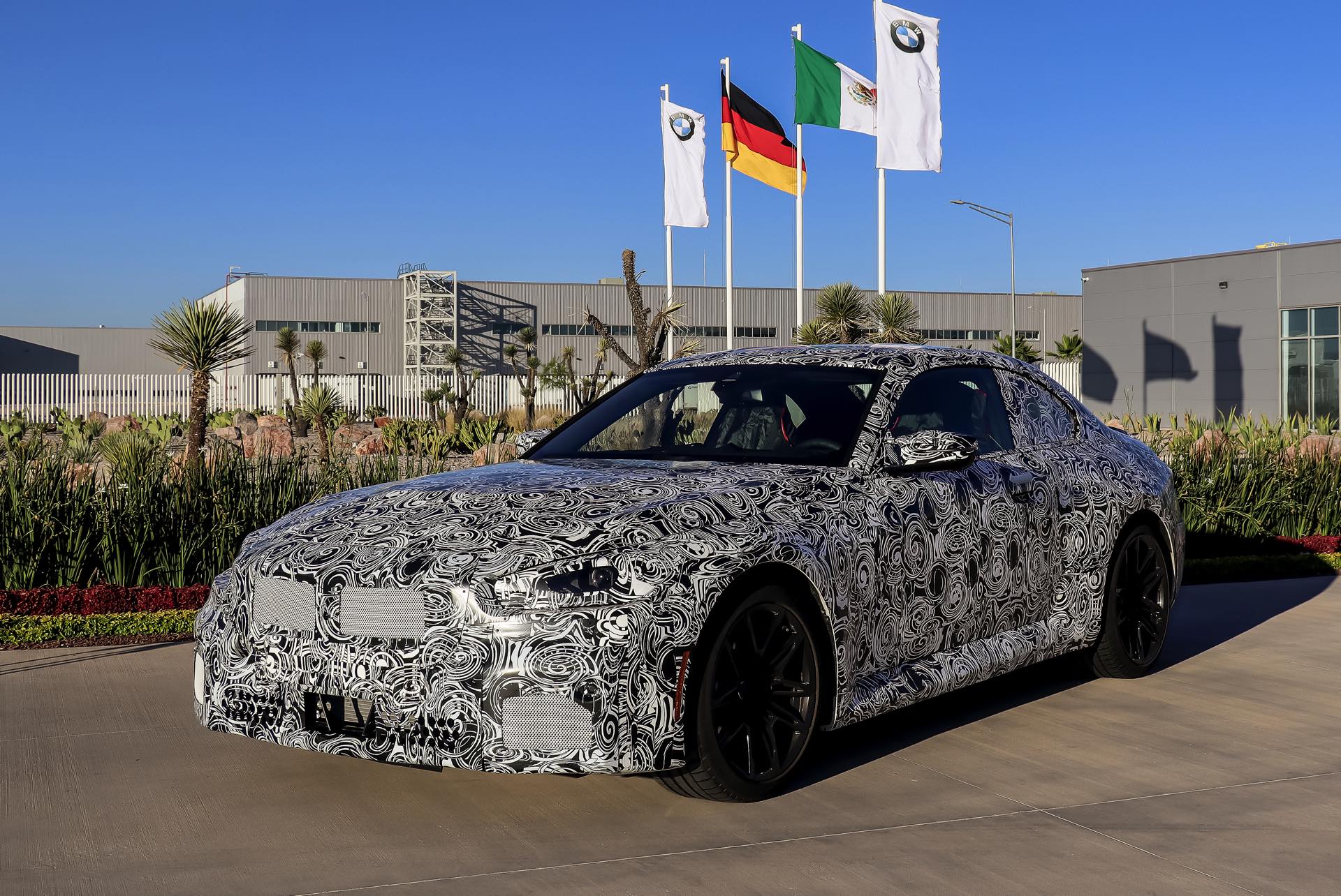 Erste Vorserien-Fahrzeuge werden offenbar schon jetzt in Mexiko gebaut, zumindest gibt es eine Hand voll frischer Erlkönig-Fotos, die vor dem Eingang des Werks entstanden sind. Trotz starker Tarnung lassen sich die verbreiterten vorderen Kotflügel erahnen, schließlich musste hier genügend Raum für die Fahrwerks-Technik von M3 und M4 geschaffen werden. Andere Details wie die M-Außenspiegel und der Powerdome auf der Motorhaube sind prinzipiell schon vom BMW 2er Coupé (G42) bekannt, denn die sportlich gestaltete Haube wird von allen Varianten getragen und die Außenspiegel gibt es auch für das bisherige Topmodell M240i xDrive. "