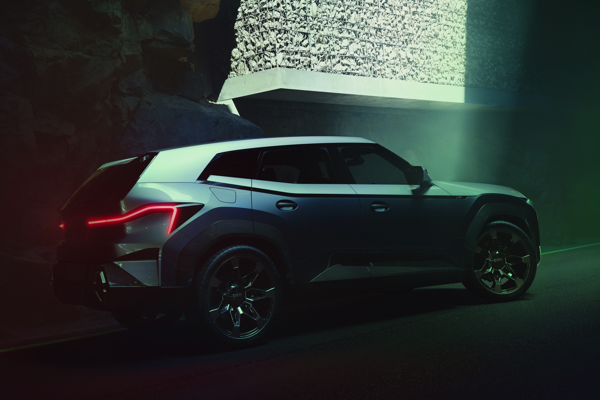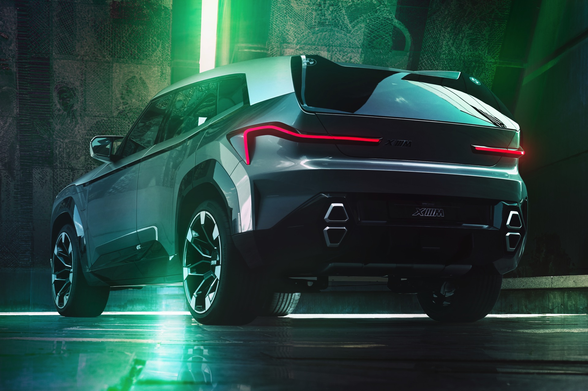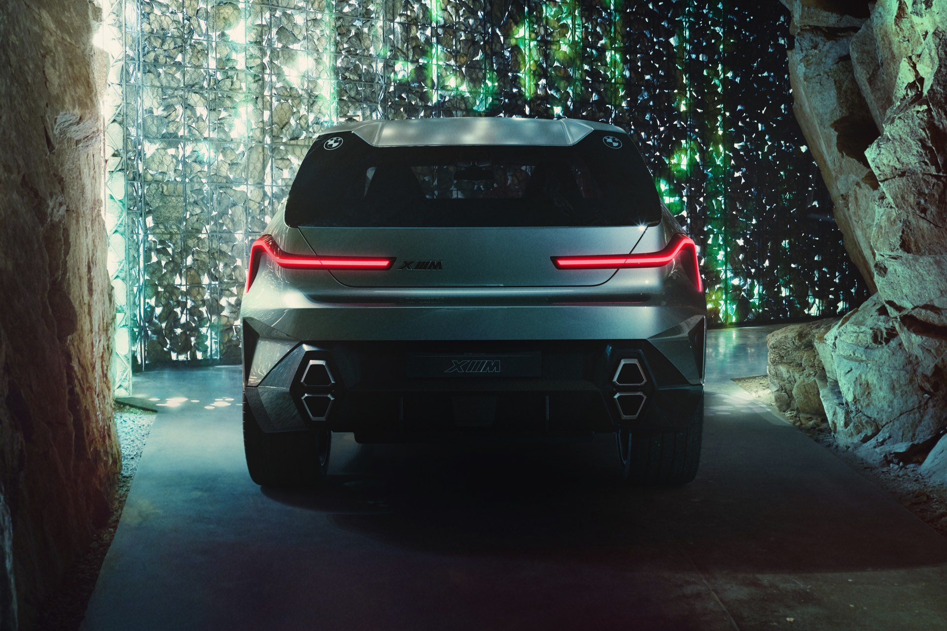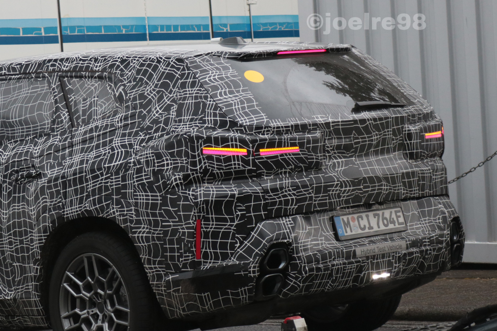 Zum größten Teil überklebt sind die Heckleuchten, deren wesentliche Funktionen offenbar in einem sehr schmalen Streifen stattfinden: Bremslicht und Blinker sind gut erkennbar, obwohl die Beklebung nur wenige Zentimeter Sicht auf die Rückleuchten zulässt. Während oberhalb der Heckscheibe ein integrierter Dachspoiler zu sehen ist, prägen im unteren Bereich die übereinander angeordneten Endrohre das Bild: Das Endrohr-Layout unterscheidet sich von jedem anderen aktuellen oder früheren Serien-BMW und trägt so zur Exklusivität des XM bei.