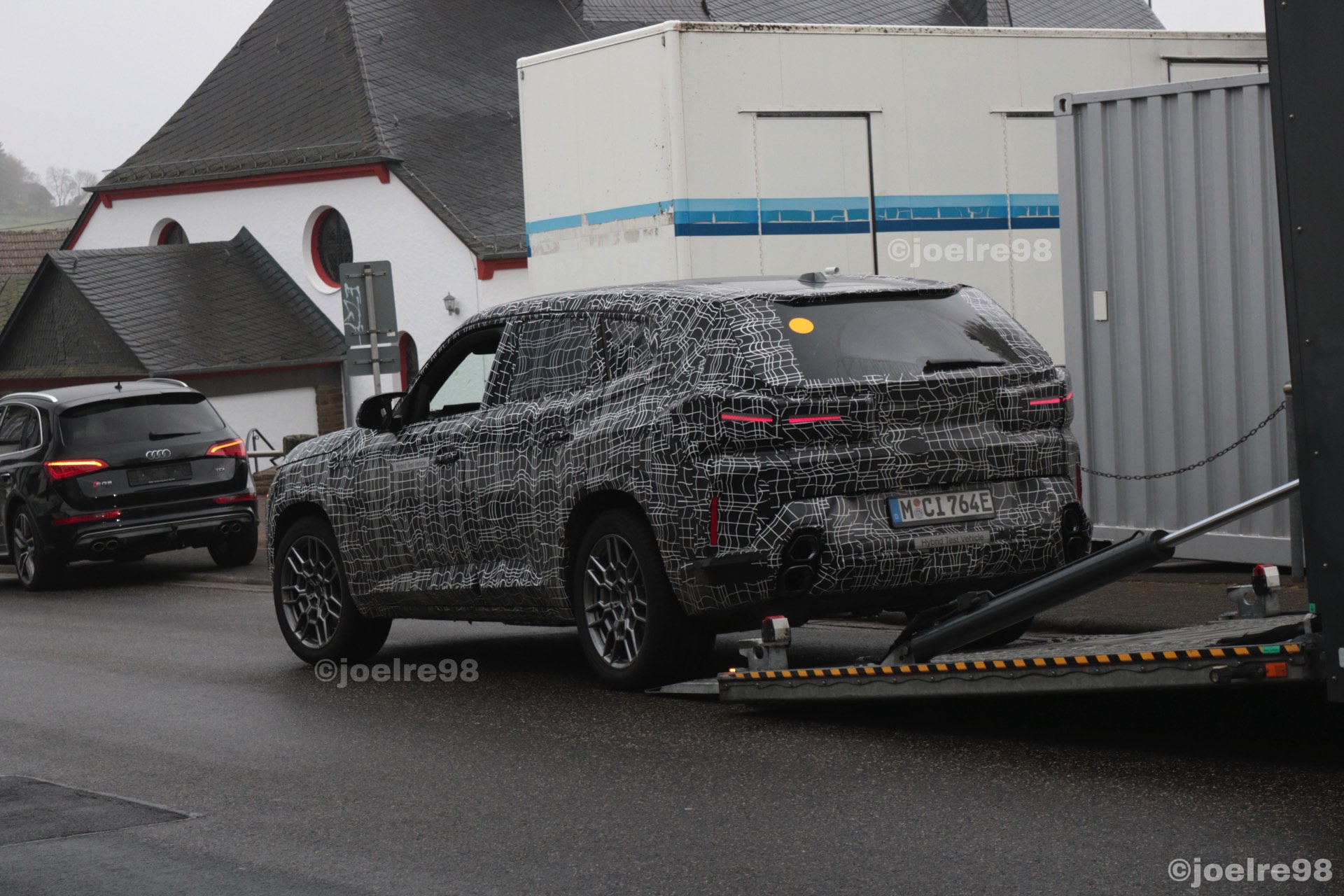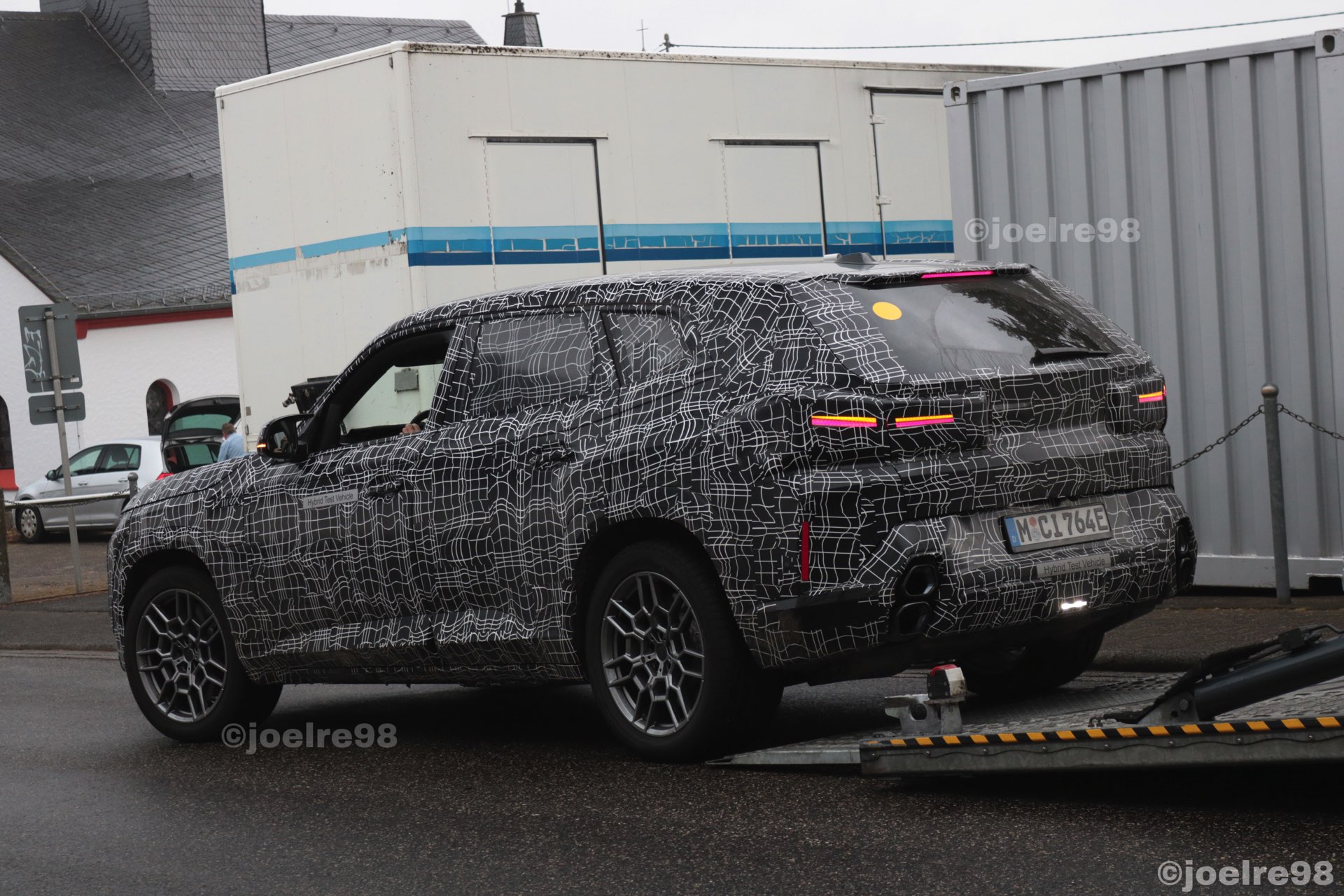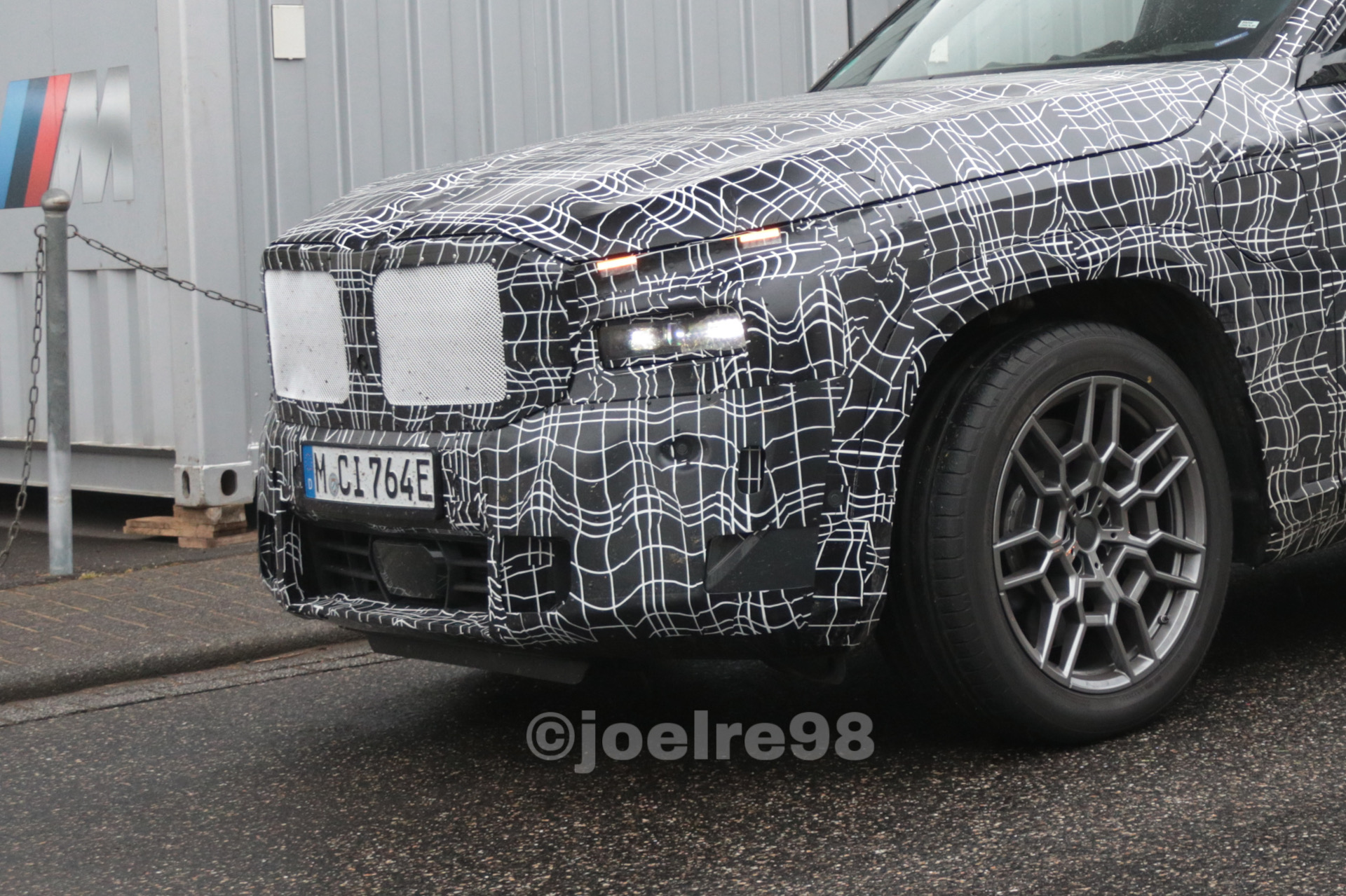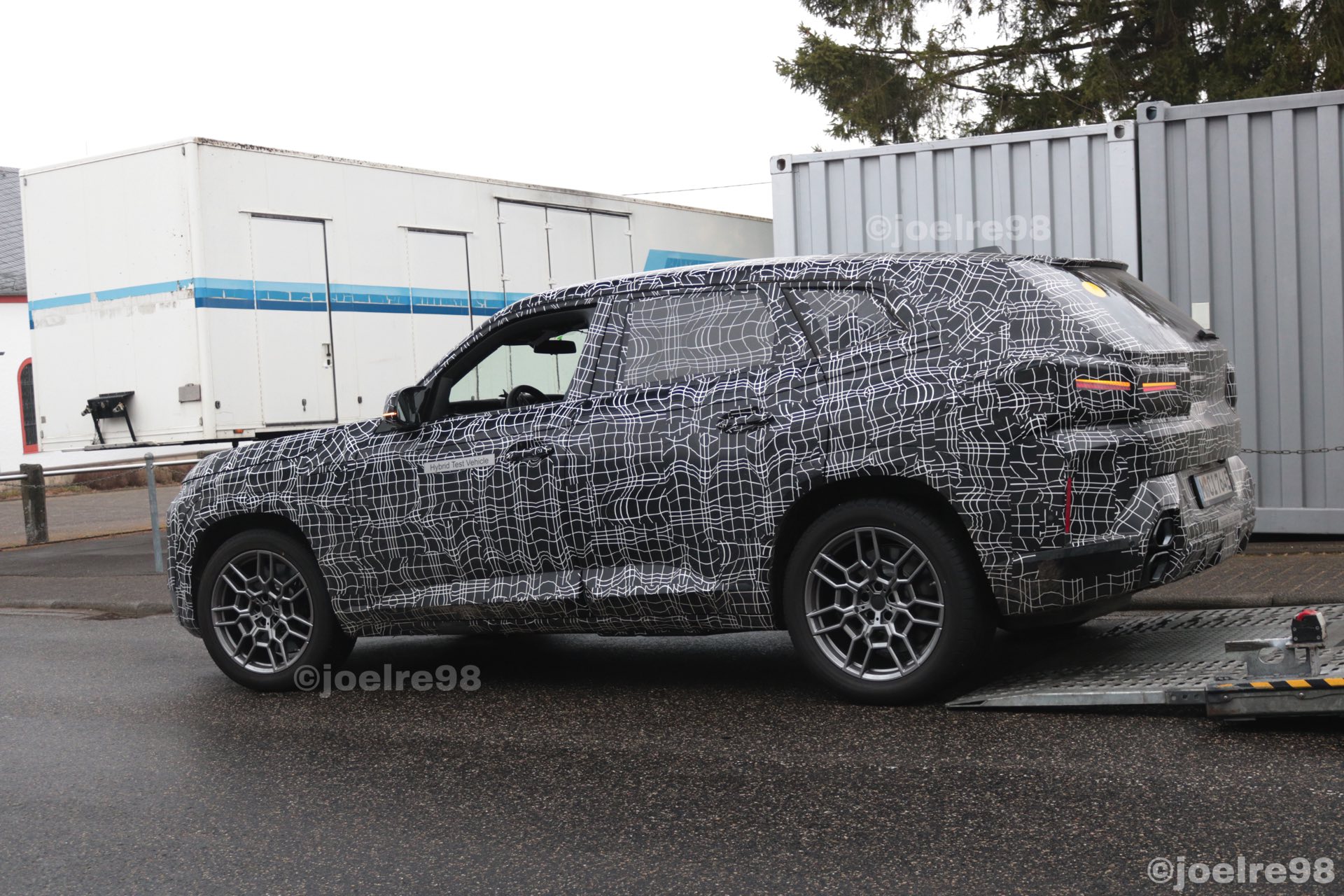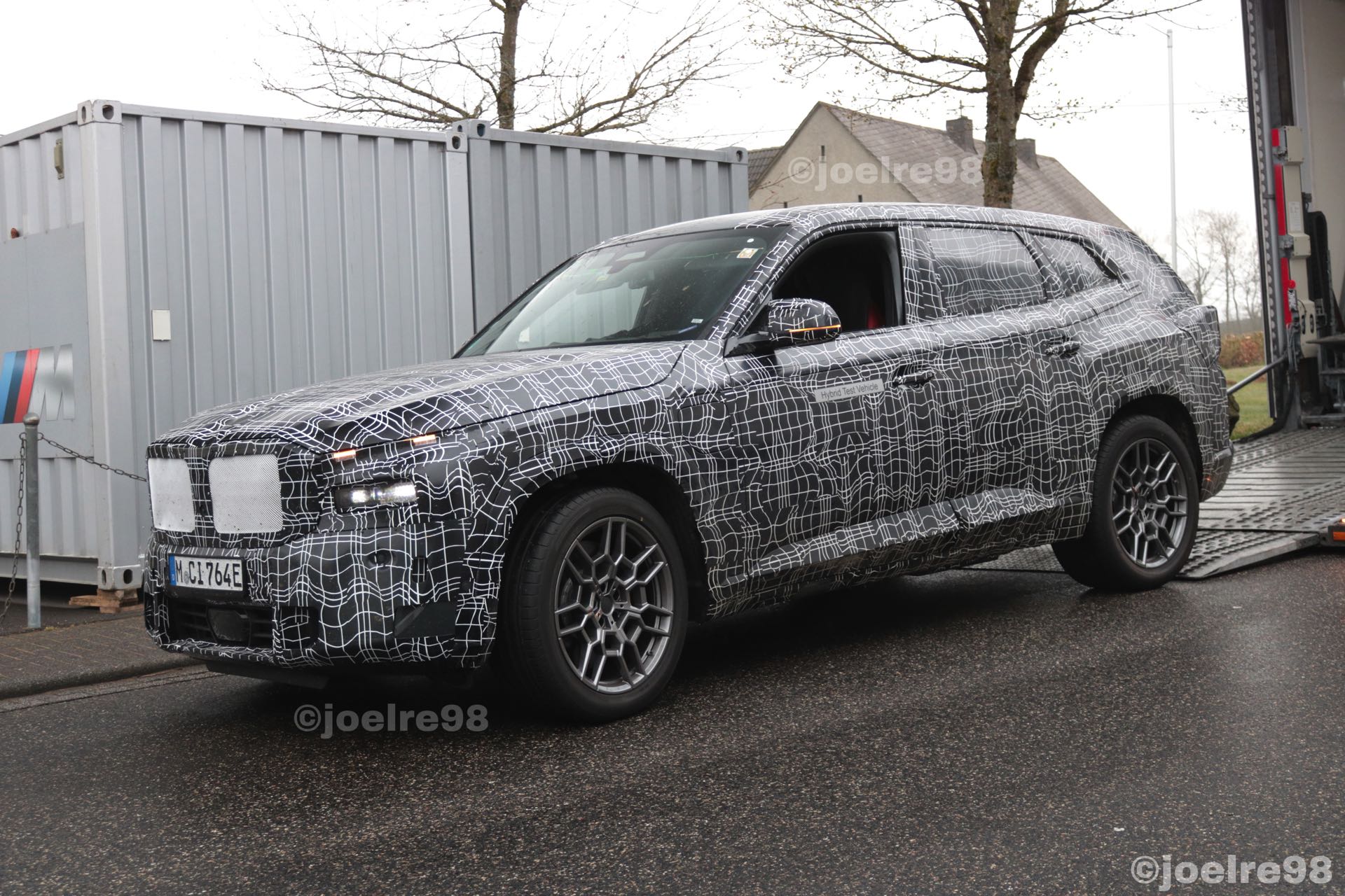 Aus nächster Nähe und daher mit ungewohnt vielen gut erkennbaren Details präsentiert sich der BMW XM auf einigen neuen Erlkönig-Fotos von joelre98. Das offenbar beim Verladen erwischte Power-SUV mit Plug-in-Hybrid-Antrieb trägt zwar weiterhin schwere Tarnung, aber darunter sind viele spannende Details wesentlich klarer als bisher erkennbar: Wir sehen die Split-Headlights mit schmalem LED-Band oben, können auf der Motorhaube eine mittige Vertiefung zur stärkeren Betonung der ohnehin markanten Nieren erkennen und natürlich trägt der Prototyp auch gut sichtbare M-Außenspiegel mit integrierten LED-Blinkern.