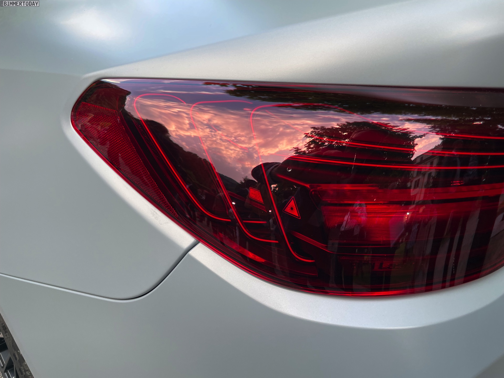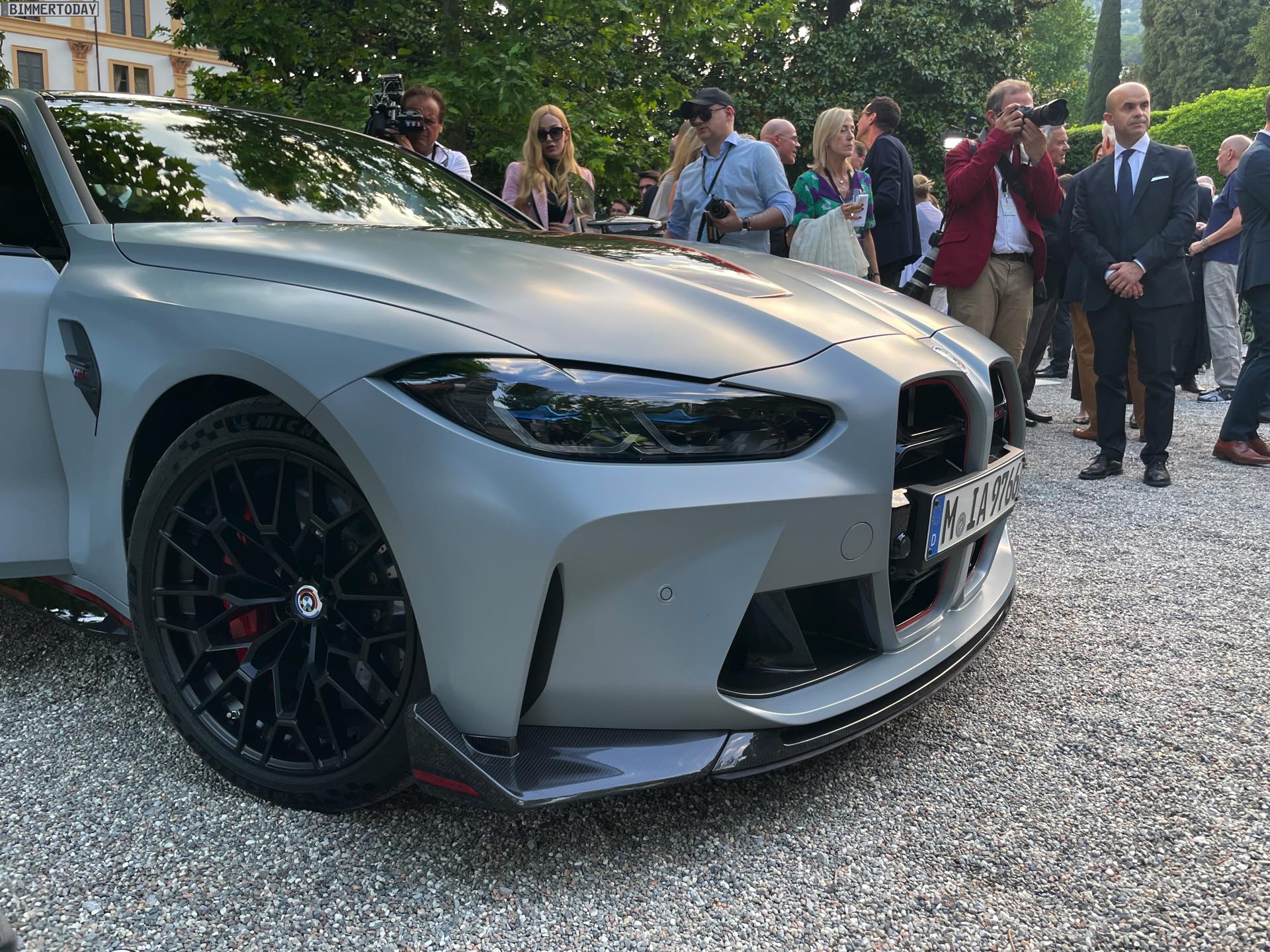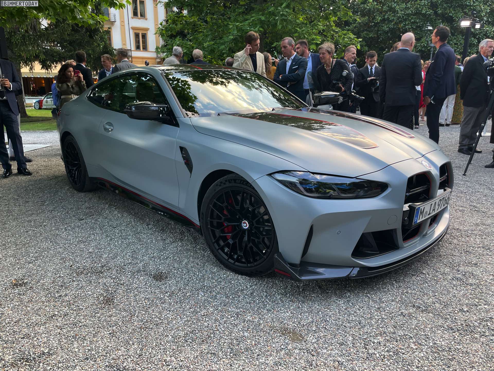 Wenige Stunden nach der ersten Vorstellung des BMW M4 CSL wurde die Power-Variante des G82 im Rahmen des Concorso d’Eleganza Villa d’Este erstmals unter freiem Himmel der Öffentlichkeit präsentiert. Unsere Live-Fotos zeigen das 550 PS starke Tracktool mit Straßenzulassung in der Launch-Farbe Frozen Brooklyn Grey, die laut internen Kalkulationen der M GmbH an mindestens 80 Prozent der weltweit 1.000 Einheiten aufgebracht werden dürfte. Alternativ zum matten Grau stehen nur Alpinweiß und Saphirschwarz zur Wahl, wodurch die rot akzentuierten CSL-Details in jedem Fall sehr sichtbar sein werden. Absoluter Hingucker sind aber gerade in der Dämmerung die gelben Elemente der Laserlicht-Scheinwerfer vorn sowie die filigran gezeichneten Grafiken der Laser-Heckleuchten.