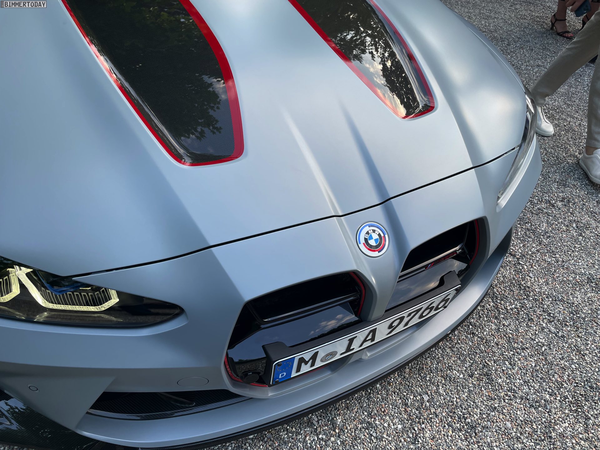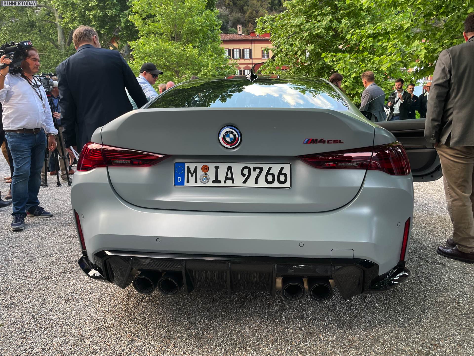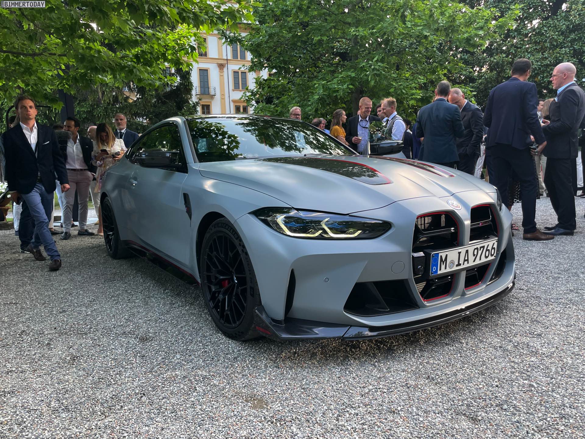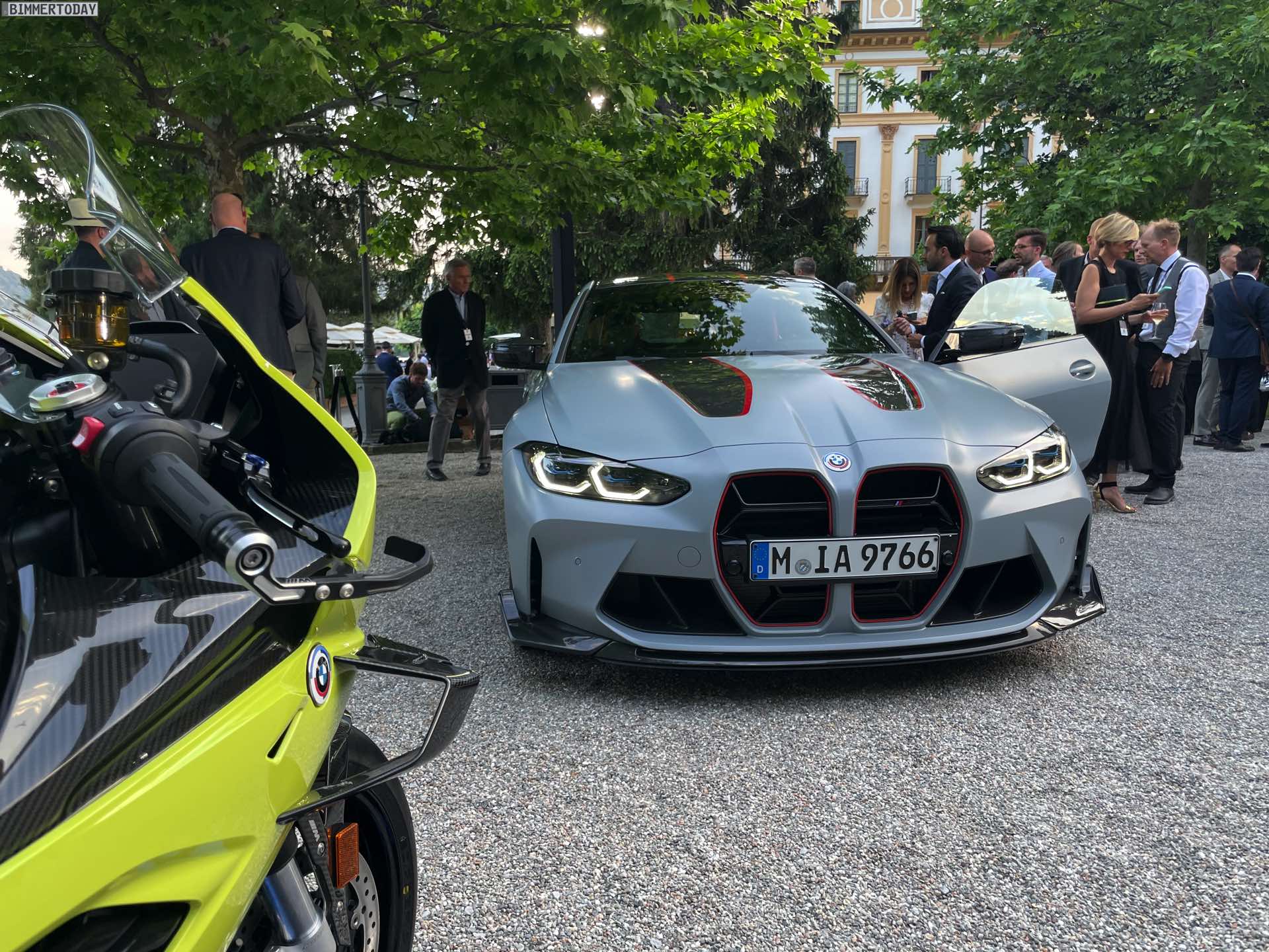 Wenige Stunden nach der ersten Vorstellung des BMW M4 CSL wurde die Power-Variante des G82 im Rahmen des Concorso d’Eleganza Villa d’Este erstmals unter freiem Himmel der Öffentlichkeit präsentiert. Unsere Live-Fotos zeigen das 550 PS starke Tracktool mit Straßenzulassung in der Launch-Farbe Frozen Brooklyn Grey, die laut internen Kalkulationen der M GmbH an mindestens 80 Prozent der weltweit 1.000 Einheiten aufgebracht werden dürfte. Alternativ zum matten Grau stehen nur Alpinweiß und Saphirschwarz zur Wahl, wodurch die rot akzentuierten CSL-Details in jedem Fall sehr sichtbar sein werden. Absoluter Hingucker sind aber gerade in der Dämmerung die gelben Elemente der Laserlicht-Scheinwerfer vorn sowie die filigran gezeichneten Grafiken der Laser-Heckleuchten.