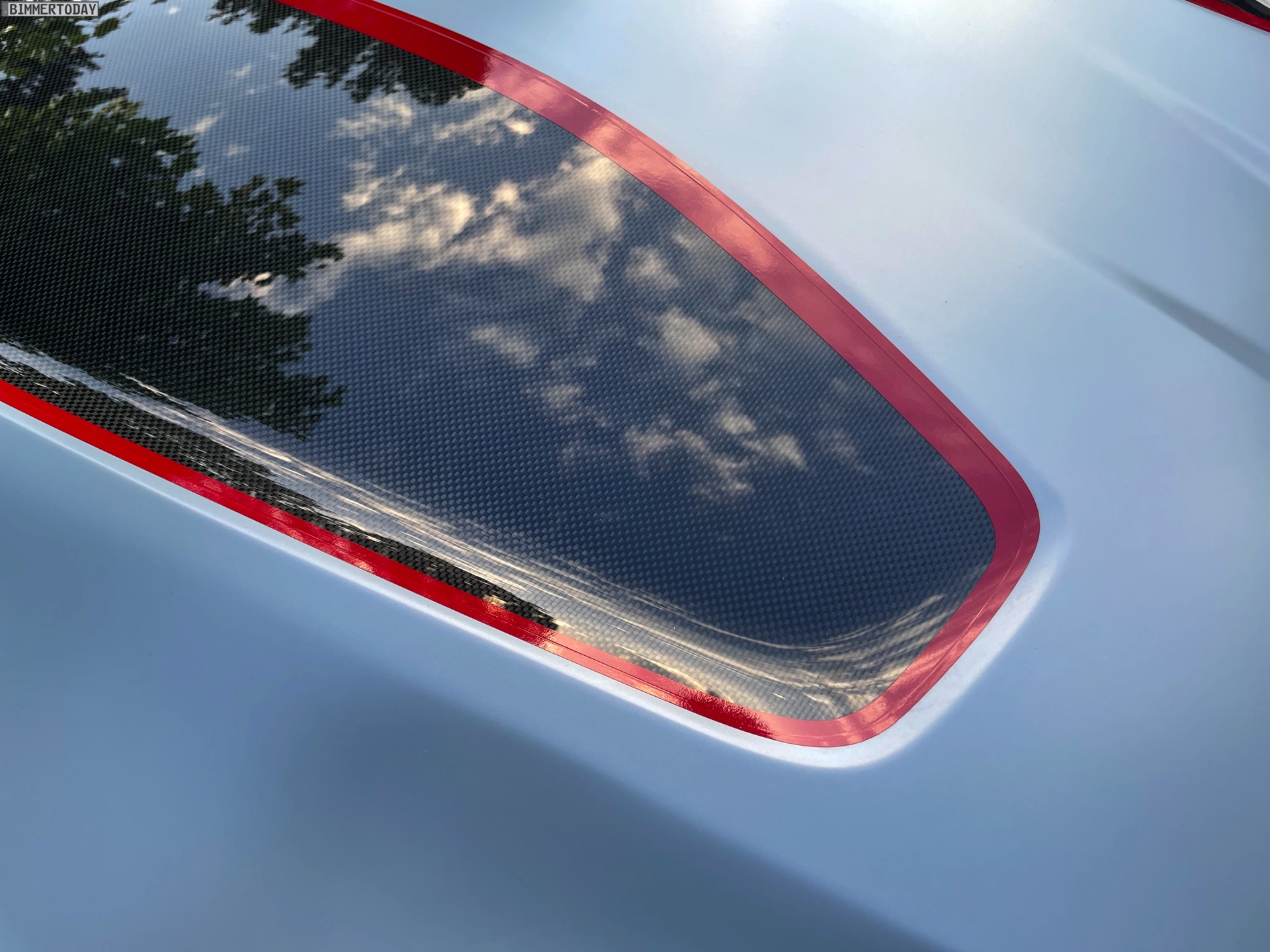 Neben Frozen Brooklyn Grey, gelben Scheinwerfern und roten Akzenten ist es vor allem der typische Carbon-Look, der den Auftritt des BMW M4 CSL am Comer See prägt: Nicht nur der Frontsplitter, die Außenspiegel, der Diffusor am Heck und natürlich das Dach, auch die Motorhaube besteht zum Teil sichtbar aus Carbon. Im Fall der Heckklappe ist der leichte Hightech-Werkstoff zwar ebenfalls das Mittel der Wahl, sichtbar wird dieser Umstand aber nur bei geöffneter Kofferraumhaube. Vollkommen unübersehbar ist hingegen der charakteristische Bürzel, der sich aus dem in die Heckklappe integrierten Spoiler ergibt und alles andere als zufällig an den M3 CSL der Generation E46 erinnert. Beachtlich: Allein durch die Carbon-Heckklappe spart der BMW M4 CSL gegenüber einem gewöhnlichen 6,4 Kilogramm Gewicht ein.