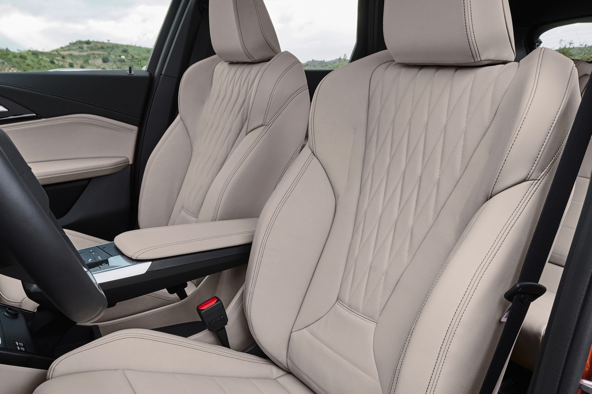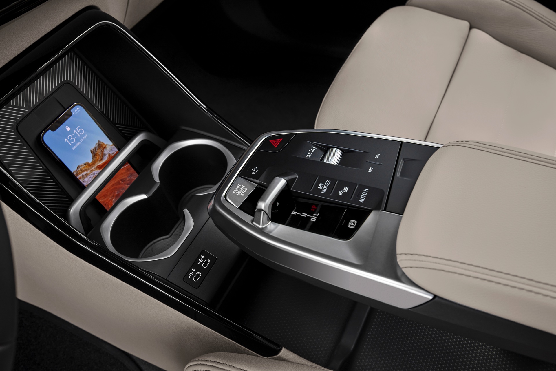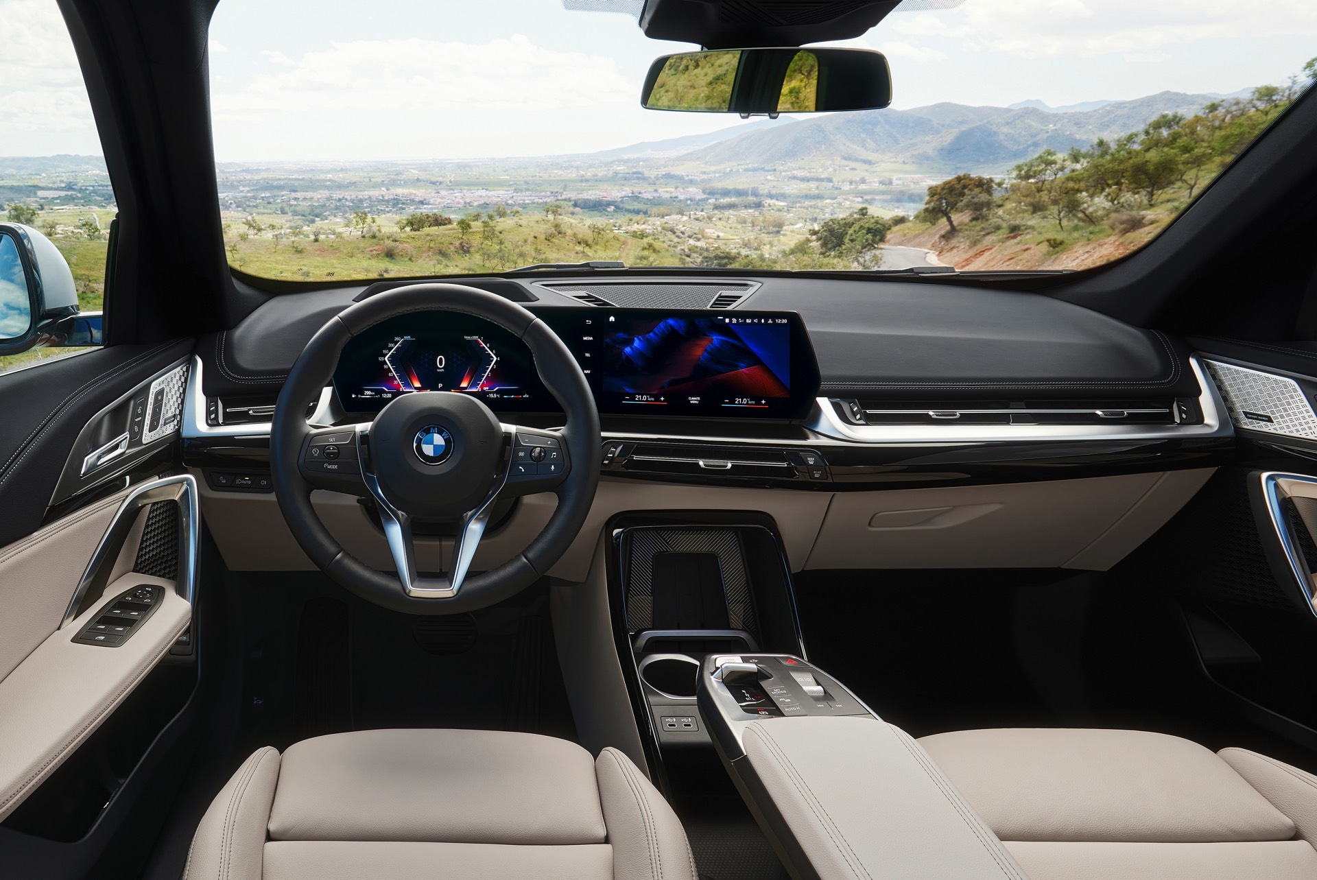 Auffällig ist auch die Mittelkonsole, die ohne iDrive-Controller und auch ohne klassischen Wählhebel für das serienmäßige 7-Gang-Doppelkupplungs-Getriebe auskommt, stattdessen findet sich nur eine kleine Wippe zur Wahl der Fahrstufe. Generell sind echte Knöpfe Mangelware an Bord des BMW X1 (U11): Die Entwickler verweisen auf die Sprachsteuerung per BMW Intelligent Personal Assistant (“Hey, BMW…”) sowie die erweiterten Touch-Funktionalitäten, die neben den eingeblendeten Buttons auch das Einblenden von Zusatzmenüs durch Wischgesten vom Bildschirmrand erlauben.