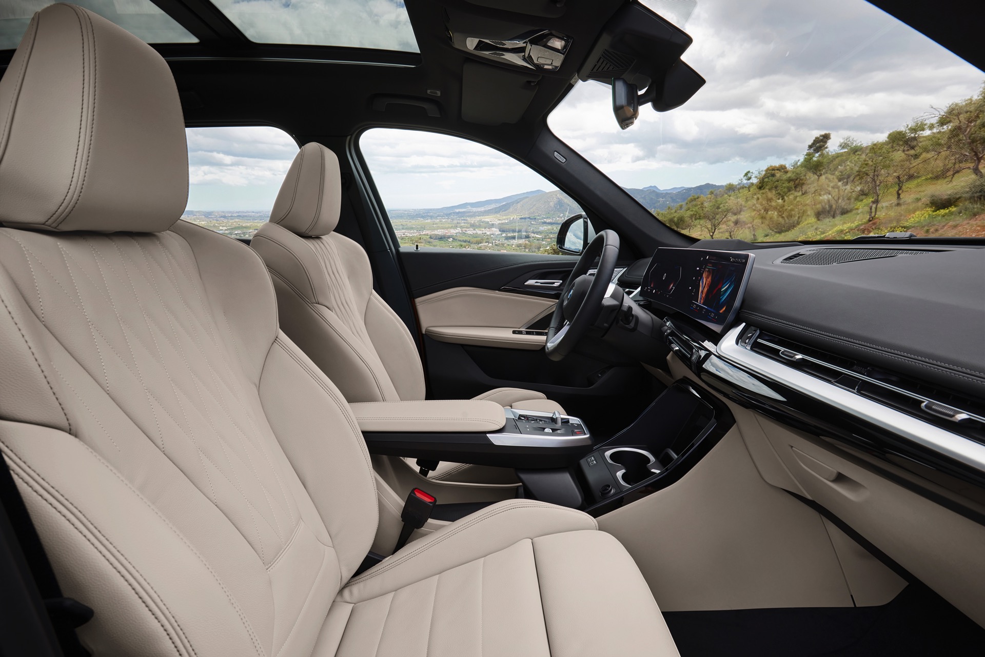 Im Innenraum wird serienmäßig das Curved Display samt iDrive 8 als prägendes Element verbaut, genau wie im 2er Active Tourer kommt es in einer Fassung mit 10,25 Zoll links und 10,7 Zoll rechts zum Einsatz. Ergänzt wird es optional von einem Head-up-Display, das anders als im technisch eng verwandten Familien-Van aufgrund der steiler stehenden Frontscheibe ohne kleine HUD-Scheibe auskommt und seine Infos stattdessen direkt ins Blickfeld des Fahrers projiziert.
