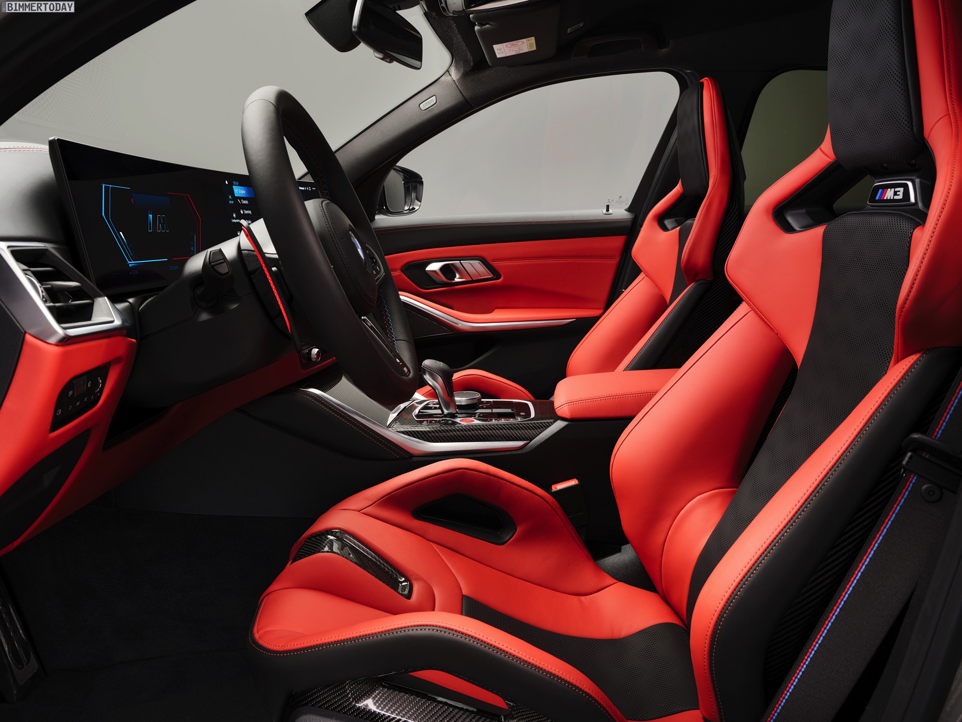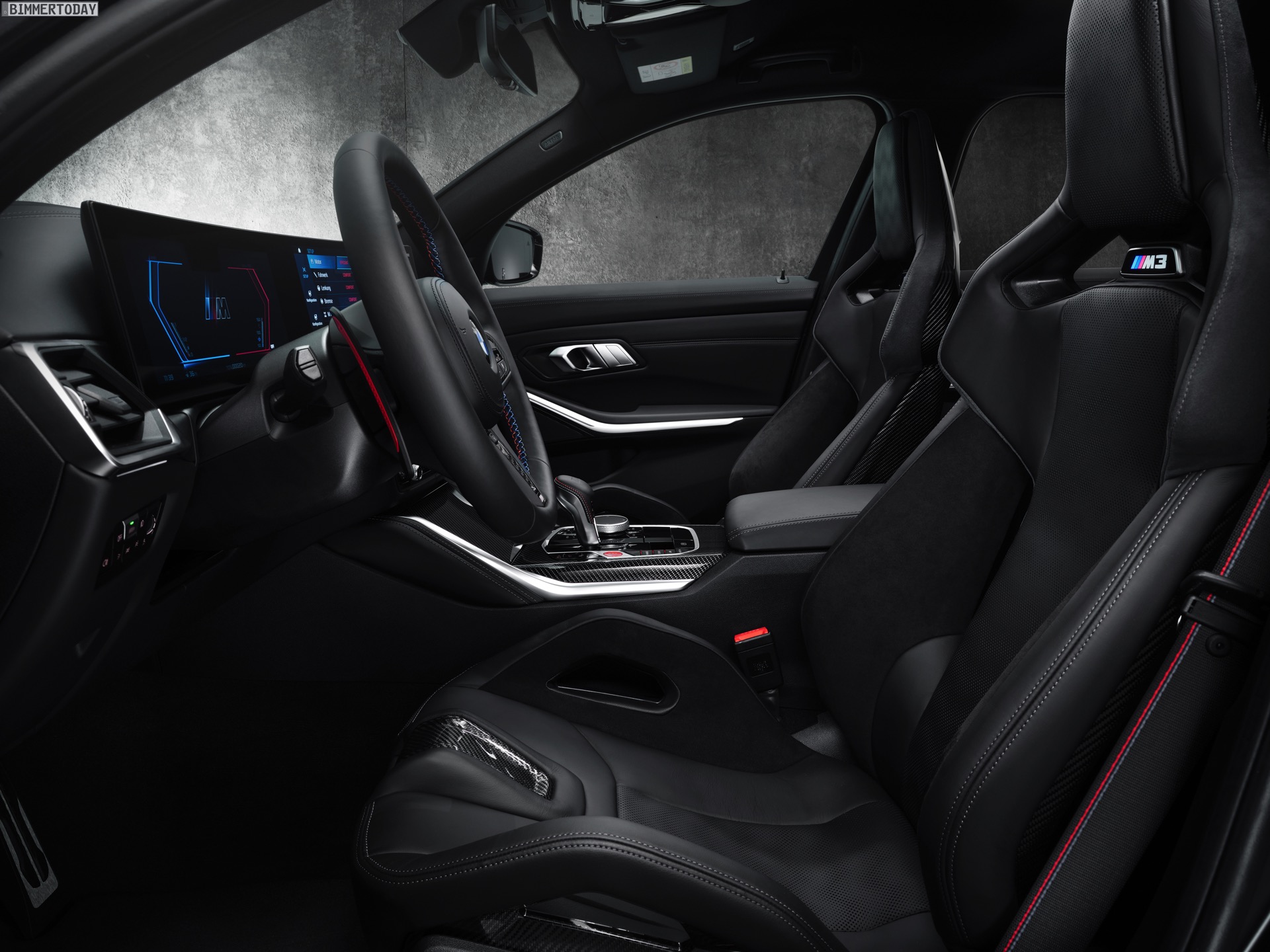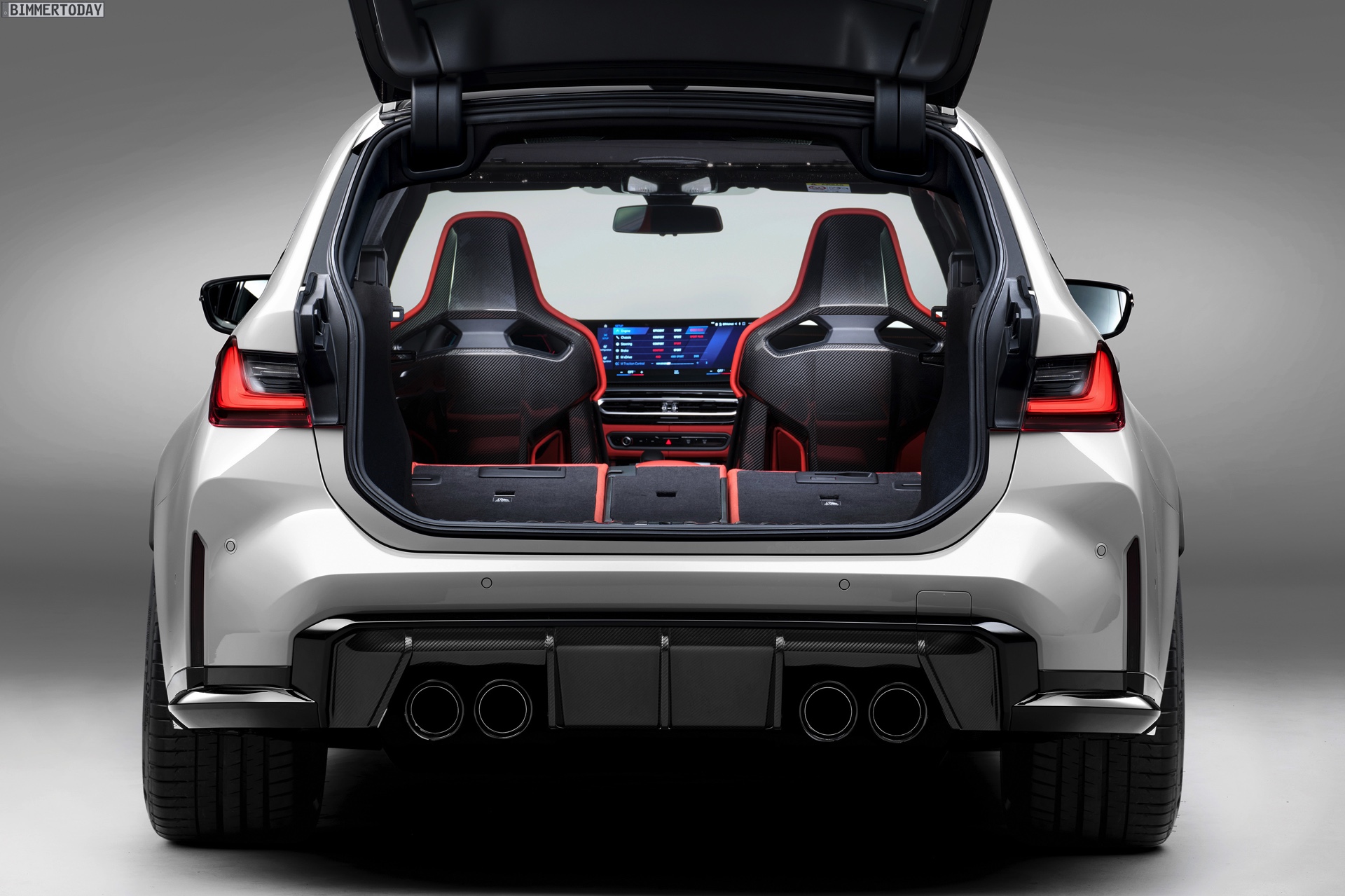 Highlight im Innenraum ist nicht nur der bis zu 1.500 Liter große Kofferraum, der jeden bisherigen M3 klar in den Schatten stellt, sondern natürlich auch das neue Curved Display mit M-spezifischen Anzeigen. Wie in jedem anderen M3 sind auch für den Touring die M Carbon-Schalensitze erhältlich, die schon auf den ersten Blick auf die sportlichen Ambitionen des Fahrzeugs hinweisen. Viel Carbon, roter Lack für Startknopf und M1- und M2-Knöpfe am Lenkrad sowie der M-Wählhebel für die Achtgang-Automatik runden den Look stilsicher ab.
