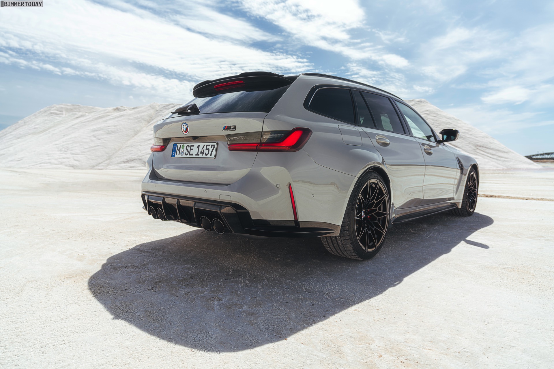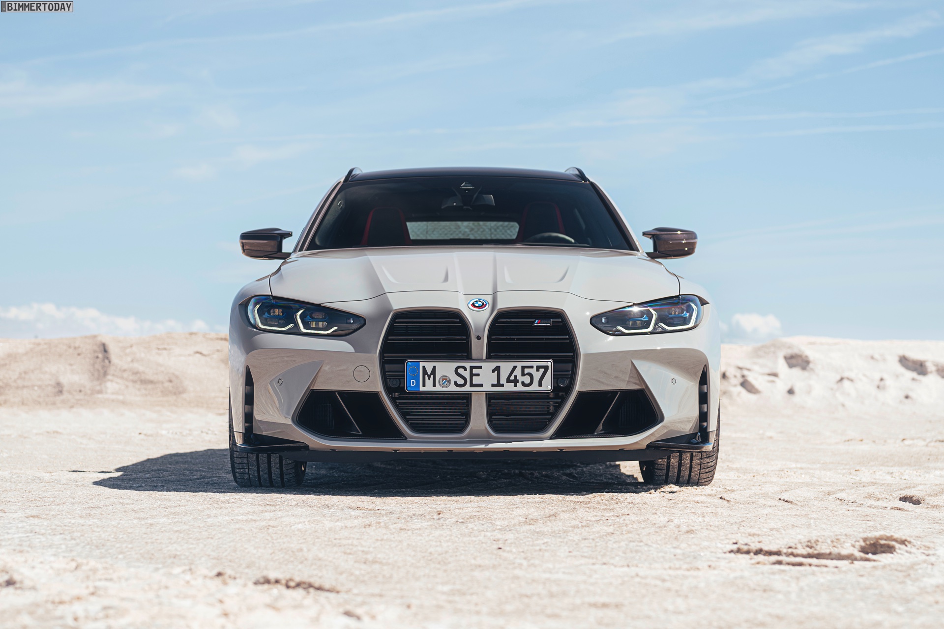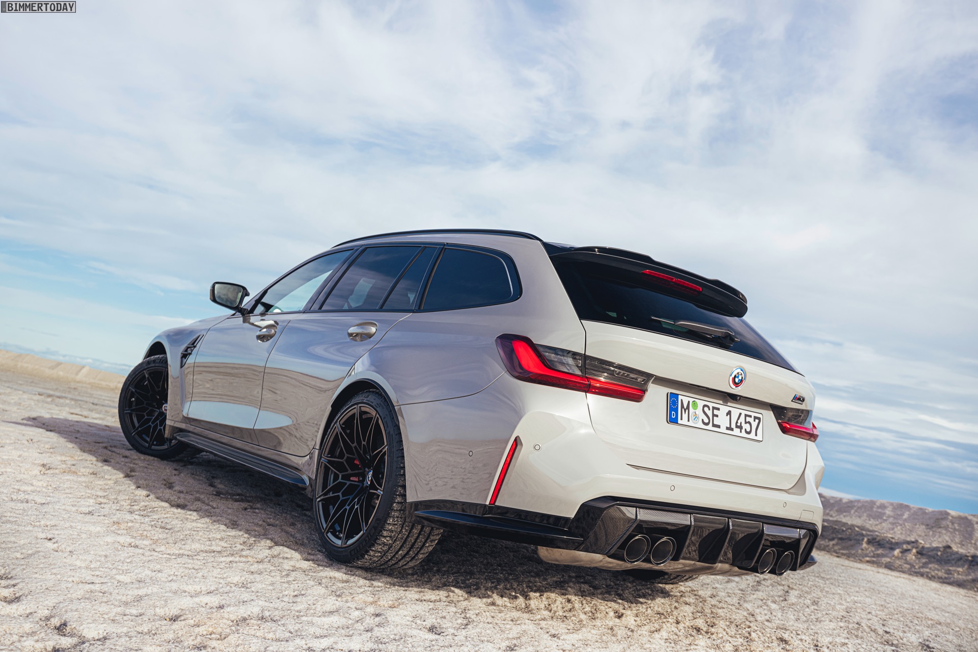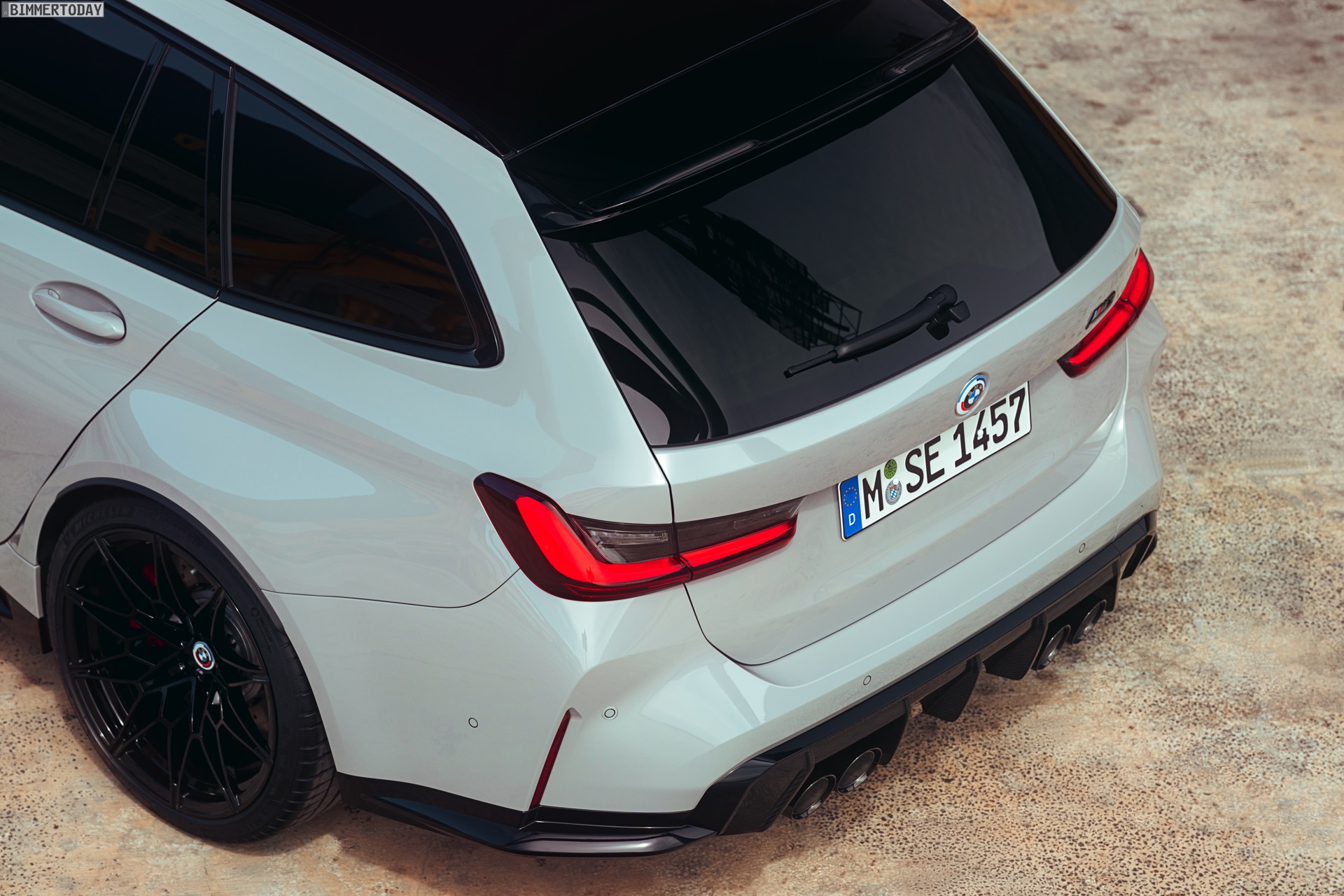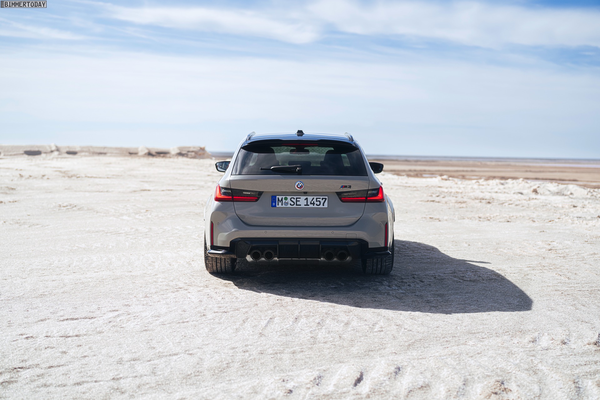 Anders sieht es beim Design des Power-Kombis aus, denn jetzt gibt es endlich offizielle Bilder zum BMW M3 Touring (G81). Auf den ersten Fotos sehen wir die Garchinger Interpretation des aktuellen 3er Touring (G21 LCI) mit Individual-Lackierung in Kreide, aber spannender als die Farbe ist in diesem Fall natürlich das Heck – und dessen Anblick überzeugt auf ganzer Linie: Die deutlich verbreiterten Kotflügel harmonieren perfekt mit dem Kombi-Heck, auch der dunkel abgesetzte Diffusor und die vier mächtigen Endrohre sind erstklassig integriert. Eher dezent fällt die zusätzliche Spoilerlippe auf dem Dachkanten-Spoiler aus, die den Abtrieb an der Hinterachse im Hochgeschwindigkeits-Bereich noch ein wenig erhöht. An der Front gleicht der BMW M3 Touring wie erwartet der M3 Limousine (G80).