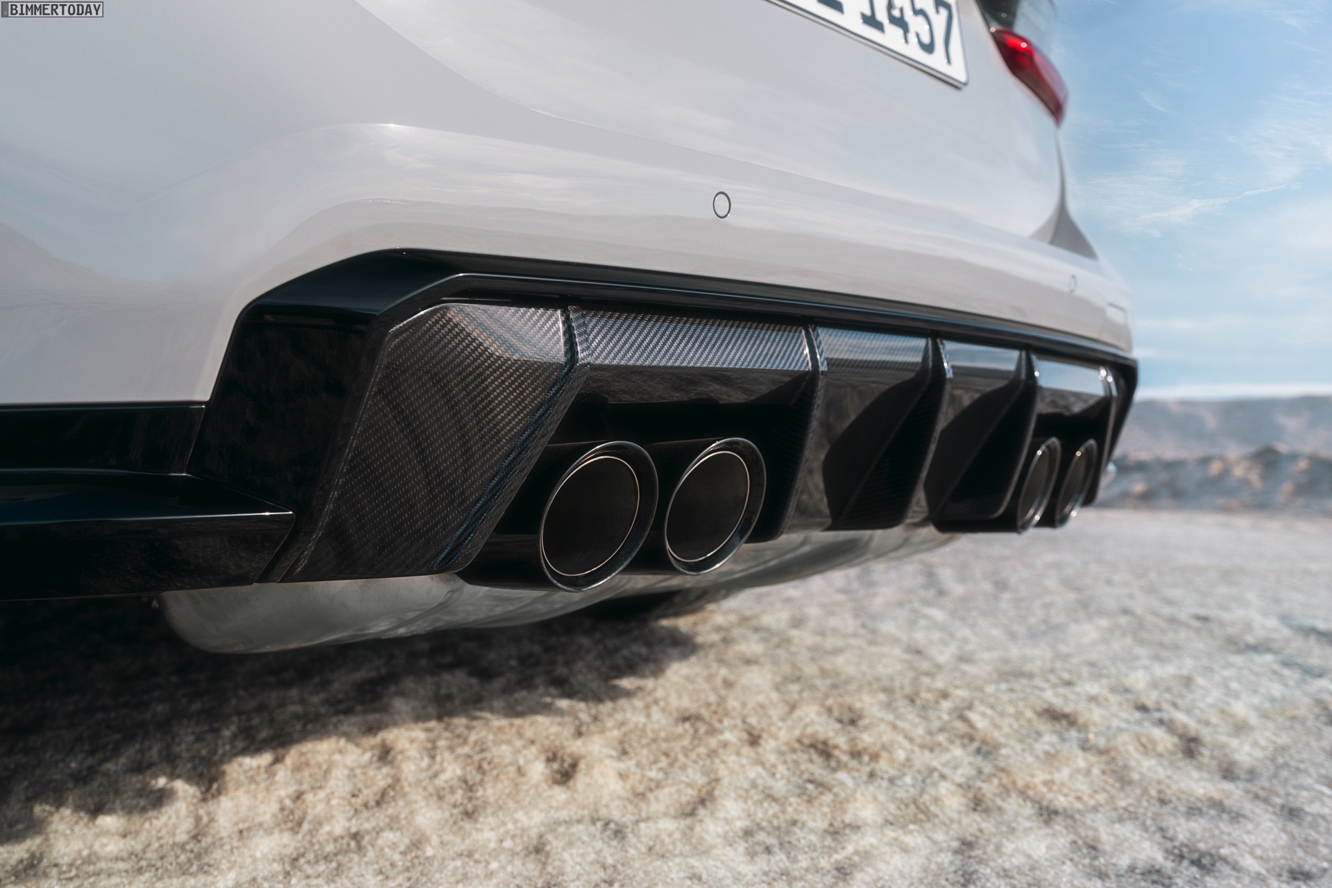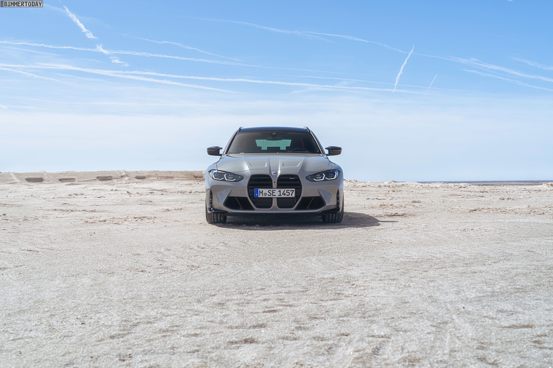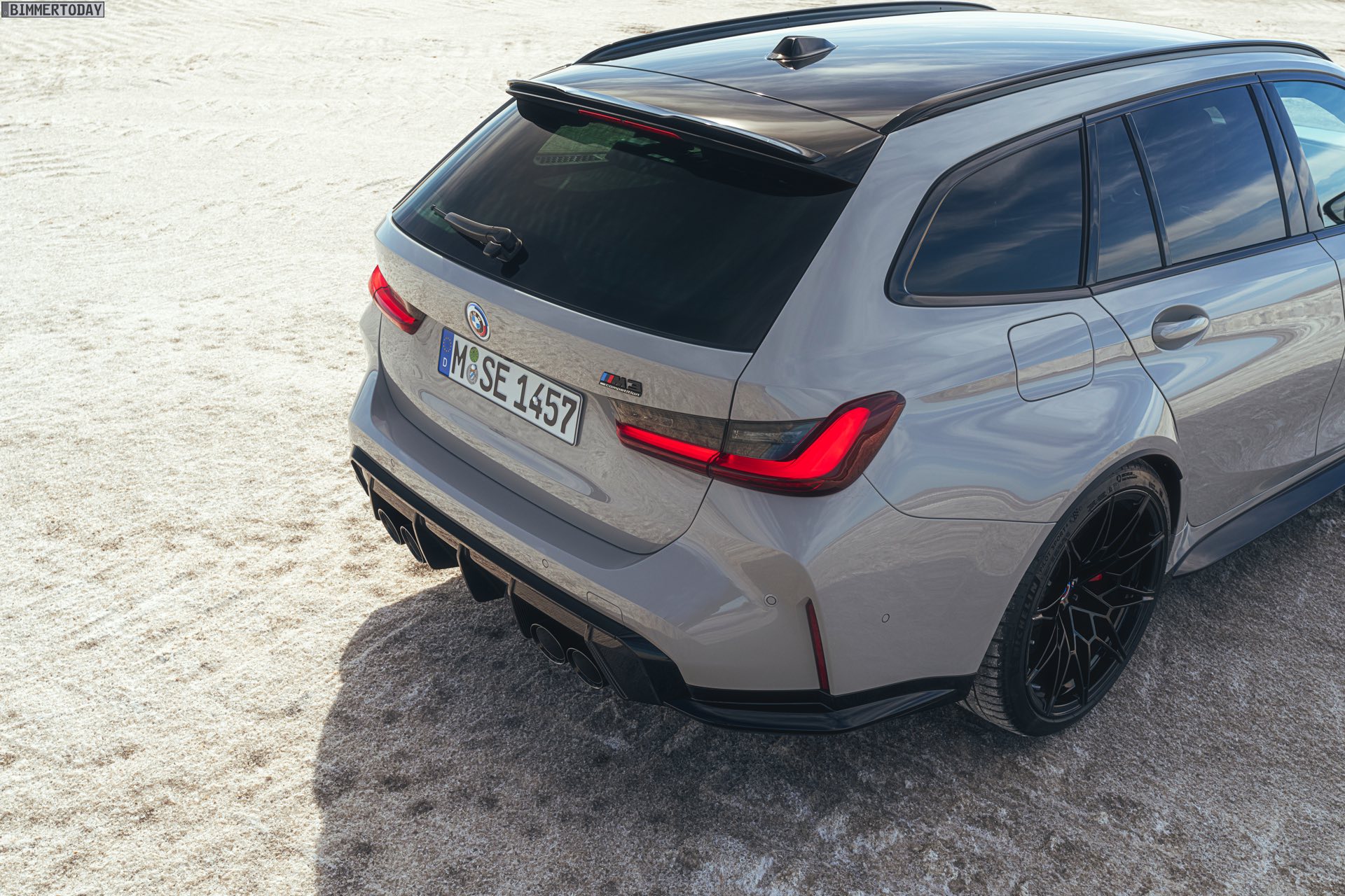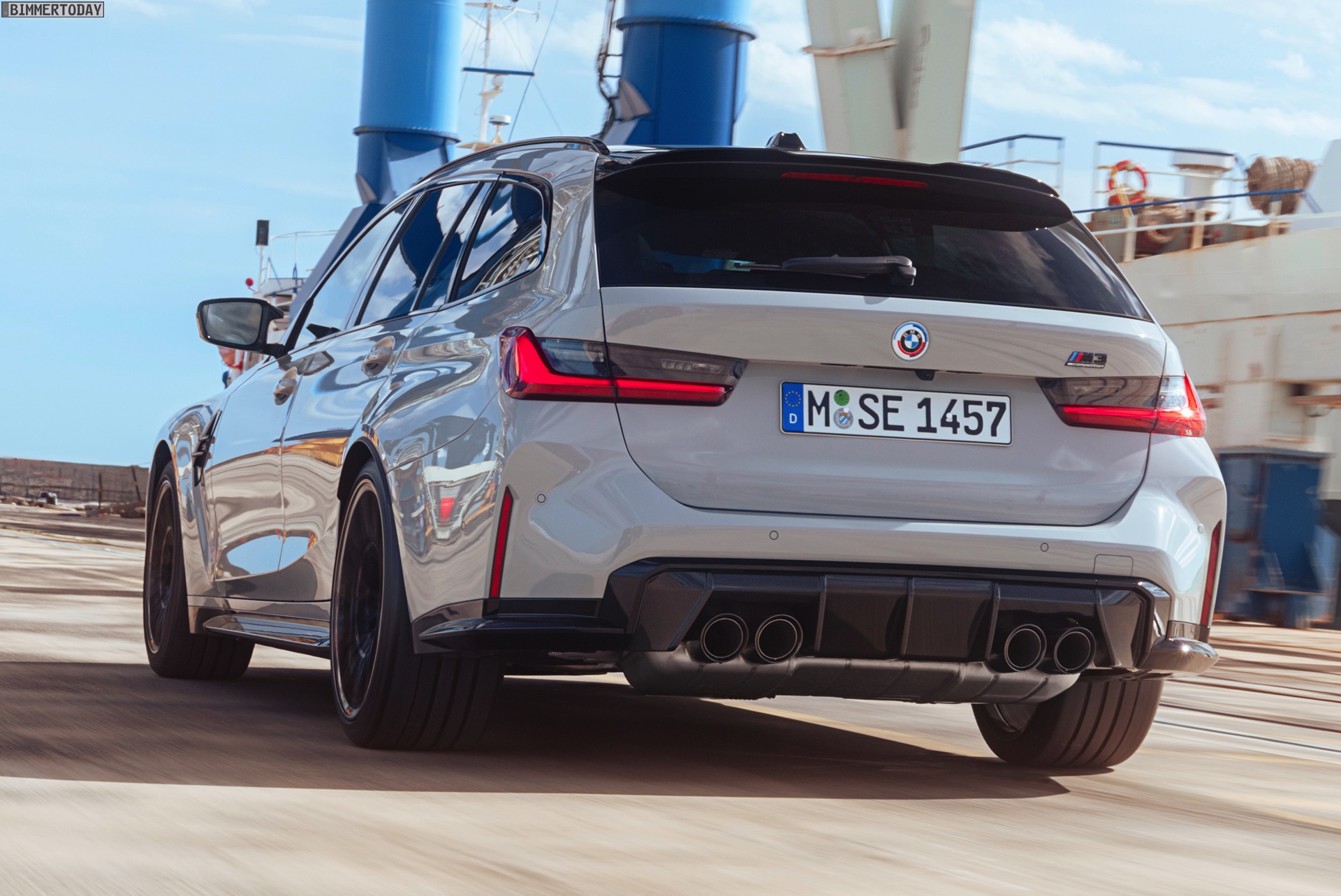 Anders sieht es beim Design des Power-Kombis aus, denn jetzt gibt es endlich offizielle Bilder zum BMW M3 Touring (G81). Auf den ersten Fotos sehen wir die Garchinger Interpretation des aktuellen 3er Touring (G21 LCI) mit Individual-Lackierung in Kreide, aber spannender als die Farbe ist in diesem Fall natürlich das Heck – und dessen Anblick überzeugt auf ganzer Linie: Die deutlich verbreiterten Kotflügel harmonieren perfekt mit dem Kombi-Heck, auch der dunkel abgesetzte Diffusor und die vier mächtigen Endrohre sind erstklassig integriert. Eher dezent fällt die zusätzliche Spoilerlippe auf dem Dachkanten-Spoiler aus, die den Abtrieb an der Hinterachse im Hochgeschwindigkeits-Bereich noch ein wenig erhöht. An der Front gleicht der BMW M3 Touring wie erwartet der M3 Limousine (G80).