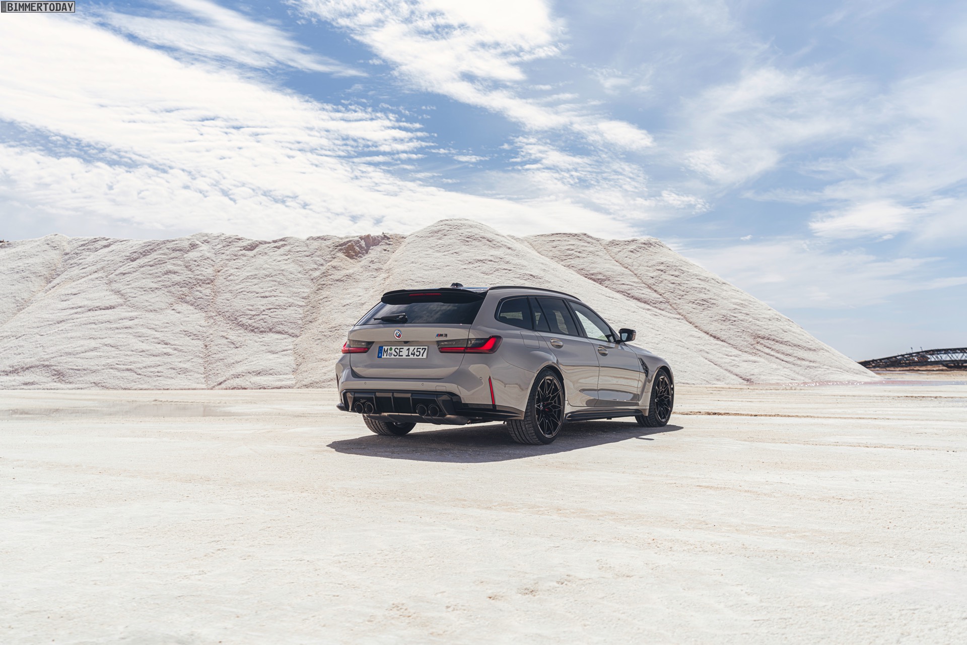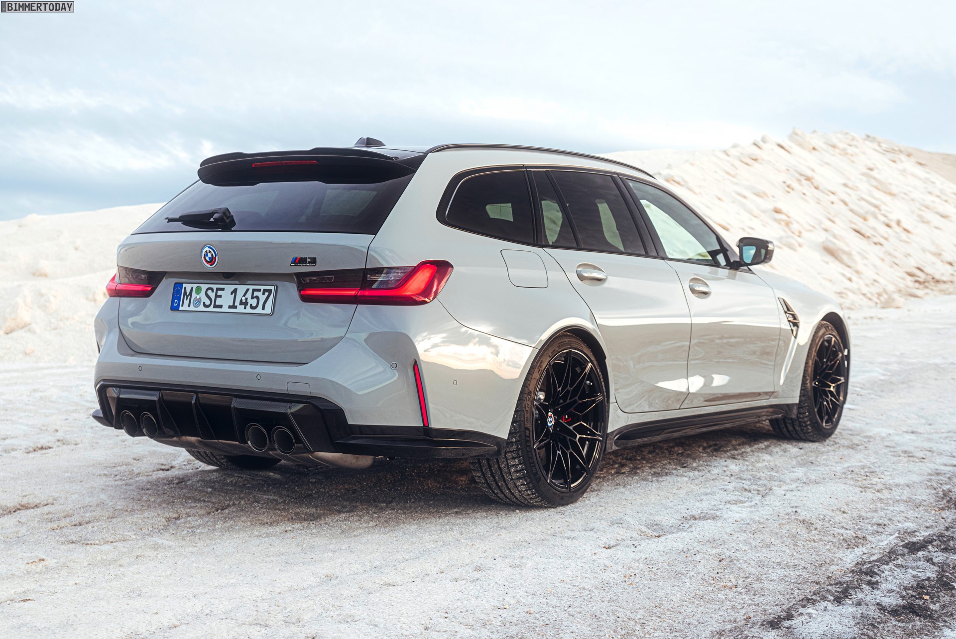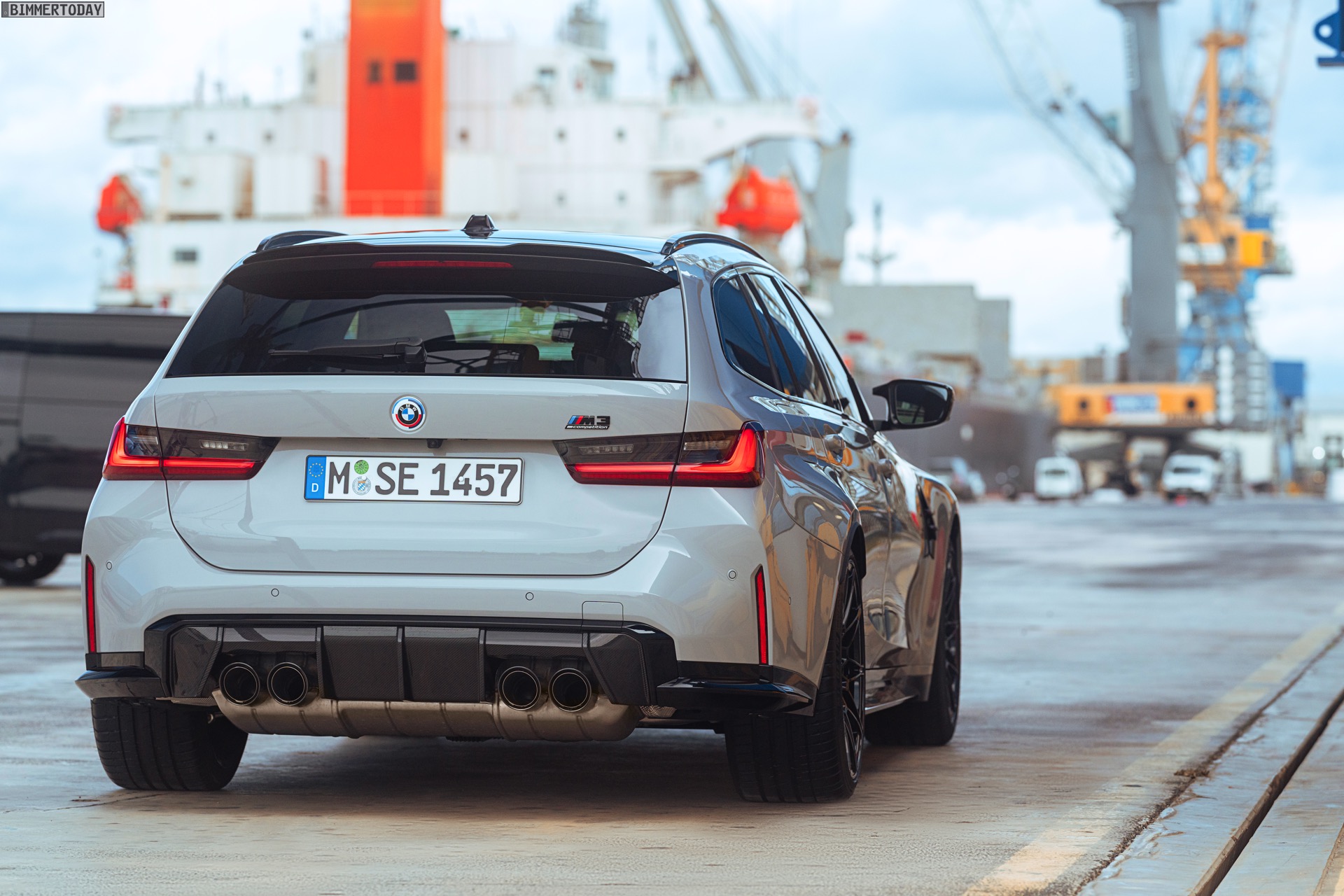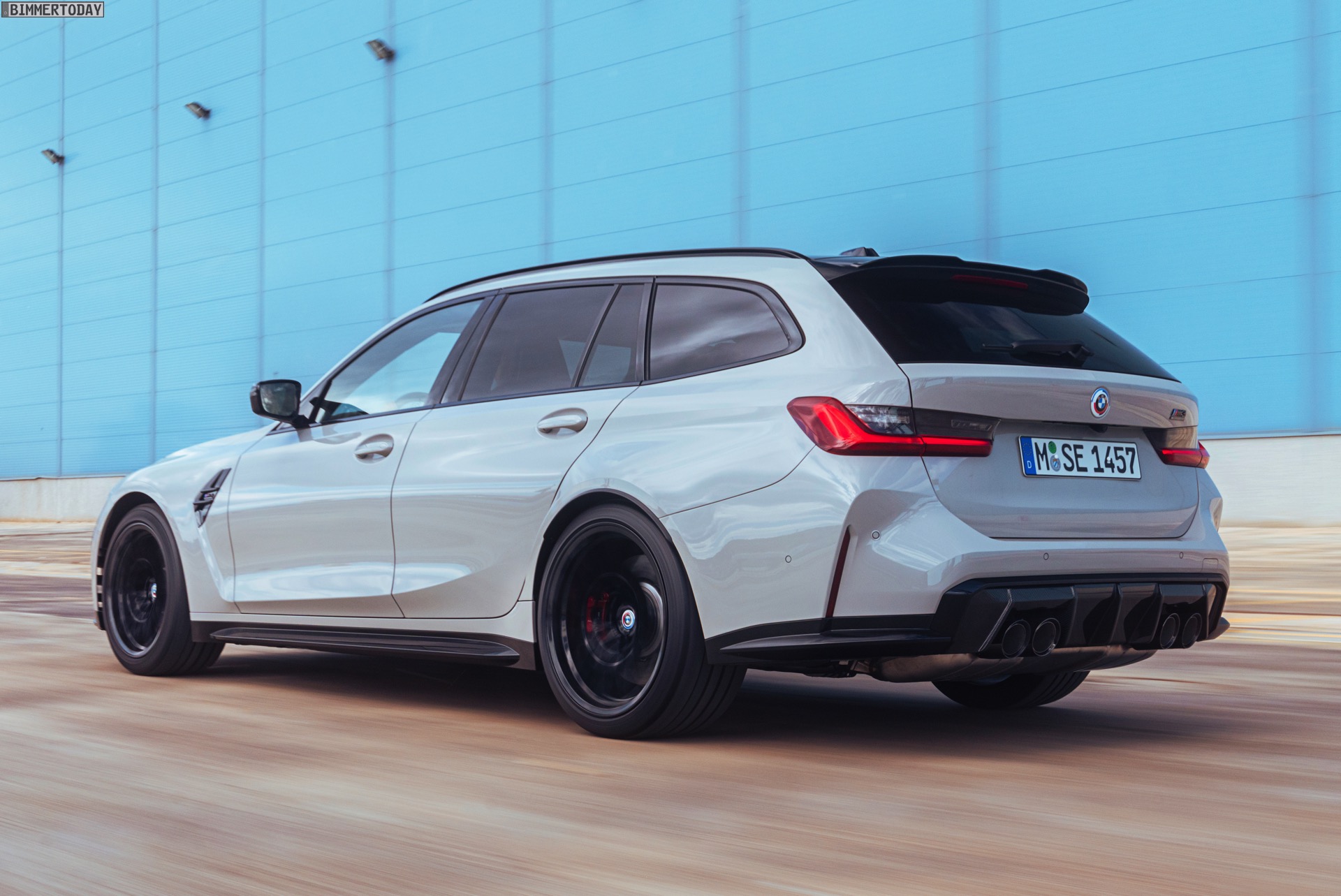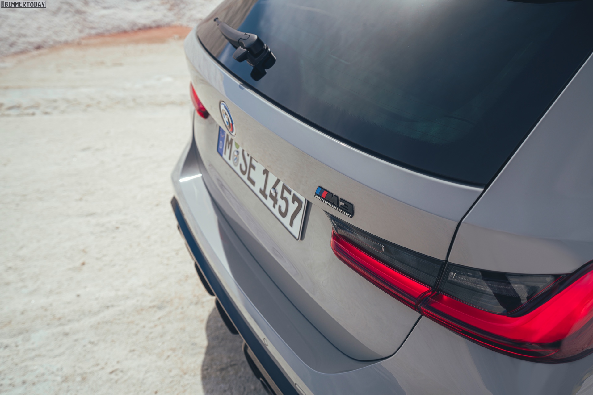 Anders sieht es beim Design des Power-Kombis aus, denn jetzt gibt es endlich offizielle Bilder zum BMW M3 Touring (G81). Auf den ersten Fotos sehen wir die Garchinger Interpretation des aktuellen 3er Touring (G21 LCI) mit Individual-Lackierung in Kreide, aber spannender als die Farbe ist in diesem Fall natürlich das Heck – und dessen Anblick überzeugt auf ganzer Linie: Die deutlich verbreiterten Kotflügel harmonieren perfekt mit dem Kombi-Heck, auch der dunkel abgesetzte Diffusor und die vier mächtigen Endrohre sind erstklassig integriert. Eher dezent fällt die zusätzliche Spoilerlippe auf dem Dachkanten-Spoiler aus, die den Abtrieb an der Hinterachse im Hochgeschwindigkeits-Bereich noch ein wenig erhöht. An der Front gleicht der BMW M3 Touring wie erwartet der M3 Limousine (G80).