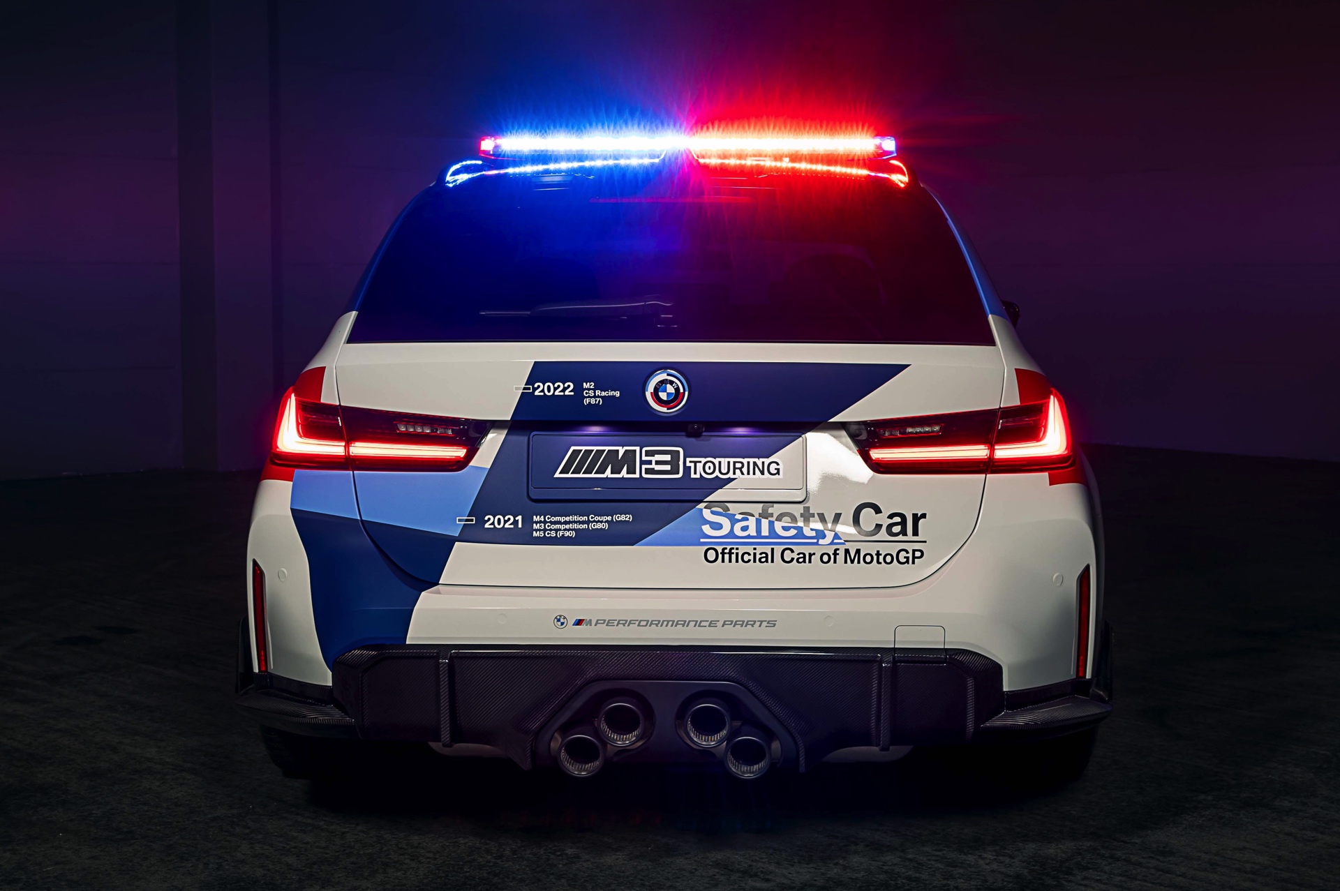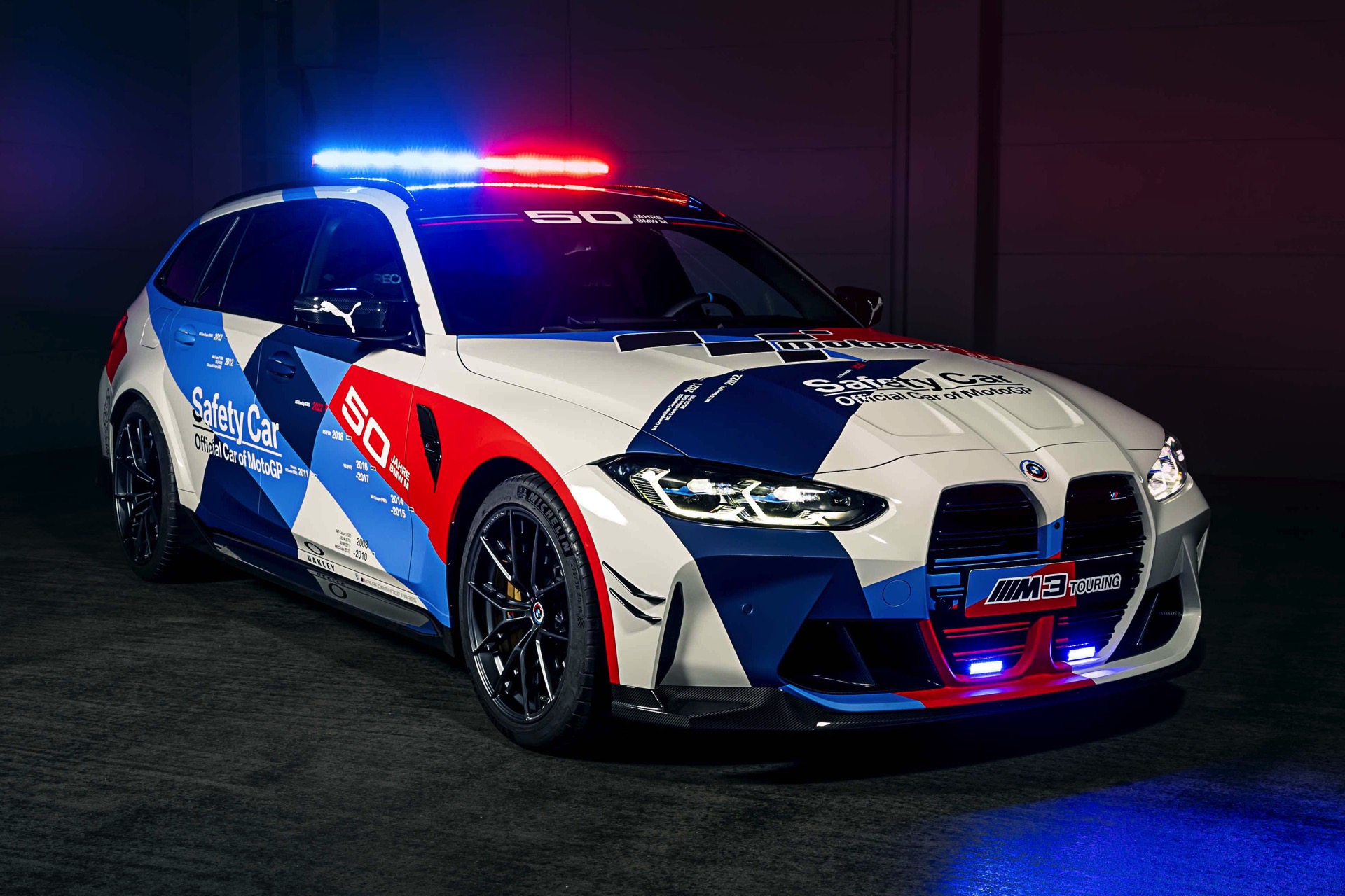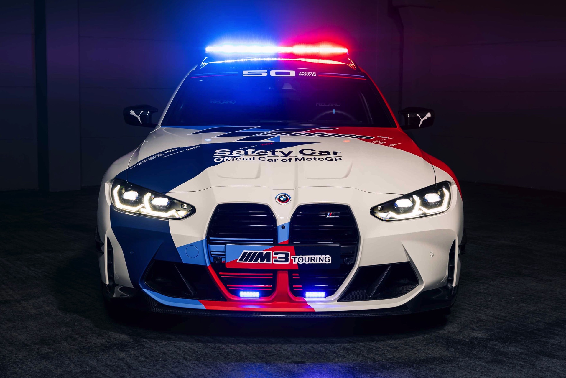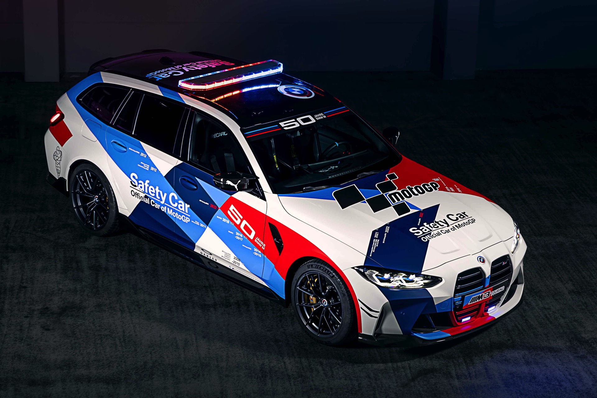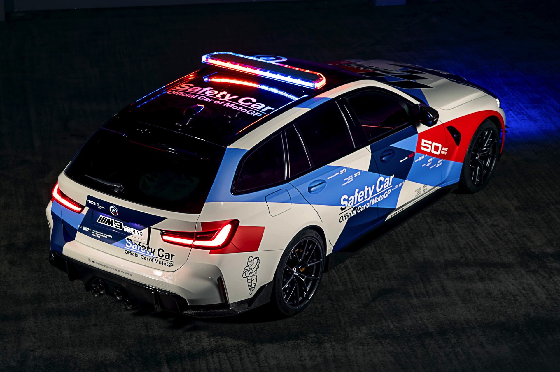 Die Beklebung des BMW M3 Touring Safety Car feiert nicht nur den 50. Geburtstag der M GmbH, es feiert auch die langjährige Zusammenarbeit von MotoGP-Rechteinhaber Dorna Sports und BMW M: Alle BMW Safety Cars, die seit 1999 in der MotoGP aktiv waren, werden auf der Folierung des M3 Touring erwähnt – angefangen von BMW Z8 und Z3 Coupé über den M5 CS bis hin zum M2 CS Racing.