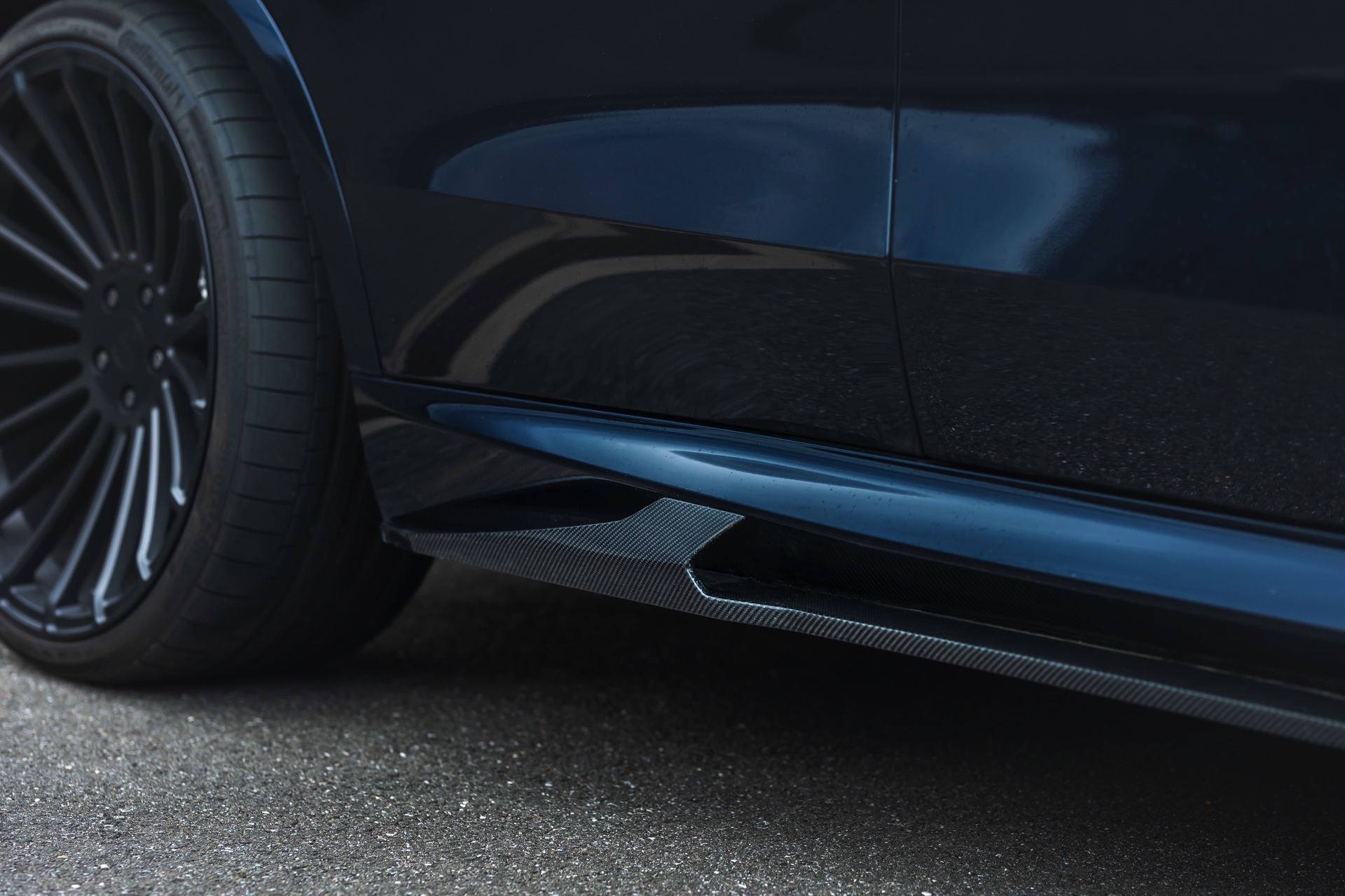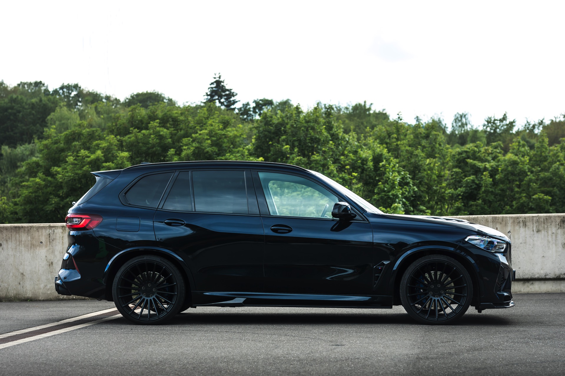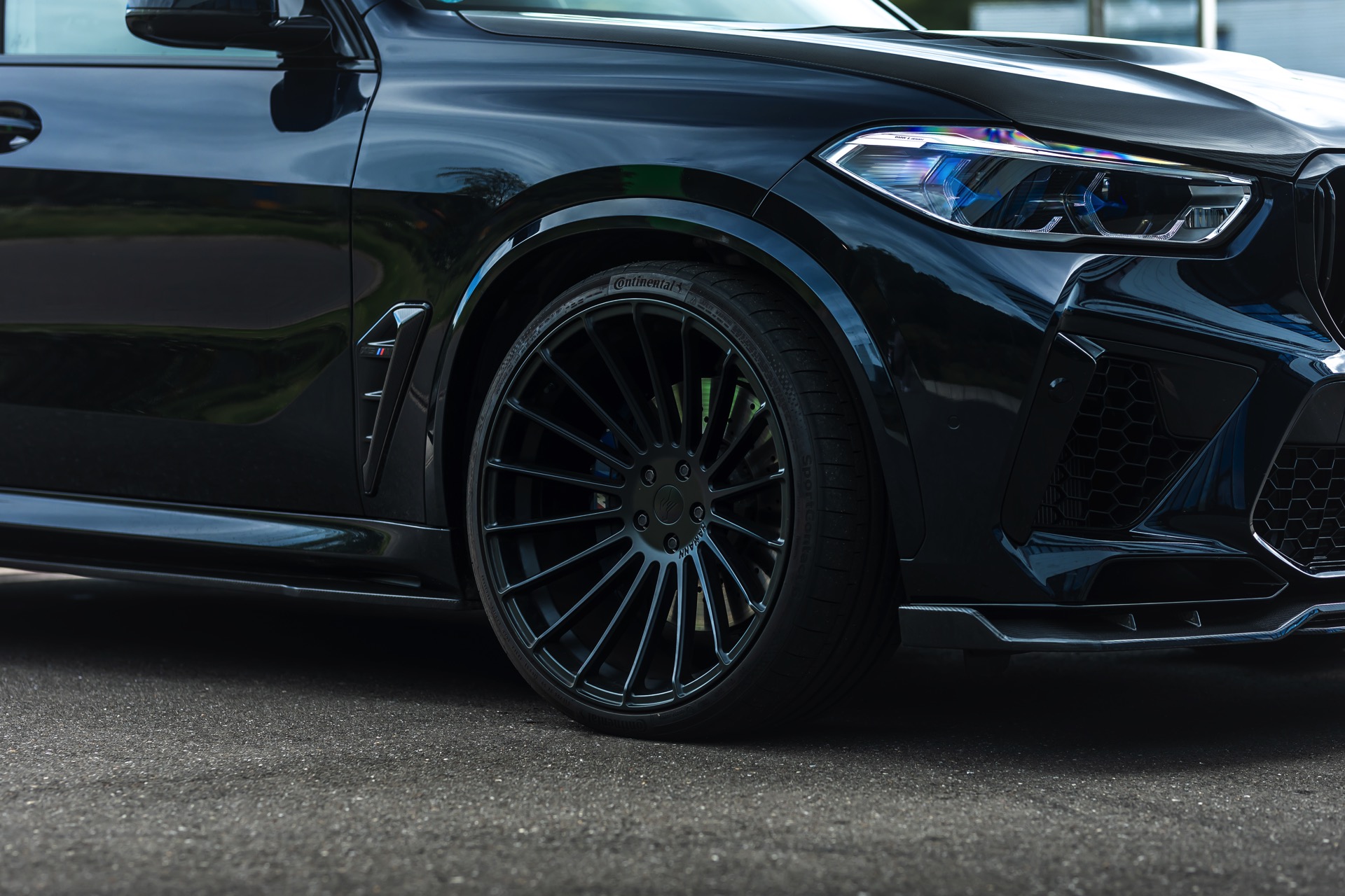 Ein längsdynamisches Potenzial dieser Größenordnung braucht ein entsprechendes Fahrwerk für den optimalen Bodenkontakt: Mithilfe von H&R-Gewindefedern wurde der MHX5 700 näher an den Asphalt gebracht. Die Federn sind höhenverstellbar und heben die Querdynamik des Über-SUV auf ein neues Level. Gleiches gilt für sein Auftreten: Neben der Tieferlegung sorgen beim gezeigten Kundenfahrzeug Hamann Anniversary Evo Black Line-Felgen in 23 Zoll mit 315er-Bereifung rundum für den aggressiven Stand. Die Motorhaube mit ihren auffälligen GTR-Luftauslässen sowie der Diffusor aus Carbon mit mittiger Motorsport-Nebelschlussleuchte tun ihr Übriges. Seitenschweller und Frontspoiler – natürlich auch aus Carbon – komplettieren den Tuning-X5.