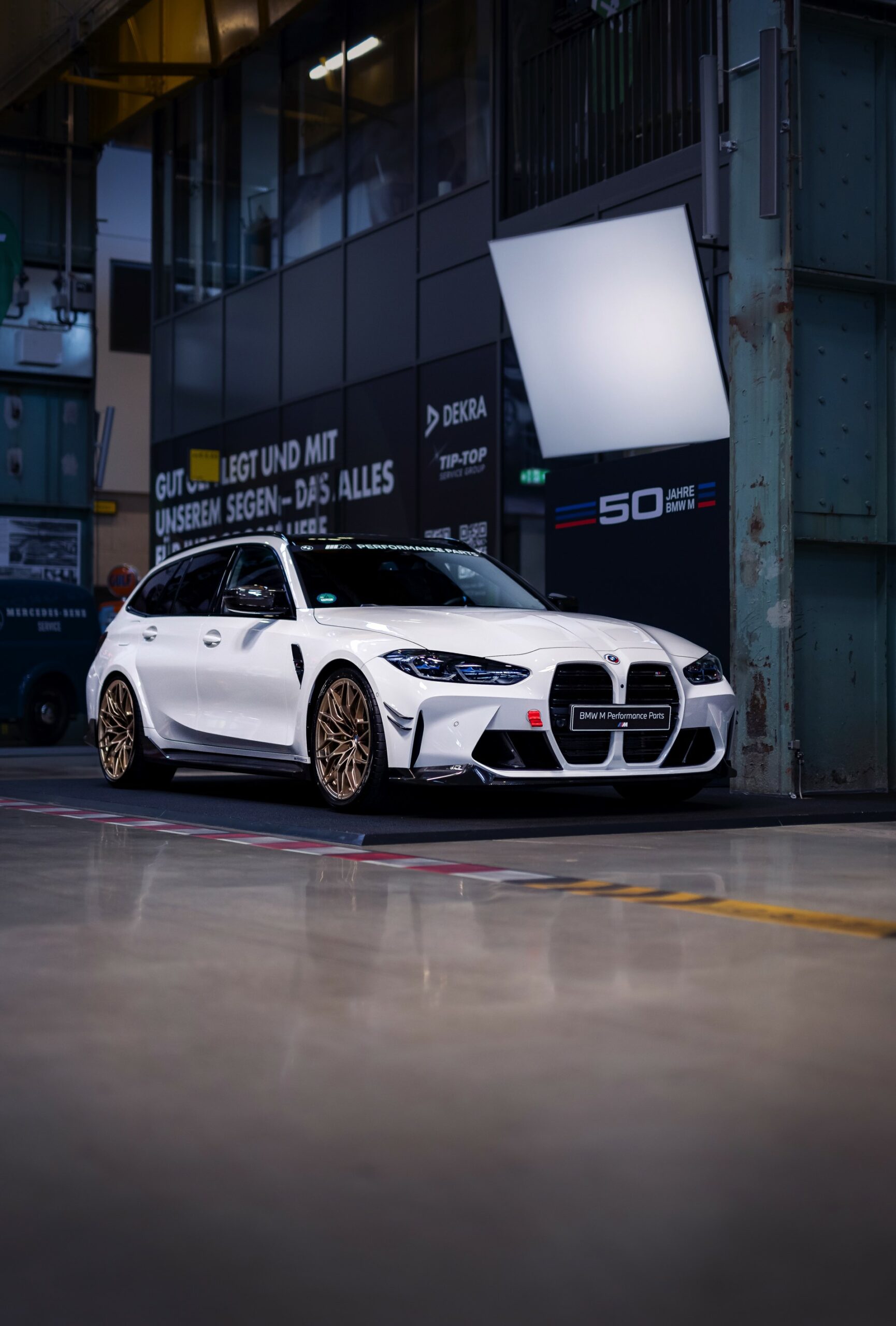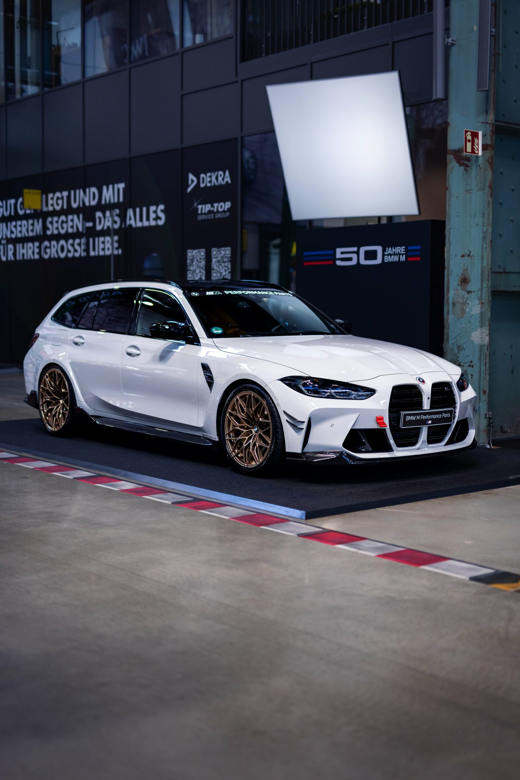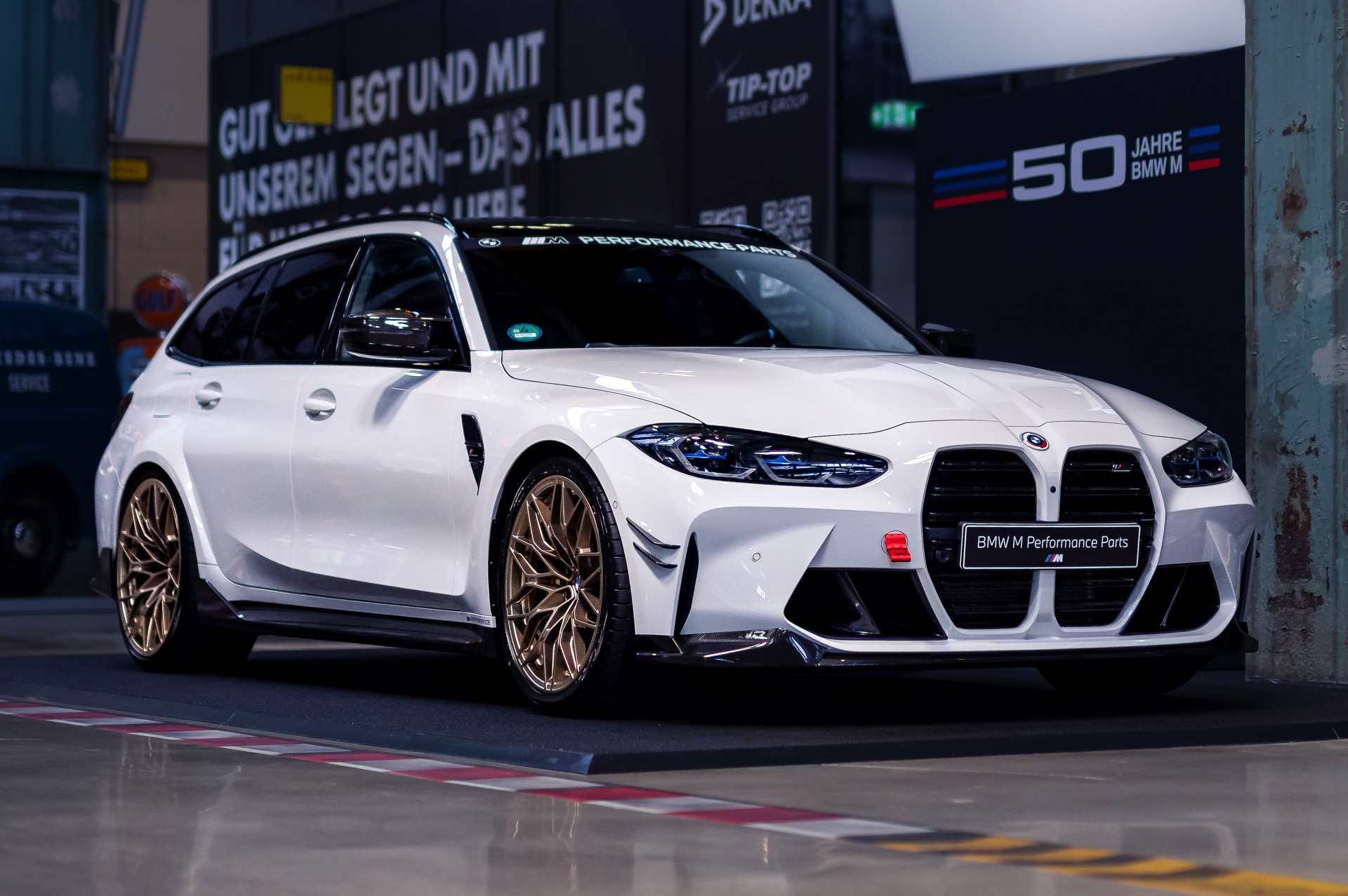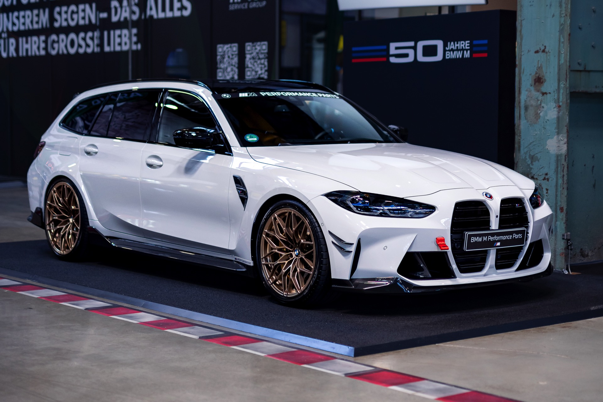 Unter anderem mit einem weißen BMW M3 Touring wird der 50. Geburtstag der M GmbH in der MotorWorld München gefeiert. Der erst vor wenigen Tagen auf dem Goodwood Festival of Speed in Frozen Black und in Daytona Violett enthüllte Power-Kombi zeigt sich dabei erstmals in unschuldigem Weiß, aber bei näherem Hinsehen kann von Unschuld wahrlich keine Rede mehr sein: Schon im Serien-Zustand legt der M3 Touring mit seiner markanten Front, den weit ausgestellten Kotflügeln und natürlich seinen vier Endrohren am Heck einen brutalen Auftritt hin, aber mit Tuning-Teilen aus dem BMW M Performance Zubehör wird es gleich noch mehrere Stufen auffälliger.