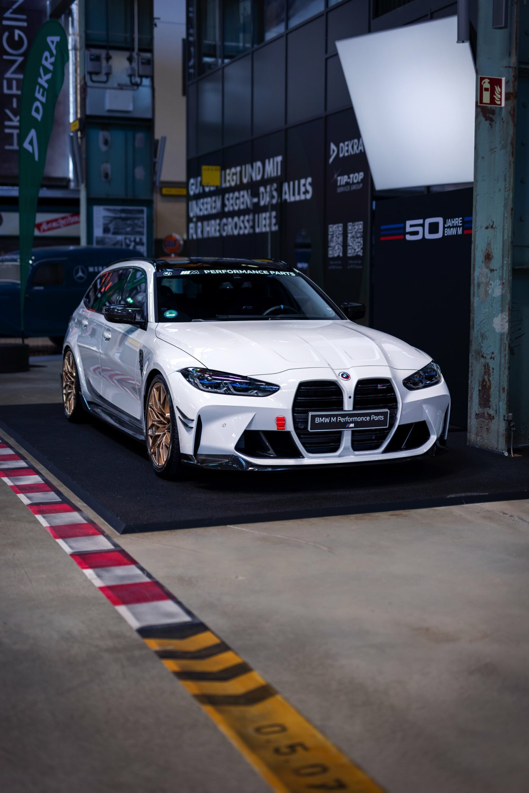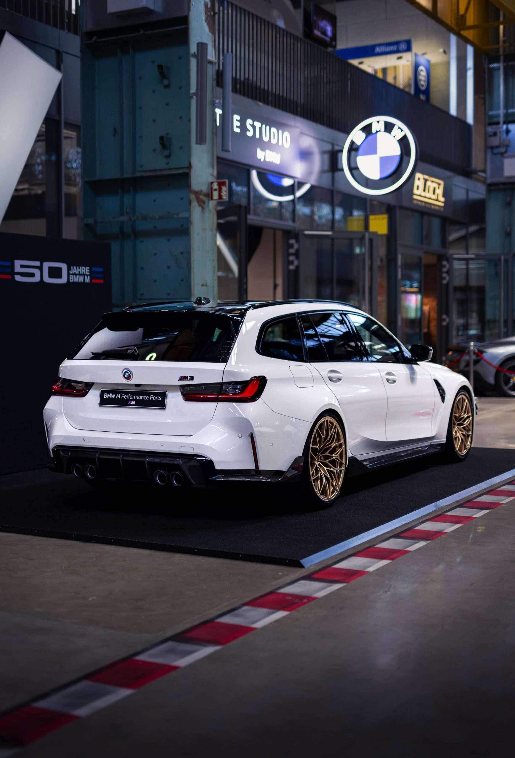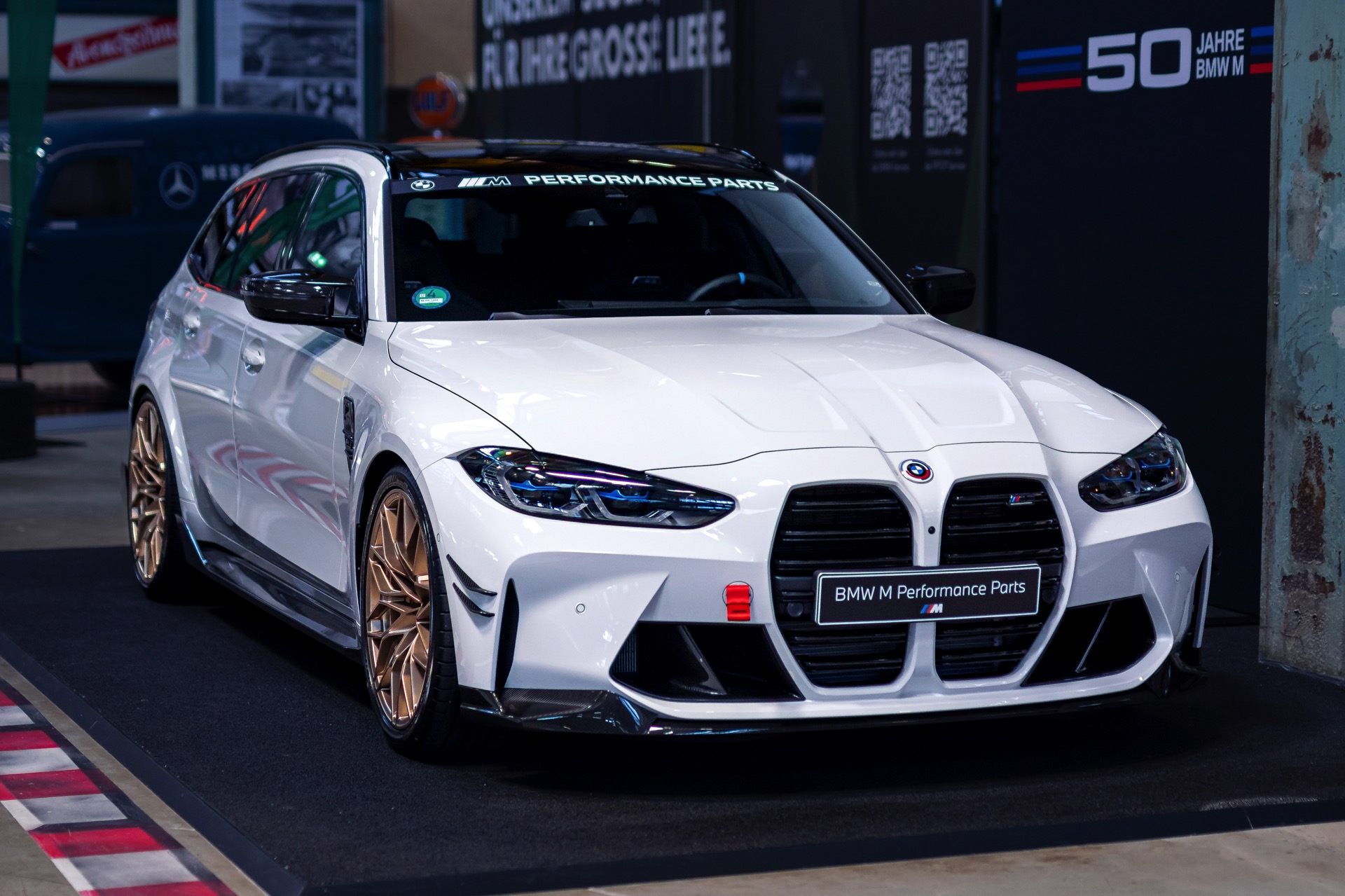 Unter anderem mit einem weißen BMW M3 Touring wird der 50. Geburtstag der M GmbH in der MotorWorld München gefeiert. Der erst vor wenigen Tagen auf dem Goodwood Festival of Speed in Frozen Black und in Daytona Violett enthüllte Power-Kombi zeigt sich dabei erstmals in unschuldigem Weiß, aber bei näherem Hinsehen kann von Unschuld wahrlich keine Rede mehr sein: Schon im Serien-Zustand legt der M3 Touring mit seiner markanten Front, den weit ausgestellten Kotflügeln und natürlich seinen vier Endrohren am Heck einen brutalen Auftritt hin, aber mit Tuning-Teilen aus dem BMW M Performance Zubehör wird es gleich noch mehrere Stufen auffälliger.