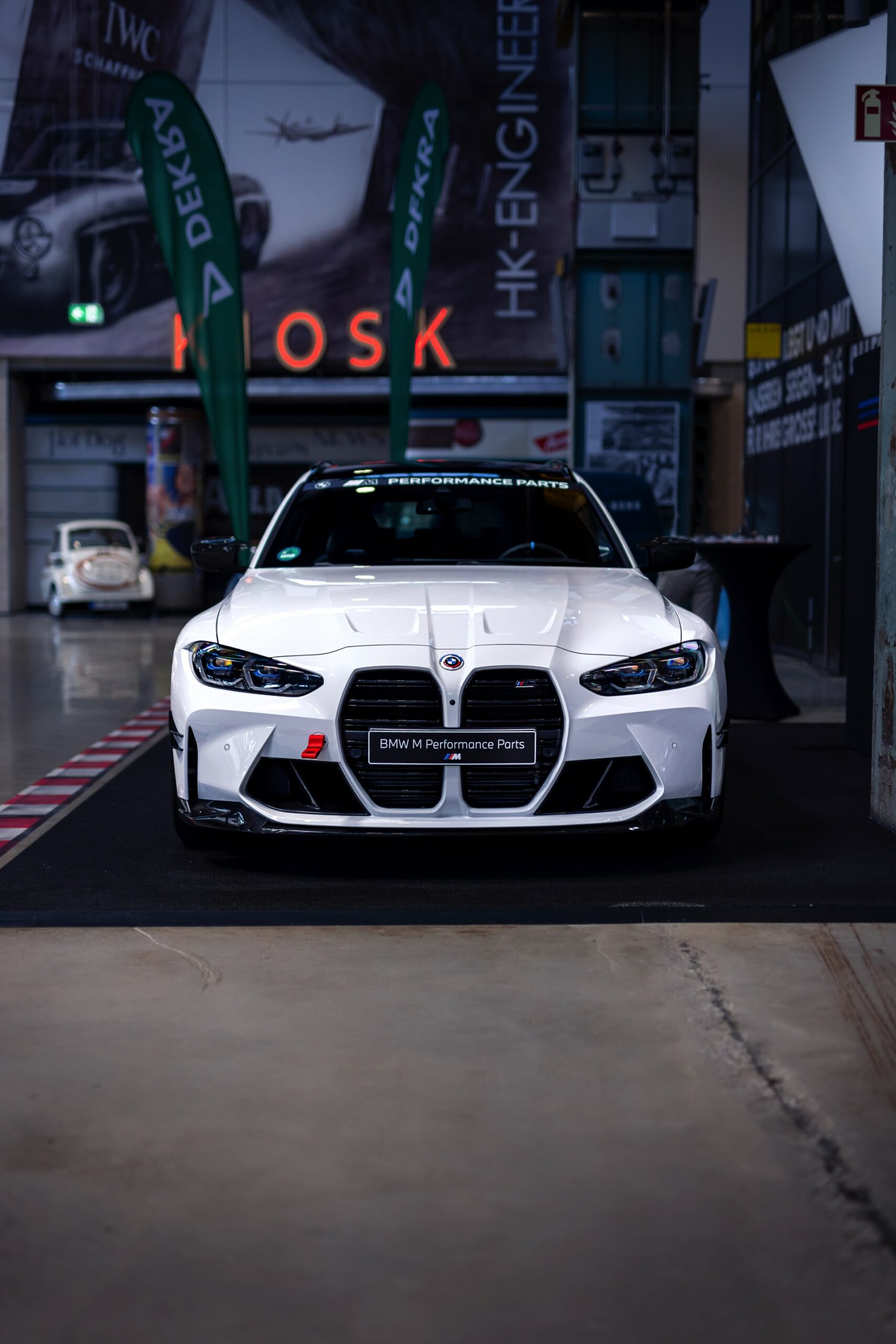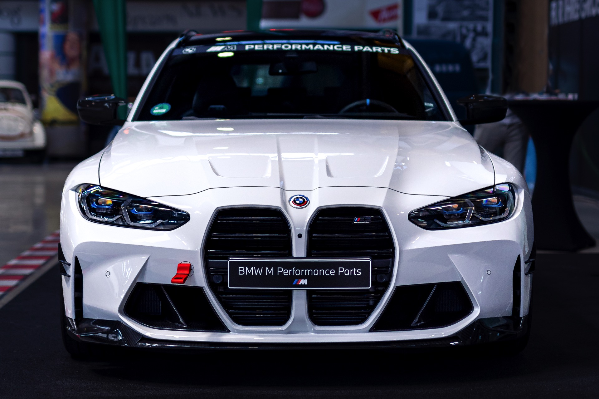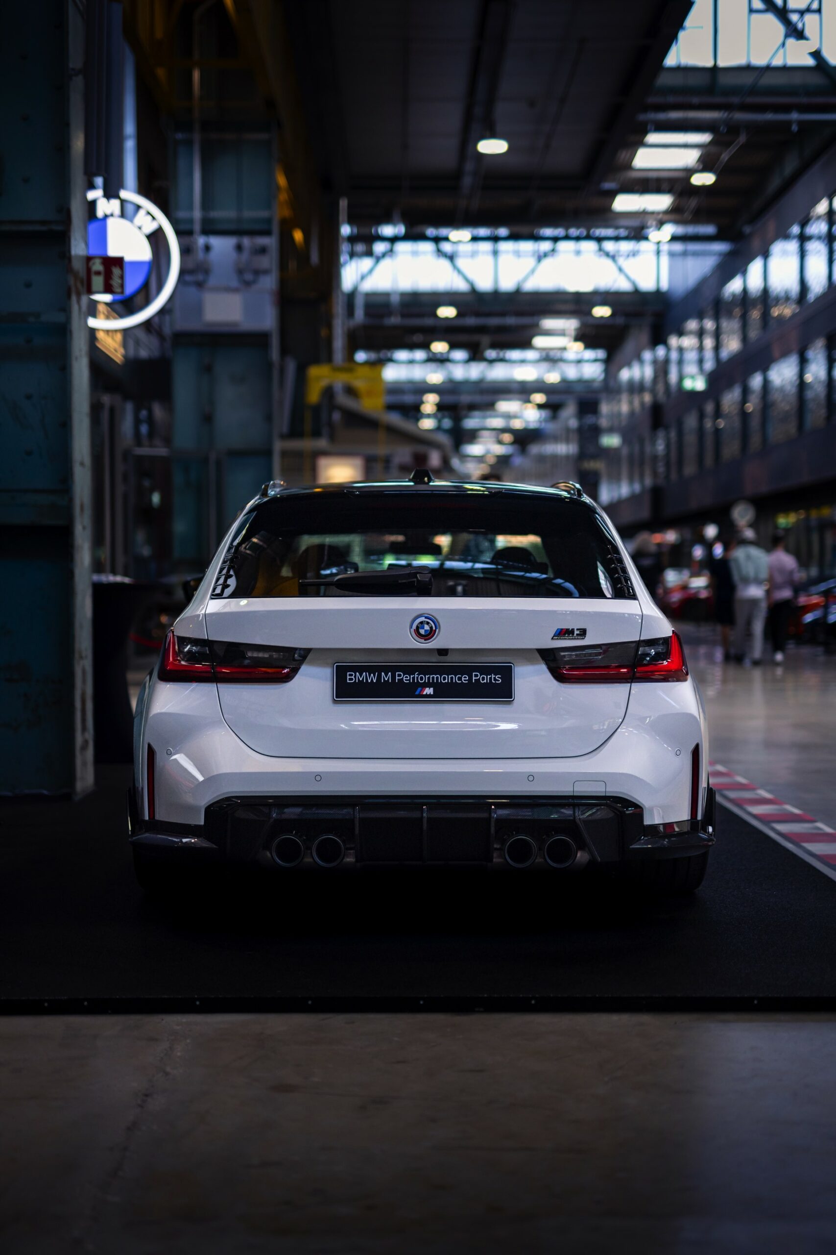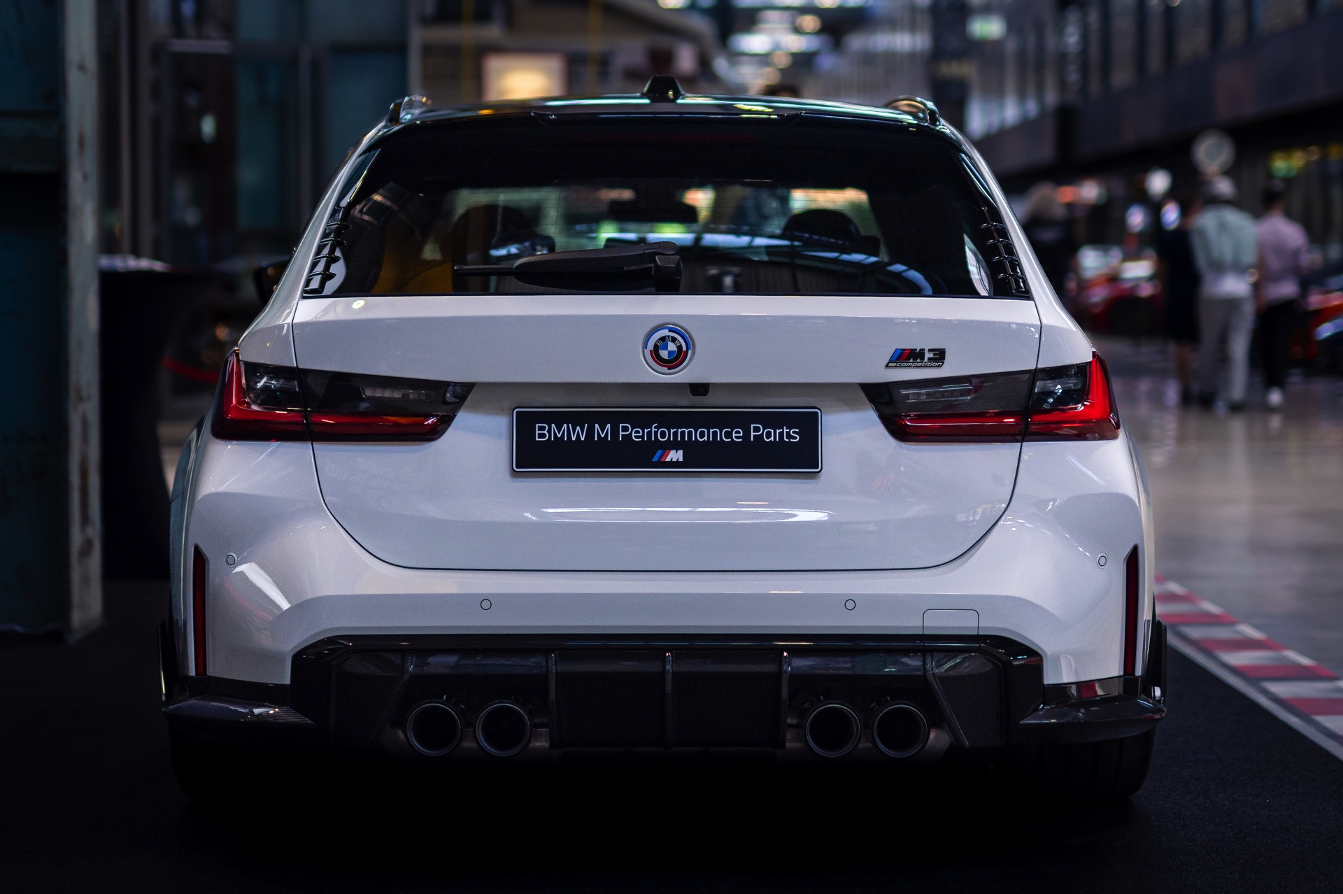 Unter anderem mit einem weißen BMW M3 Touring wird der 50. Geburtstag der M GmbH in der MotorWorld München gefeiert. Der erst vor wenigen Tagen auf dem Goodwood Festival of Speed in Frozen Black und in Daytona Violett enthüllte Power-Kombi zeigt sich dabei erstmals in unschuldigem Weiß, aber bei näherem Hinsehen kann von Unschuld wahrlich keine Rede mehr sein: Schon im Serien-Zustand legt der M3 Touring mit seiner markanten Front, den weit ausgestellten Kotflügeln und natürlich seinen vier Endrohren am Heck einen brutalen Auftritt hin, aber mit Tuning-Teilen aus dem BMW M Performance Zubehör wird es gleich noch mehrere Stufen auffälliger.