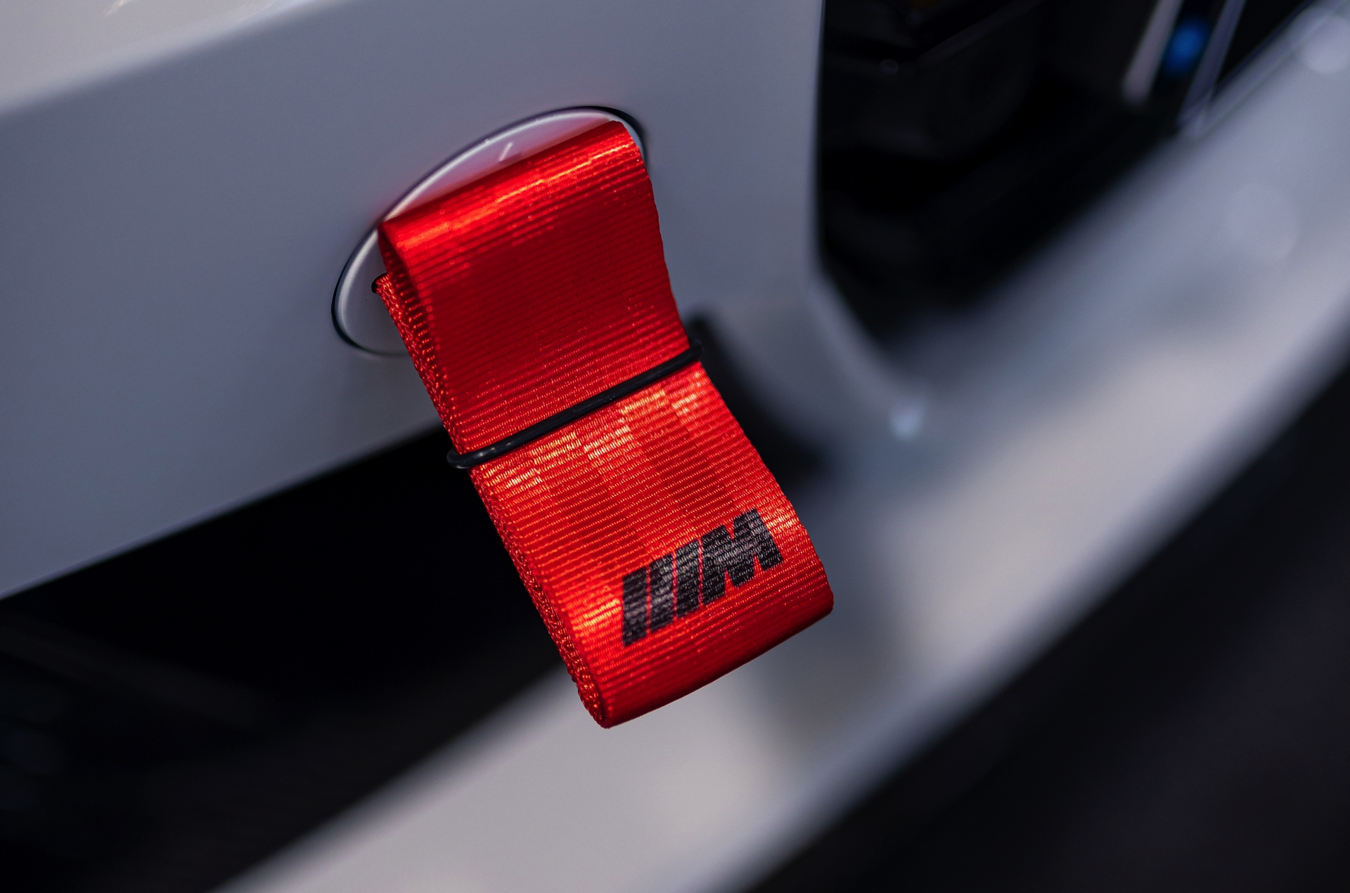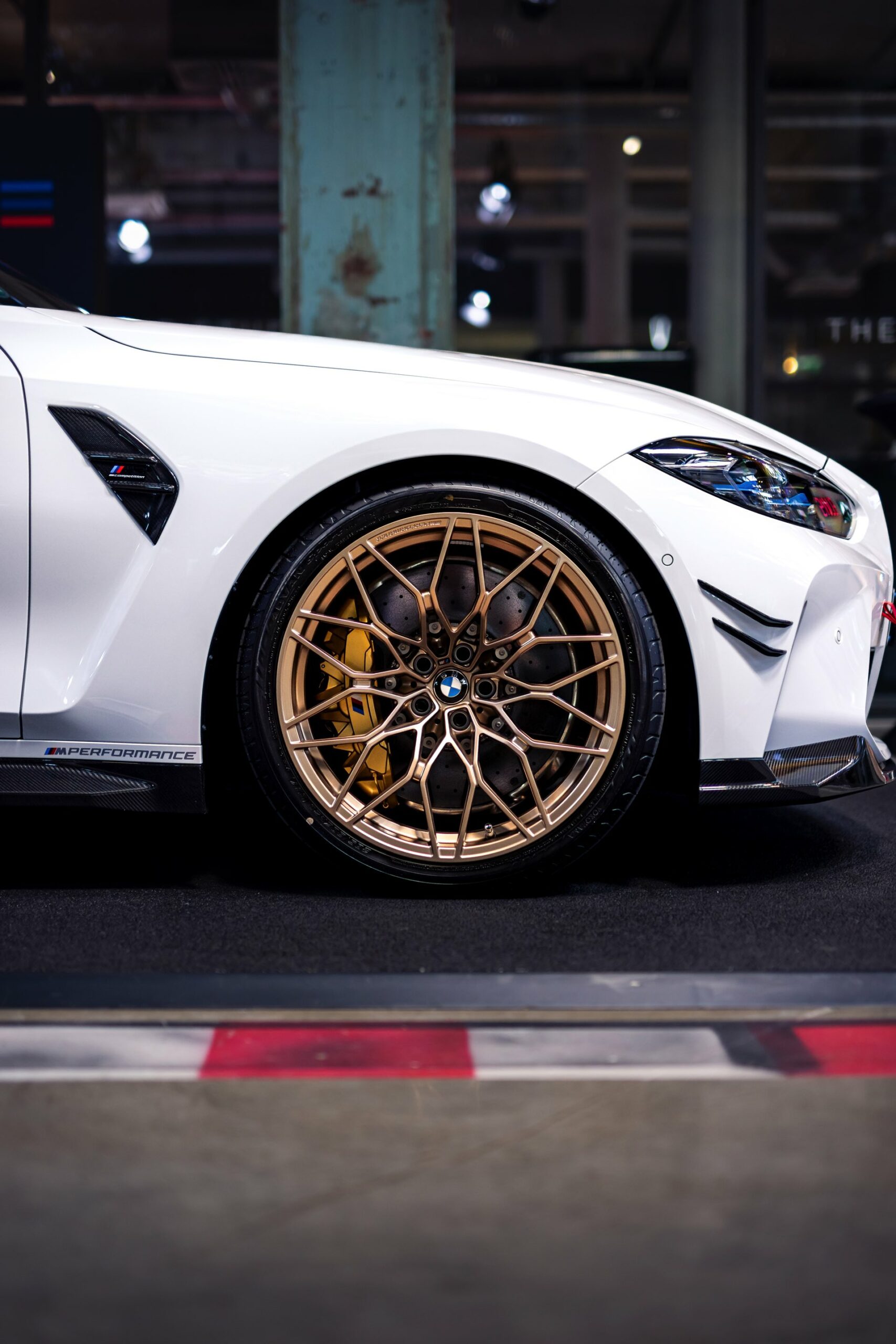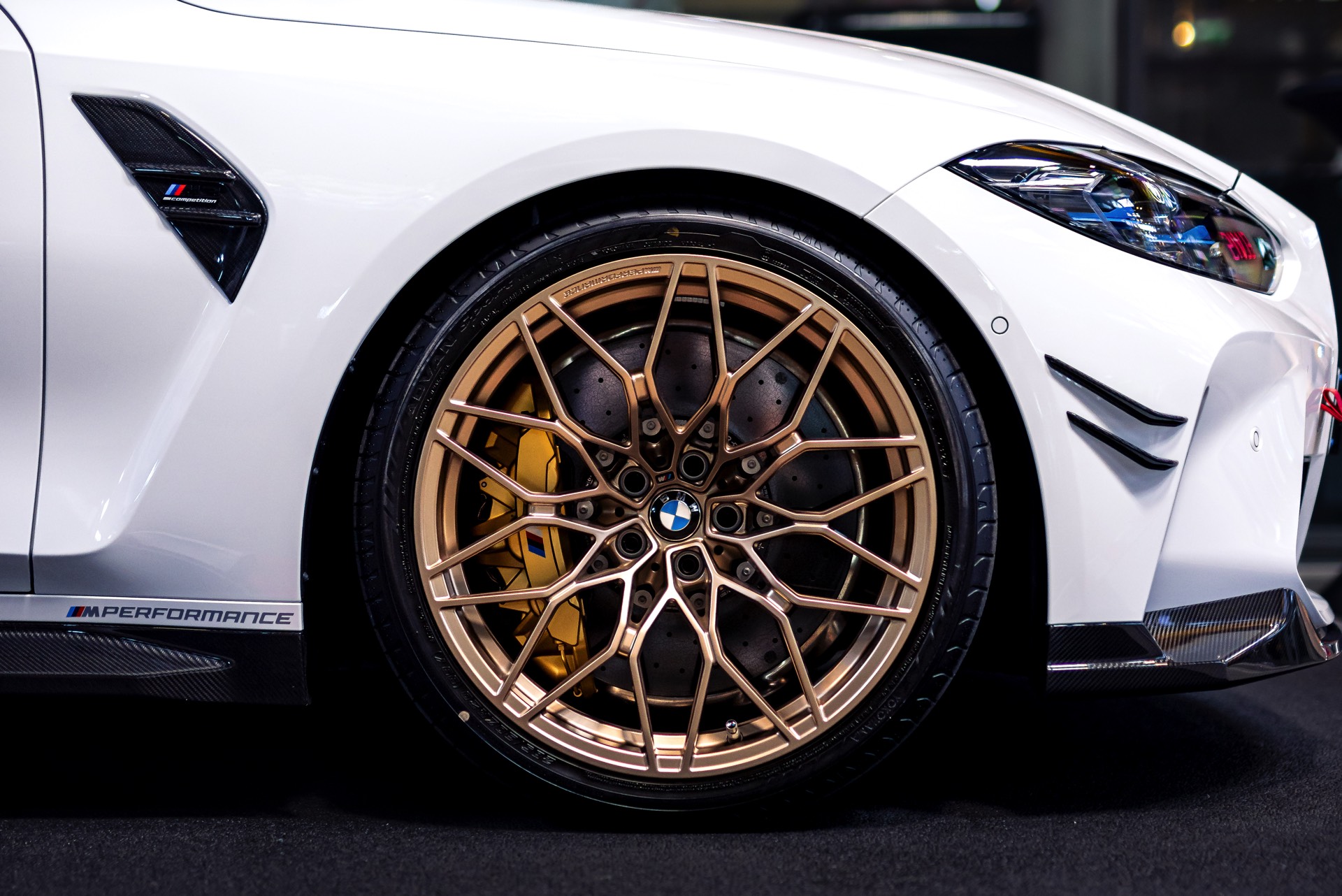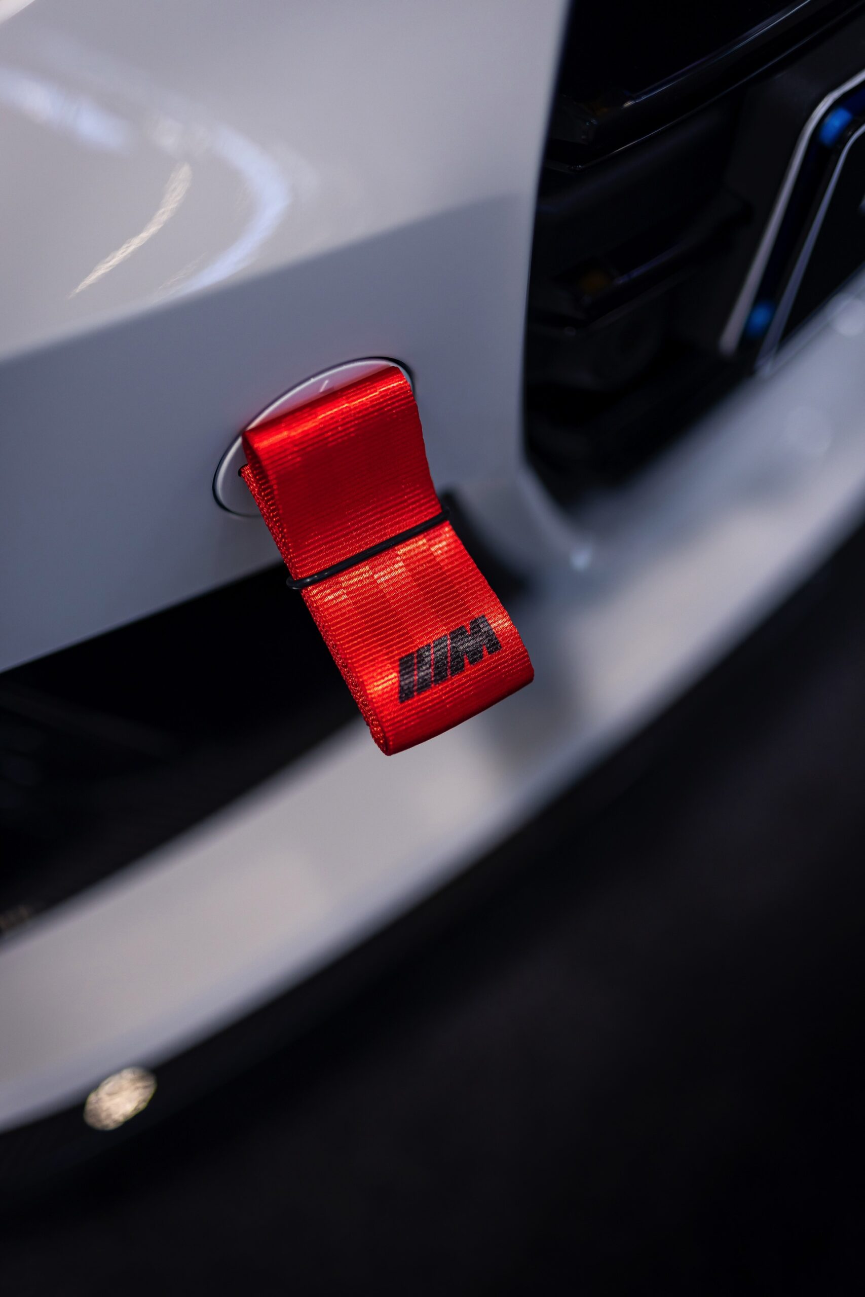 Einer der größten Hingucker auf den Fotos von HaberkornPhotography sind die vorne 20 und hinten sogar 21 Zoll großen Schmiederäder im Design Kreuzspeiche 1000 M, die vor allem auch dank ihrer Lackierung in Frozen Goldbronze ins Auge fallen. Ein kleines, aber dank seiner Farbe durchaus auffälliges Detail für Motorsport-Fans ist die angedeutete rote Abschlepp-Öse, die auf der Abdeckung zur Befestigung des Abschlepp-Hakens angebracht werden kann und den BMW M3 Touring optisch noch etwas näher in Richtung Rennwagen rückt.