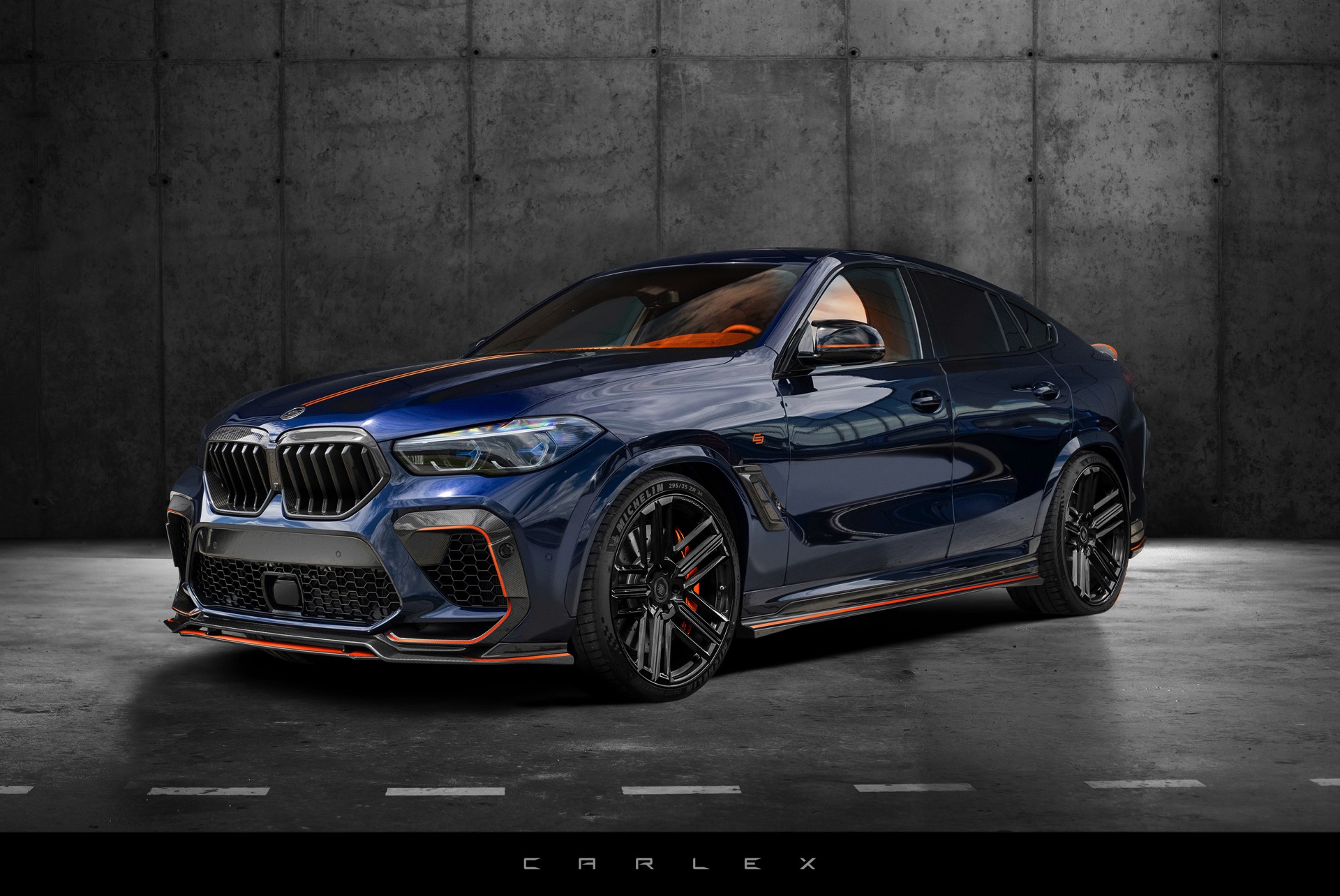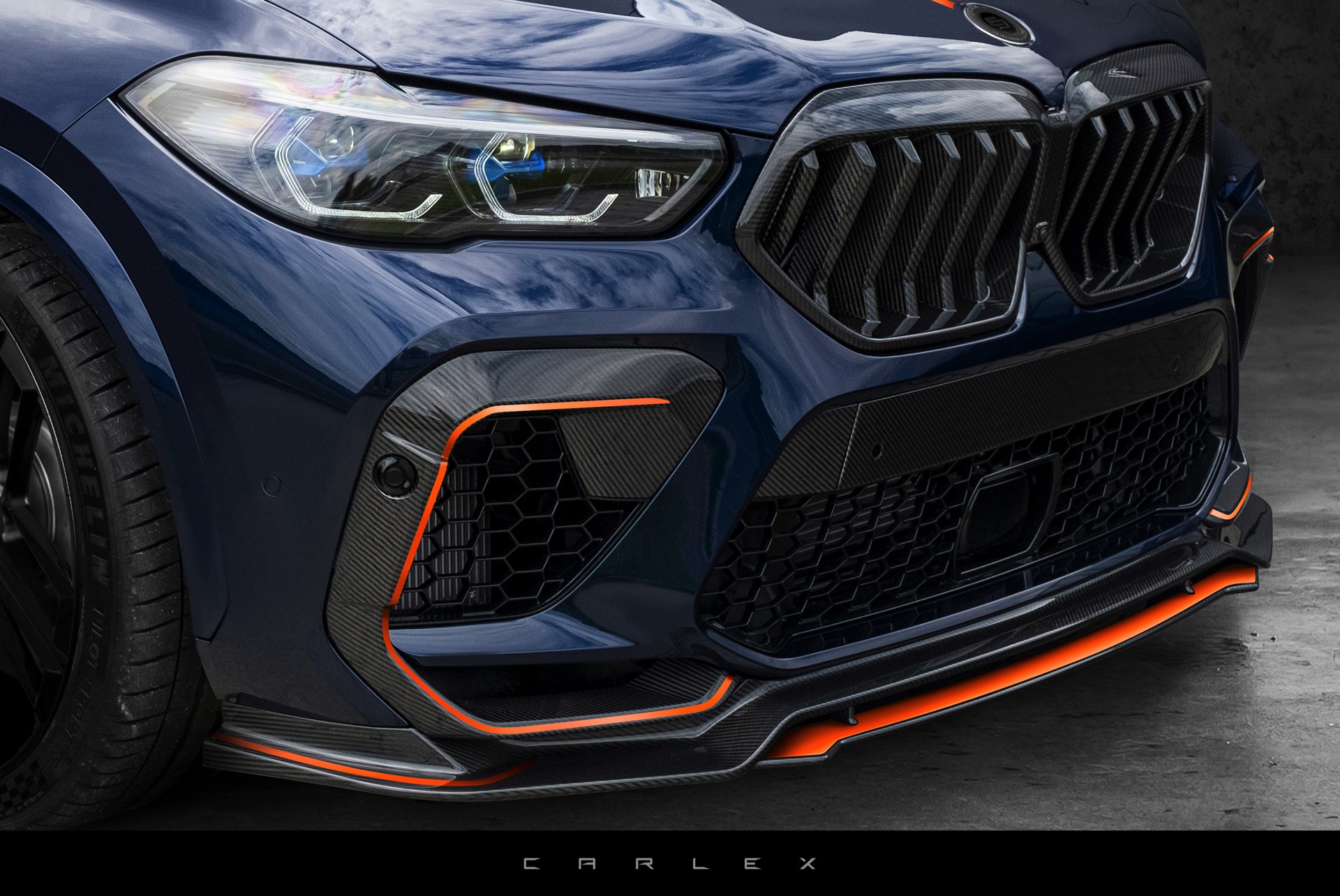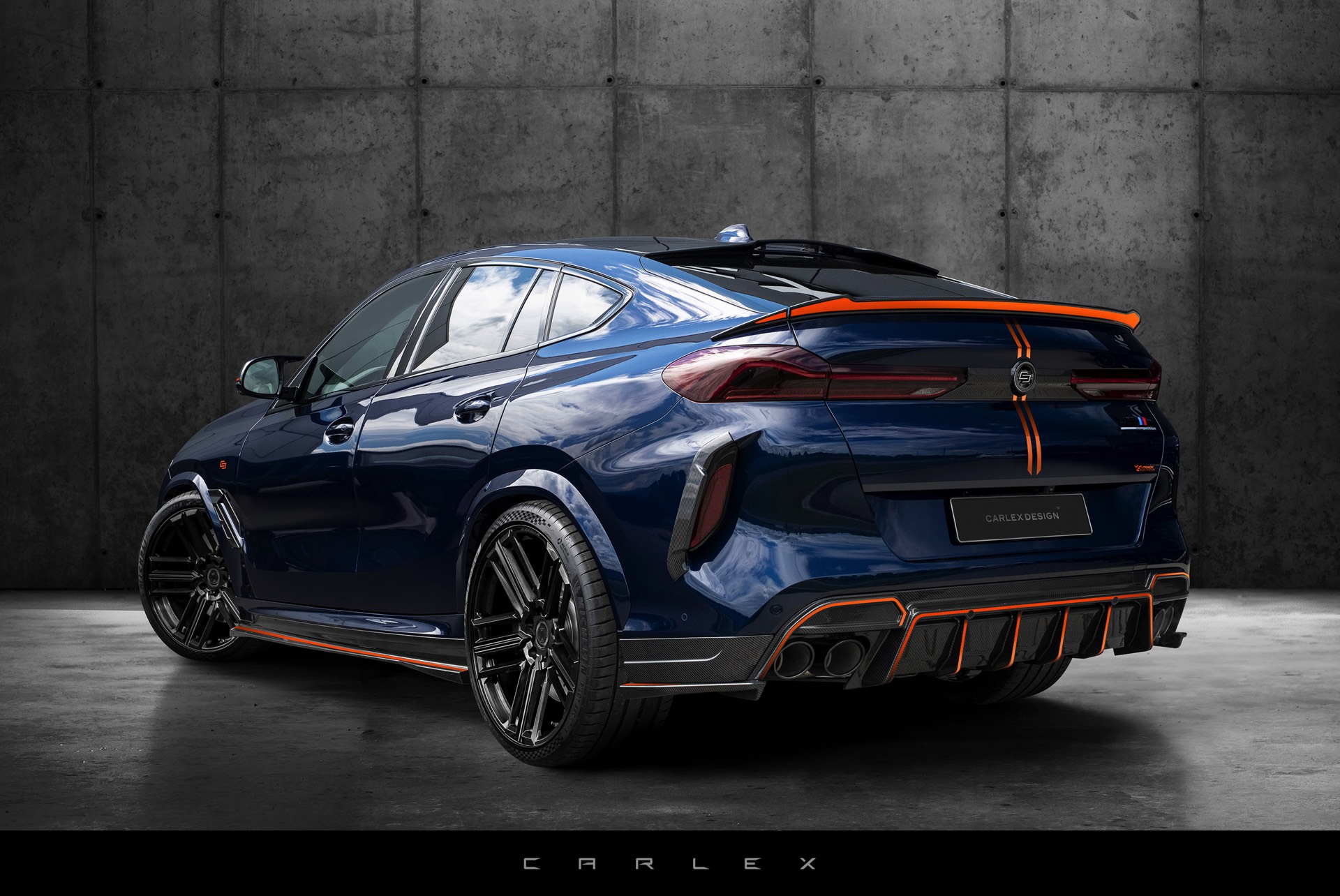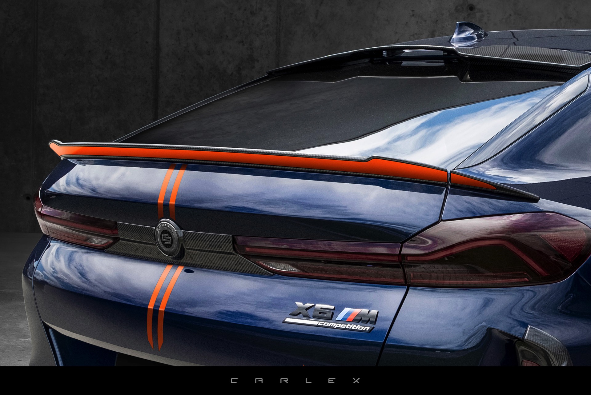 Die Vorliebe für Orange ist dem BMW X6 M (F96) auch äußerlich anzusehen: Das von Carlex Design unter dem Projektnamen “Notus Evo” realisierte Einzelstück trägt eine Lackierung in Sapphire Blue, die mit viel Carbon und einigen orangen Details aufgewertet wurde. Sportliche Anbau-Teile wie der Frontsplitter, die Seitenschweller, der Diffusor und die Spoiler-Lippe am Heck des SUV-Coupés werden mit feinen orangen Akzenten zusätzlich betont, außerdem spielt Sicht-Carbon eine zentrale Rolle: Nicht nur die komplette Niere oder die Außenspiegel, auch der Bereich zwischen den weit in die Mitte ragenden Heckleuchten oder der Dachkantenspoiler sind unübersehbar aus Carbon gefertigt oder zumindest mit Carbon verziert.