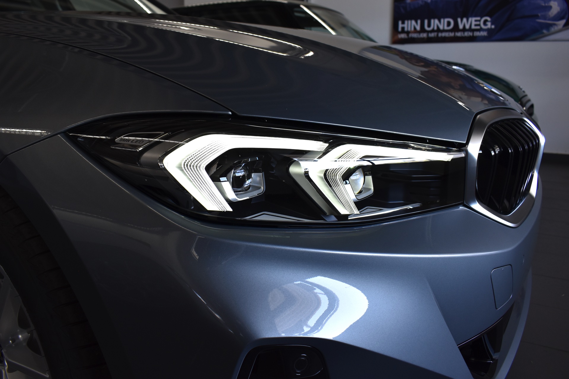 Im Autohaus Cloppenburg in Erfurt konnten wir nun ein Exemplar fotografieren, das die deutliche Aufwertung des Einstiegs-Looks unterstreicht: Die neue Serien-Frontschürze erinnert auf den ersten Blick an frühere M Sport-Pakete und kann in Kombination mit etwas größeren Felgen für einen gelungenen Auftritt sorgen. In der gezeigten Konfiguration sehen wir die im Grundpreis enthaltenen und nicht wirklich mitreißenden 17-Zöller im Design V-Speiche 778, aber die Liste attraktiverer Leichtmetallräder ist bekanntlich lang.