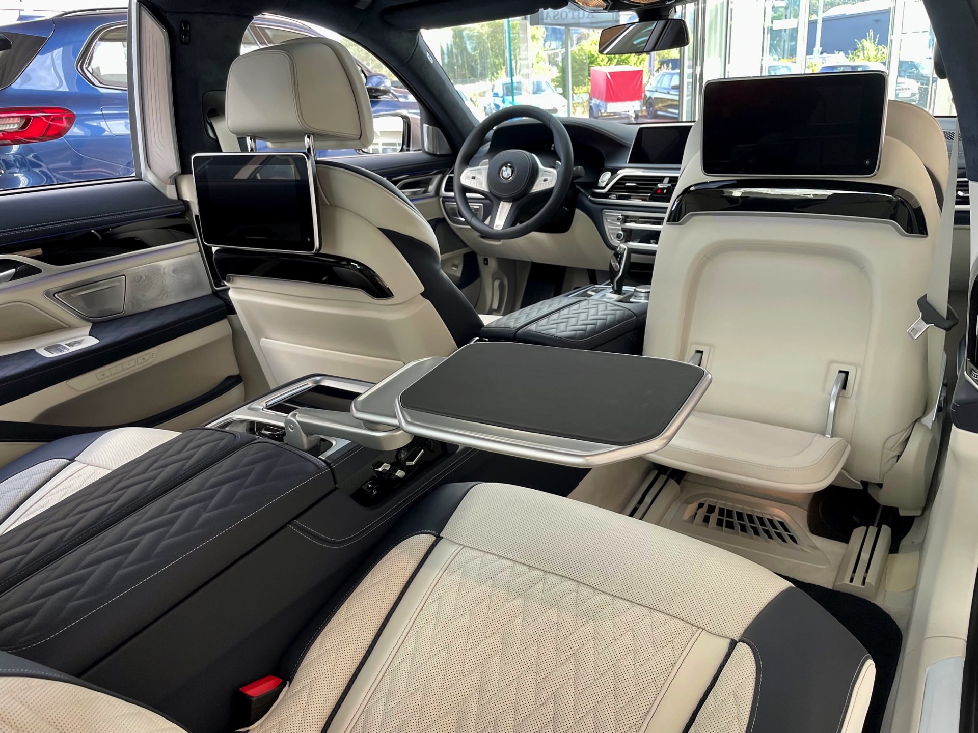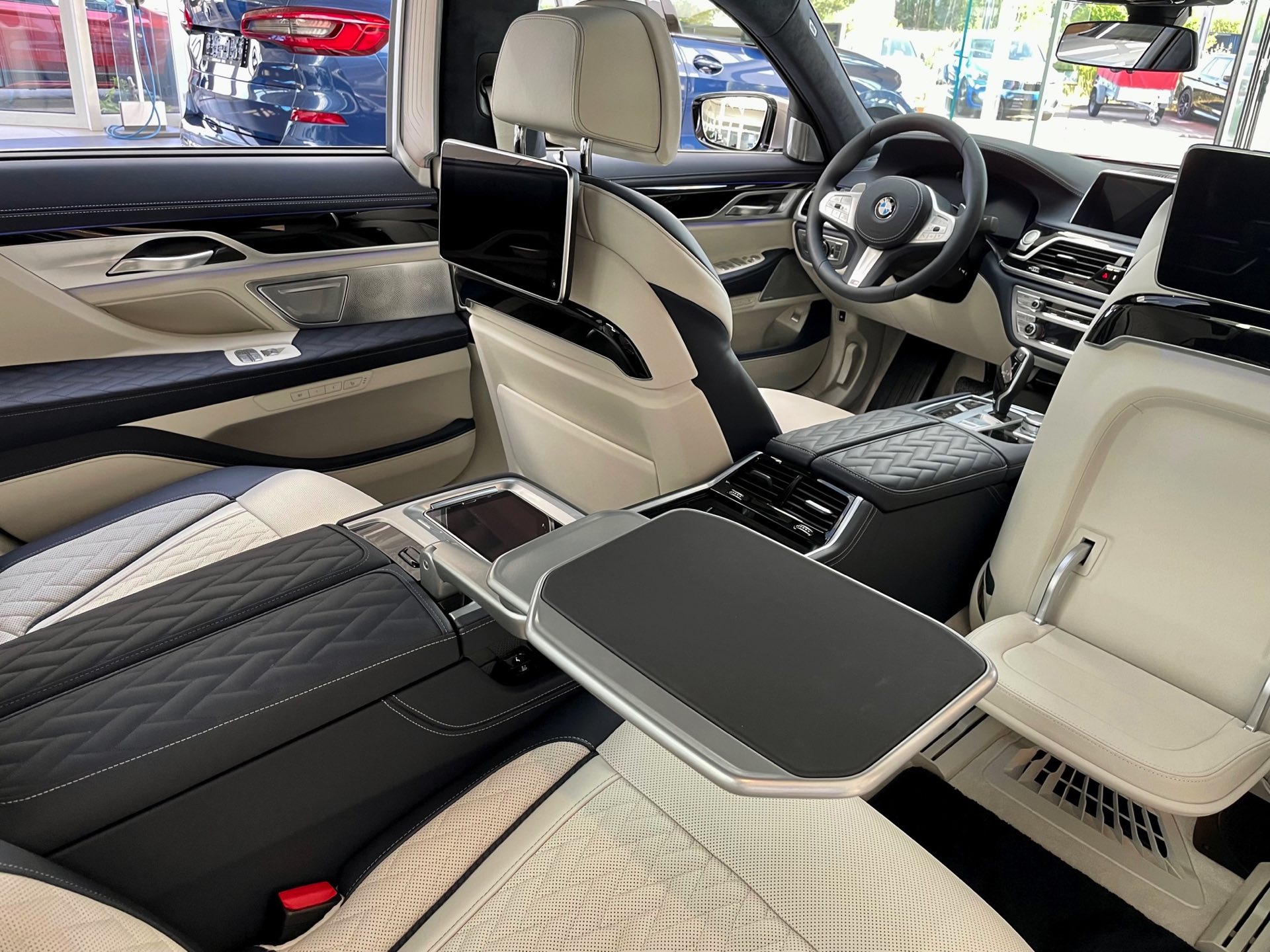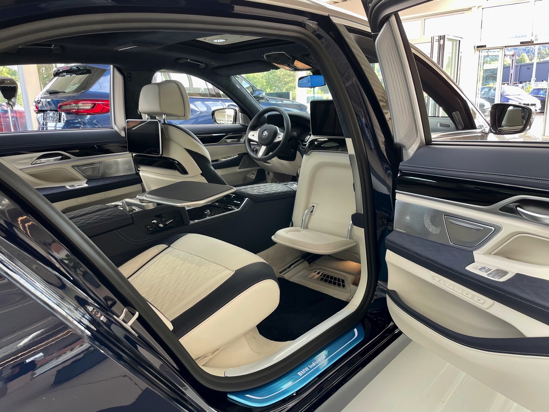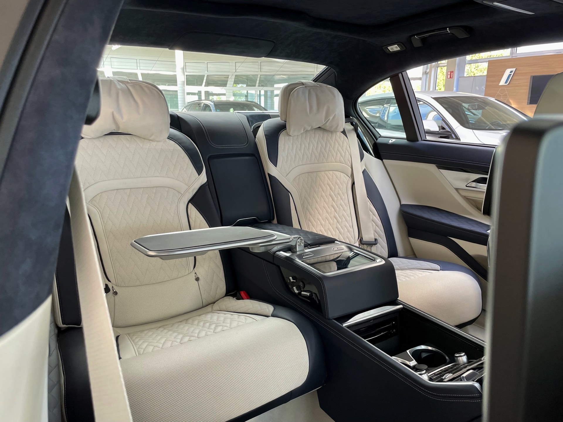 Auf das zweifarbige Exterieur abgestimmt präsentiert sich auch das Interieur: Genau wie außen gibt es auch innen eine edle Kombination von dunklem Nachtblau und hellem Rauchweiß, sodass sich ein überaus stimmiges Gesamtbild ergibt. Die Volllederausstattung von BMW Individual wird mit einem Alcantara-Dachhimmel kombiniert. Wie groß der Schritt zur nächsten Generation ist, zeigt sich beim Blick in den Fond: Feinste Materialien hin oder her, das “alte” Fond Entertainment Professional spielt doch unstrittig in einer anderen Liga als der neue Theatre Screen, der den Fond-Passagen auf 31 Zoll ein Kino-Erlebnis an Bord des Fahrzeugs erlaubt.