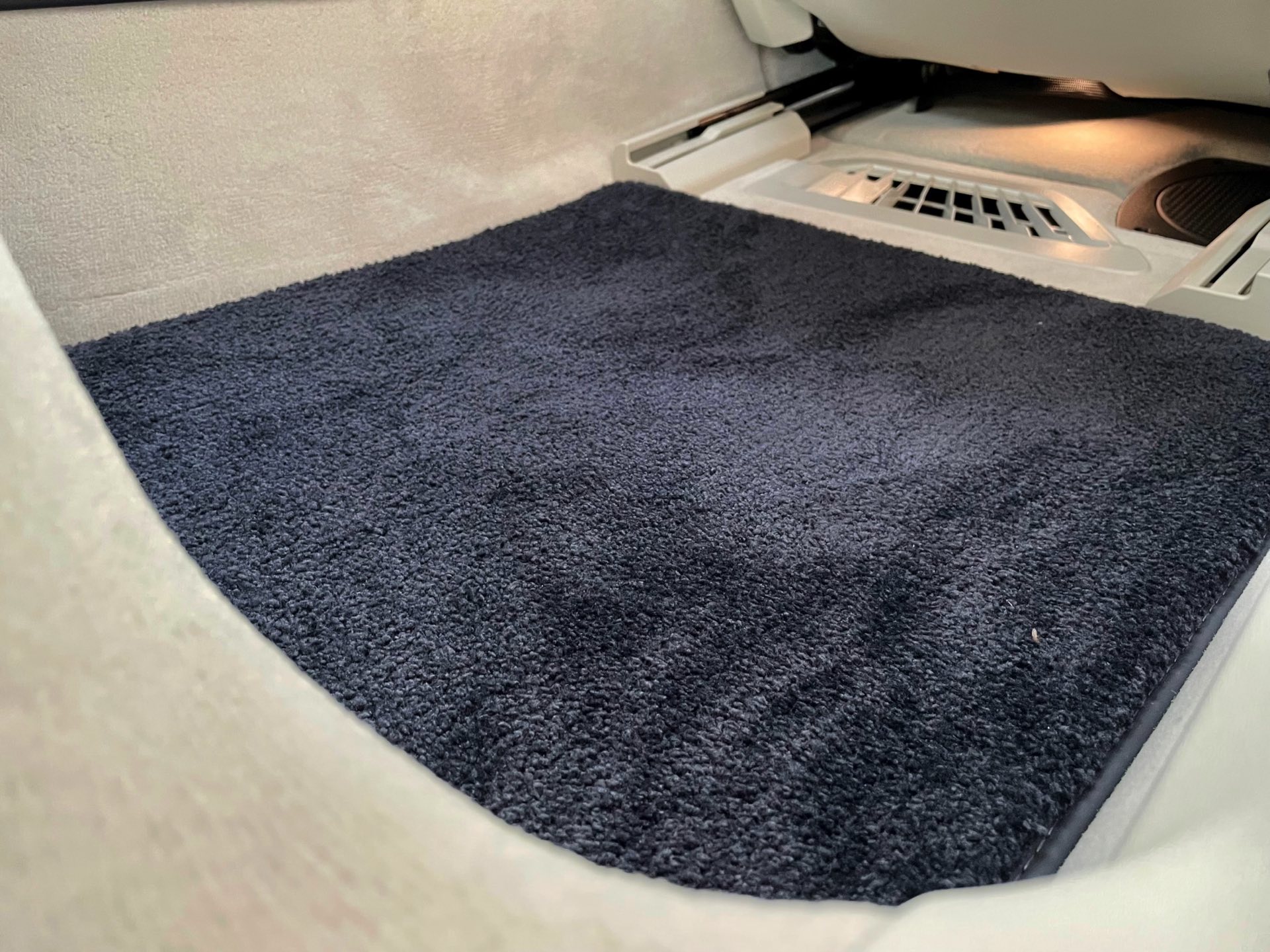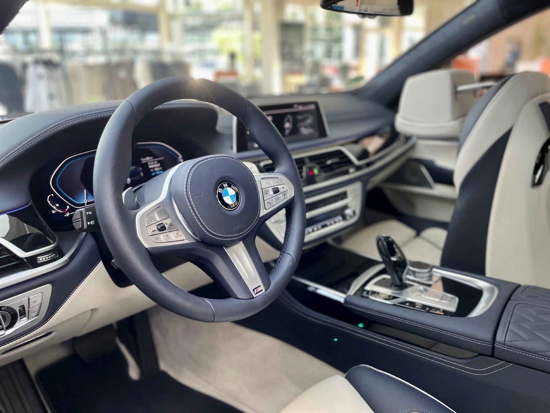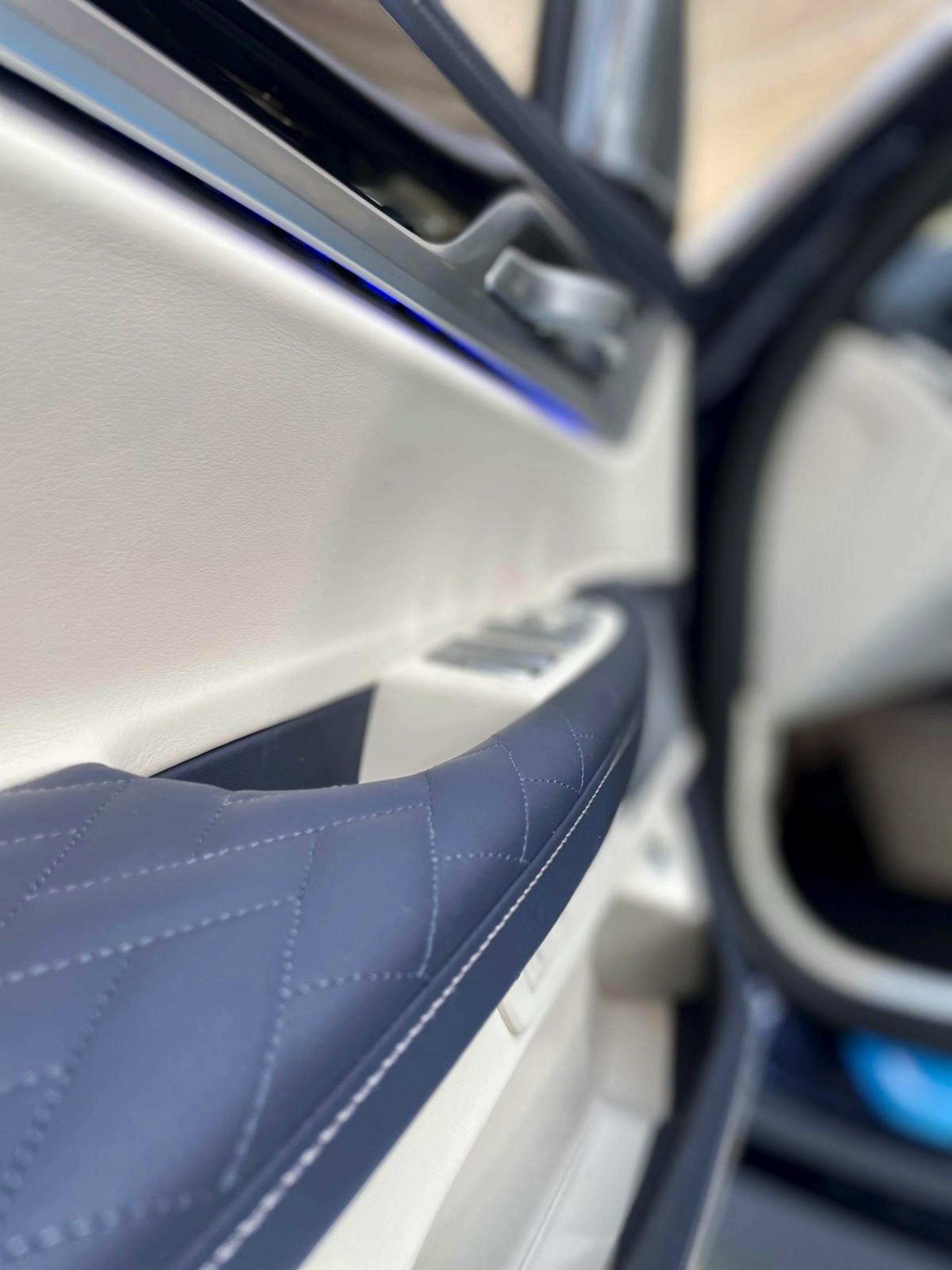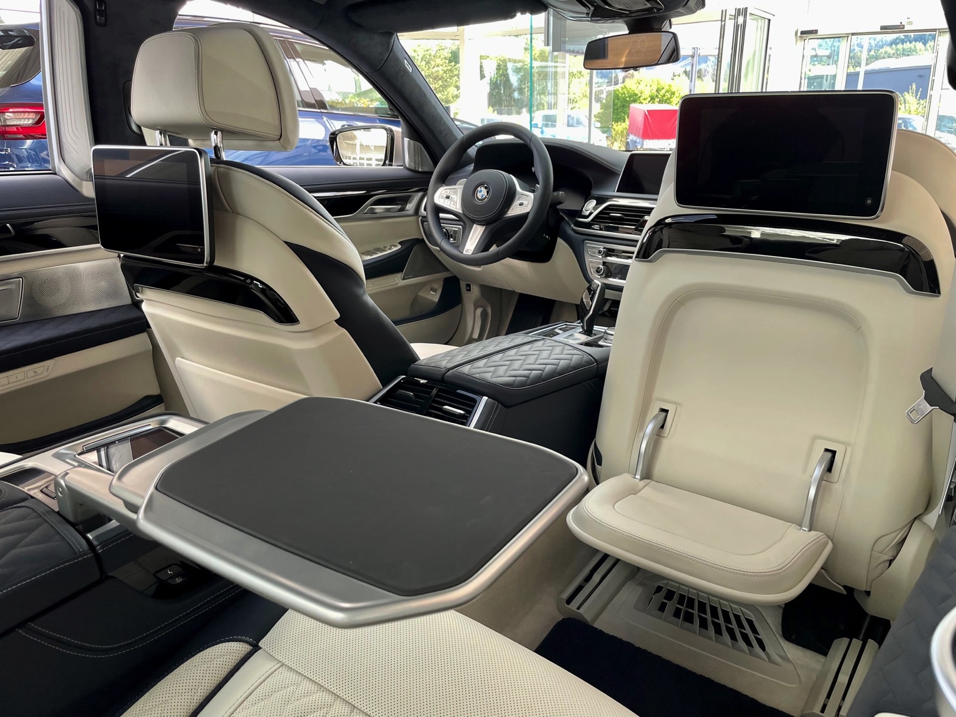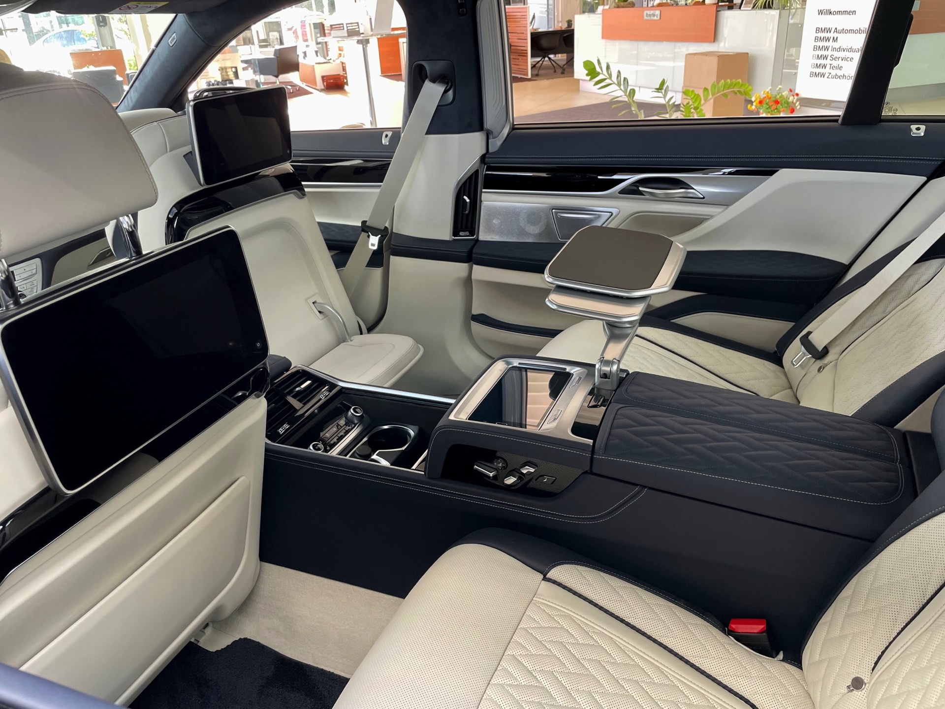 Auf das zweifarbige Exterieur abgestimmt präsentiert sich auch das Interieur: Genau wie außen gibt es auch innen eine edle Kombination von dunklem Nachtblau und hellem Rauchweiß, sodass sich ein überaus stimmiges Gesamtbild ergibt. Die Volllederausstattung von BMW Individual wird mit einem Alcantara-Dachhimmel kombiniert. Wie groß der Schritt zur nächsten Generation ist, zeigt sich beim Blick in den Fond: Feinste Materialien hin oder her, das “alte” Fond Entertainment Professional spielt doch unstrittig in einer anderen Liga als der neue Theatre Screen, der den Fond-Passagen auf 31 Zoll ein Kino-Erlebnis an Bord des Fahrzeugs erlaubt.