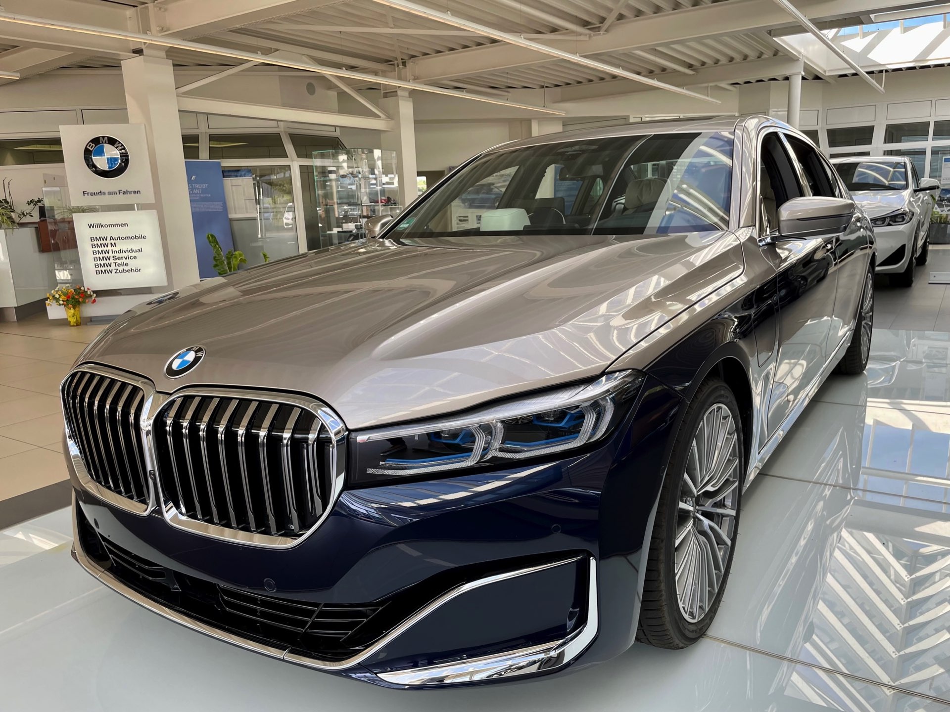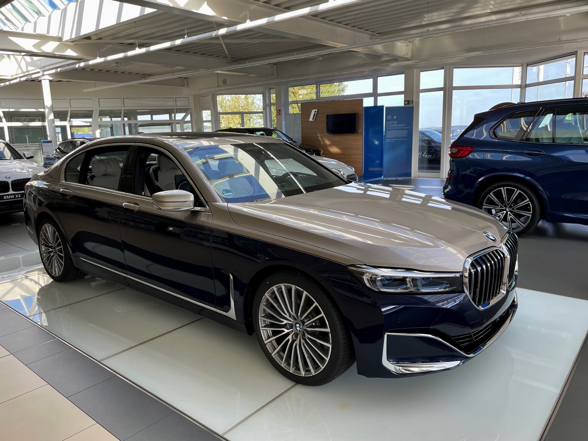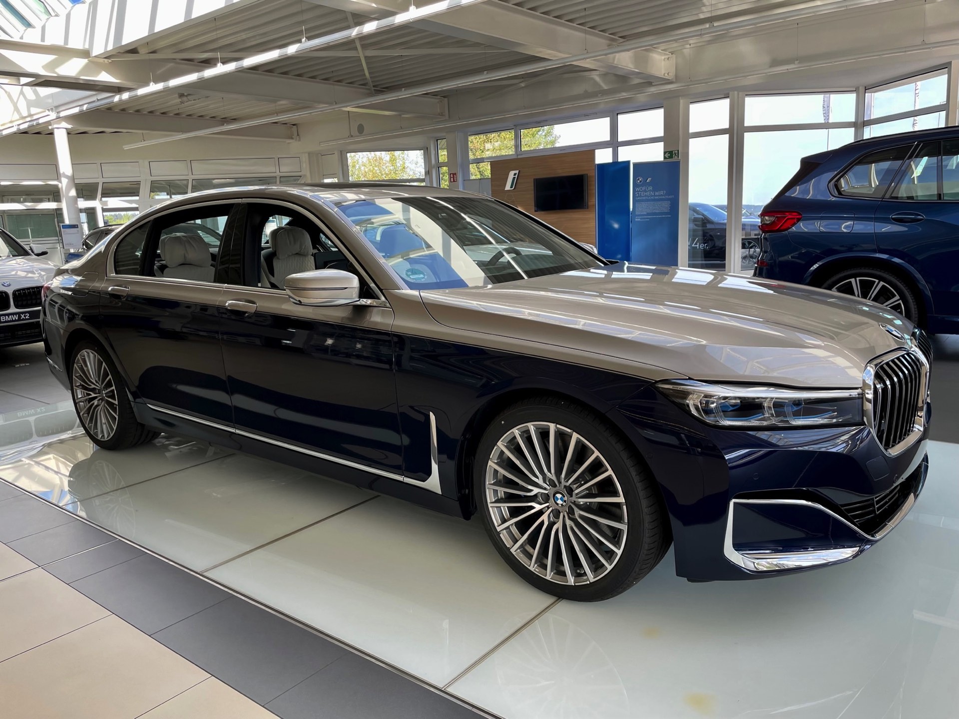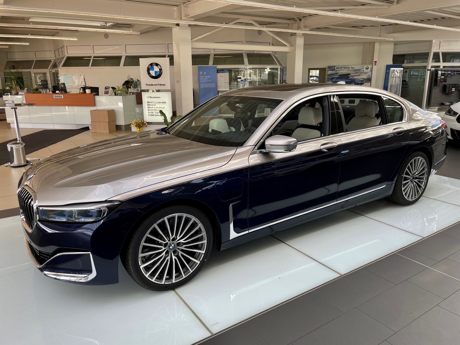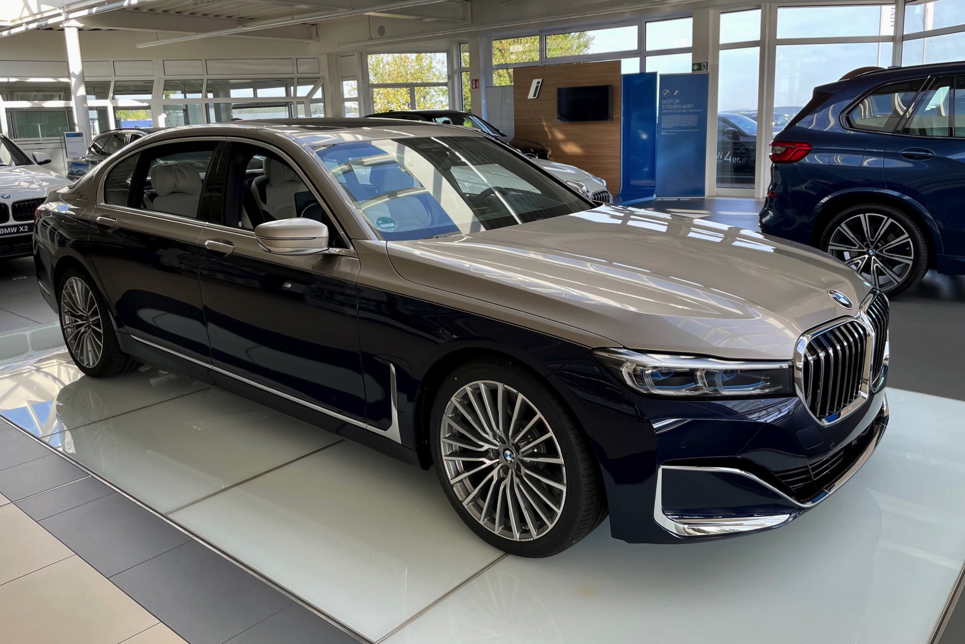 Dass es noch mindestens eine weitere Kombination gab, zeigt ein Fahrzeug im Showroom der Autohaus Matthes Gruppe am Standort Suhl: Aktuelle Fotos zeigen den “alten” BMW 7er (G12 LCI) mit Two-Tone-Lackierung in Tansanitblau und Kaschmirsilber. Beim Anblick der auf 20 Zoll großen Vielspeichen-Felgen stehenden Luxuslimousine mit ihrer seit dem Facelift extrem präsenten Niere dürften nur die wenigsten Betrachter an ein bereits abgelöstes Modell denken, was natürlich auch an den stattlichen Dimensionen des Fahrzeugs liegt: In der Langversion streckt sich der 7er auf 5,26 Meter. Dass der bald seinen Marktstart feiernde Nachfolger mit mindestens 5,39 Meter noch ein gutes Stück länger ist, unterstreicht den inzwischen nochmals gestiegenen Anspruch der 7er-Reihe deutlich. "