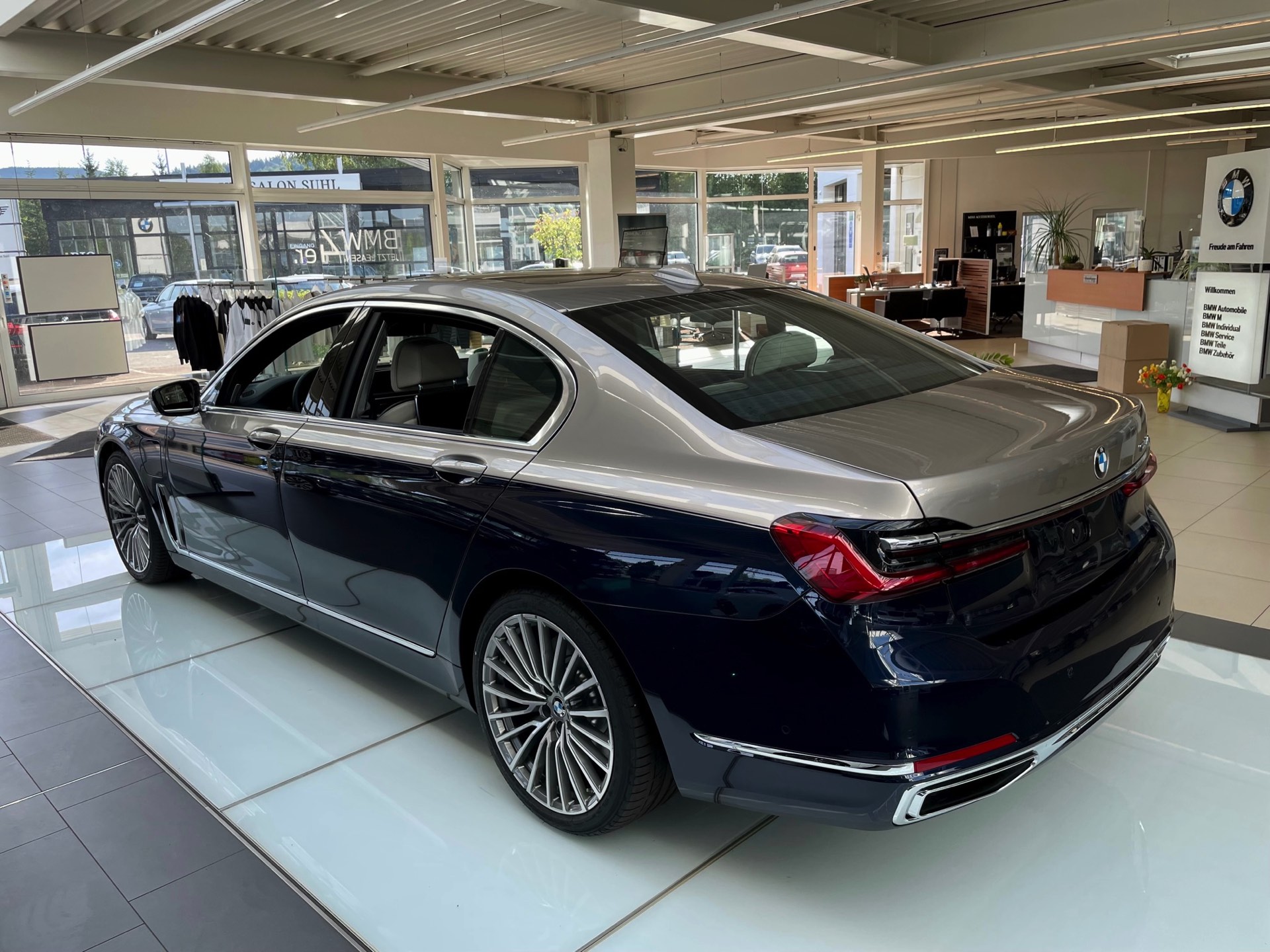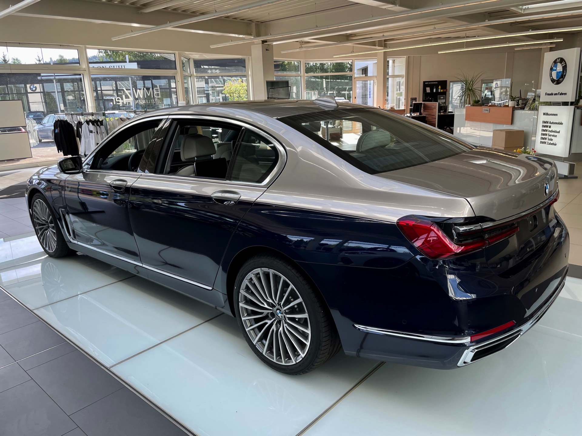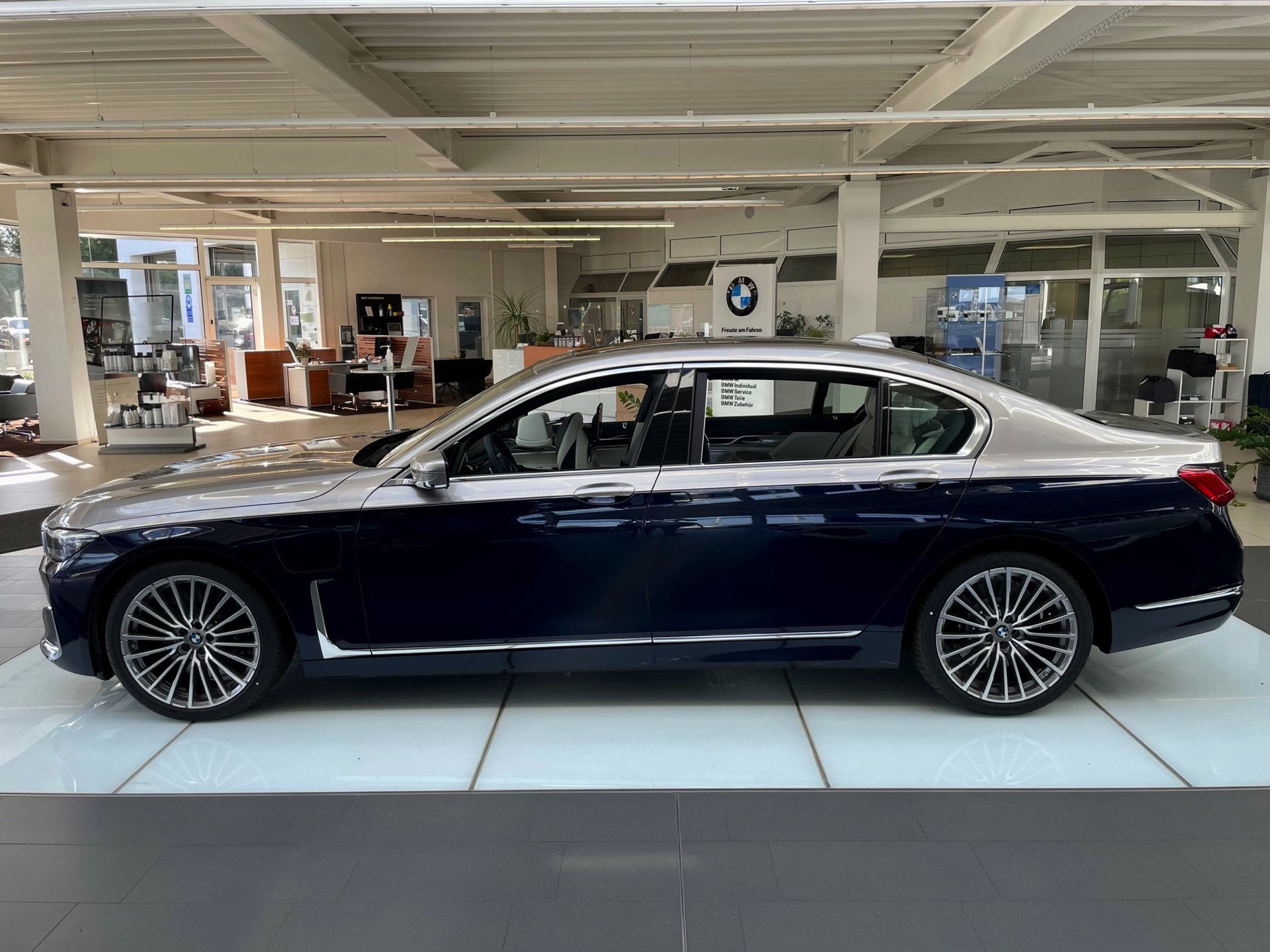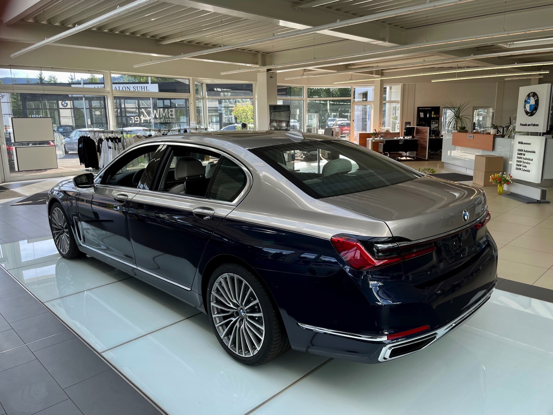 Dass es noch mindestens eine weitere Kombination gab, zeigt ein Fahrzeug im Showroom der Autohaus Matthes Gruppe am Standort Suhl: Aktuelle Fotos zeigen den “alten” BMW 7er (G12 LCI) mit Two-Tone-Lackierung in Tansanitblau und Kaschmirsilber. Beim Anblick der auf 20 Zoll großen Vielspeichen-Felgen stehenden Luxuslimousine mit ihrer seit dem Facelift extrem präsenten Niere dürften nur die wenigsten Betrachter an ein bereits abgelöstes Modell denken, was natürlich auch an den stattlichen Dimensionen des Fahrzeugs liegt: In der Langversion streckt sich der 7er auf 5,26 Meter. Dass der bald seinen Marktstart feiernde Nachfolger mit mindestens 5,39 Meter noch ein gutes Stück länger ist, unterstreicht den inzwischen nochmals gestiegenen Anspruch der 7er-Reihe deutlich. "